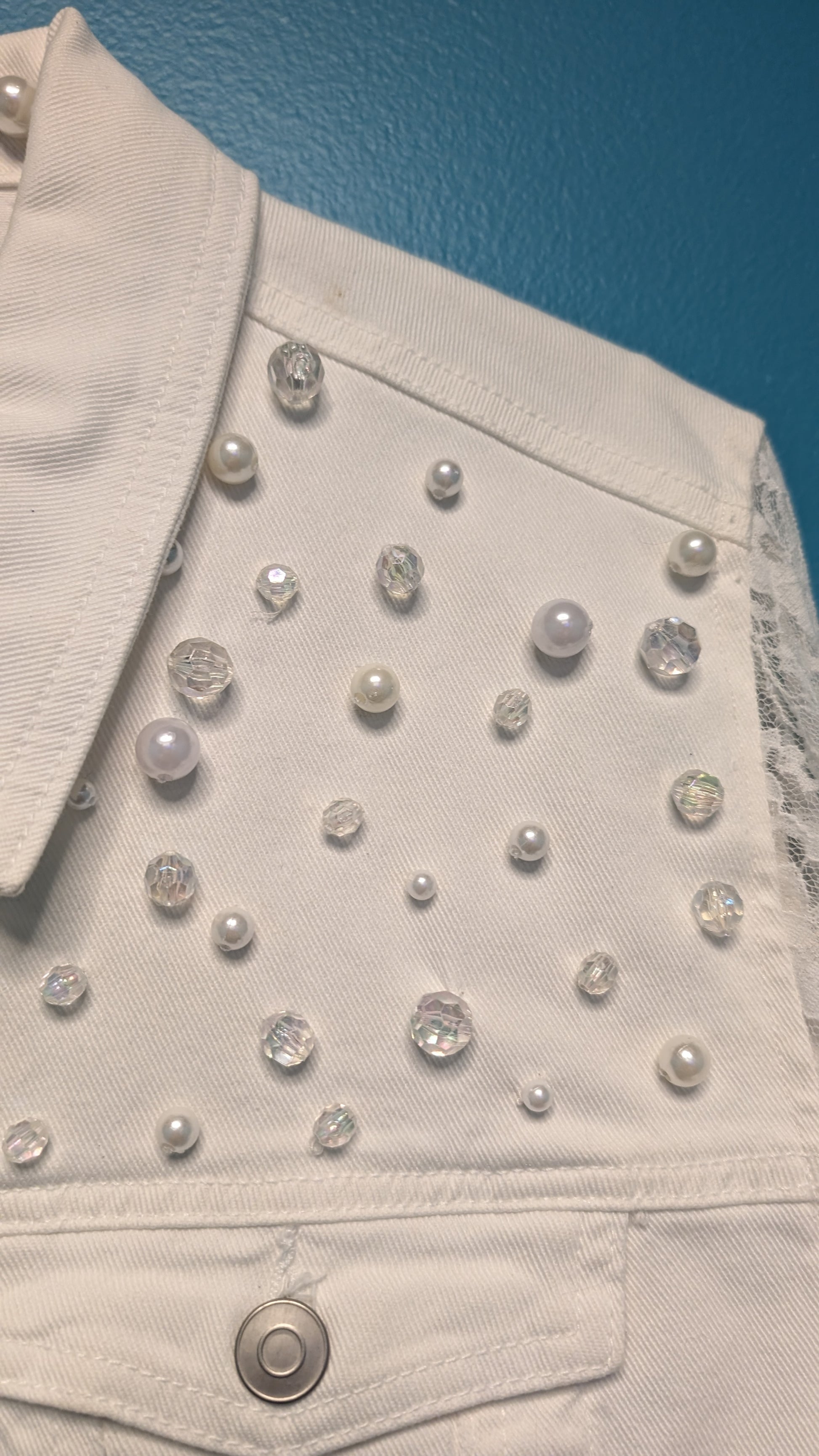 Style - Custom Hand stitched one of a kind denim jacket with pearl hanger