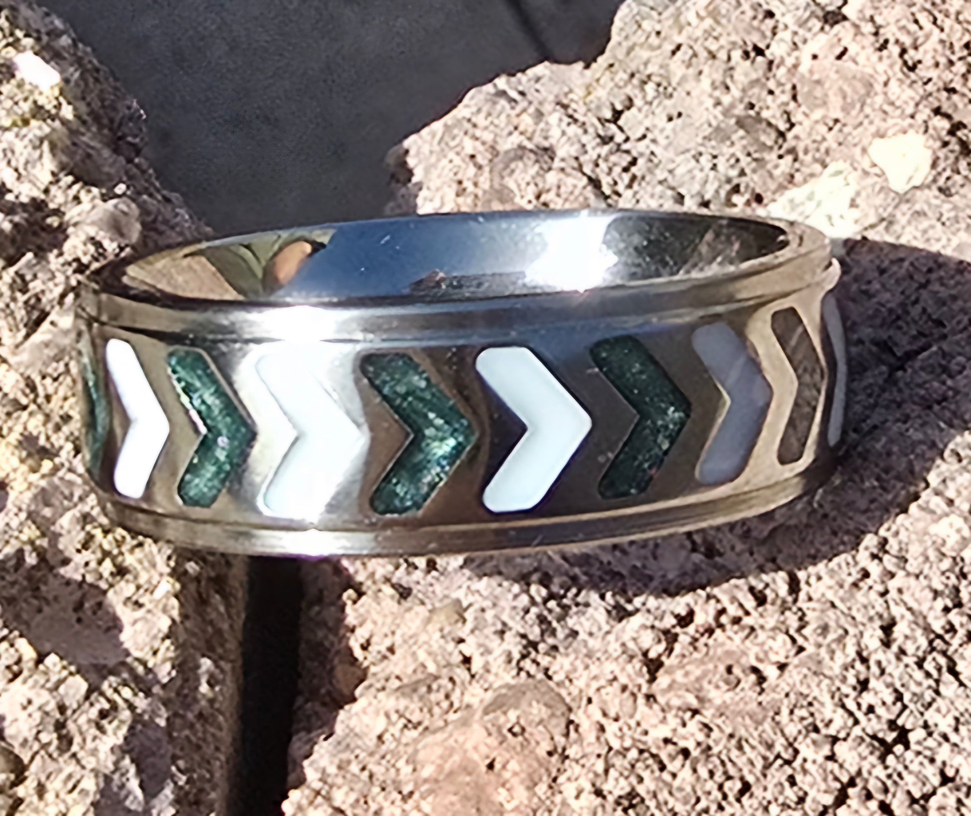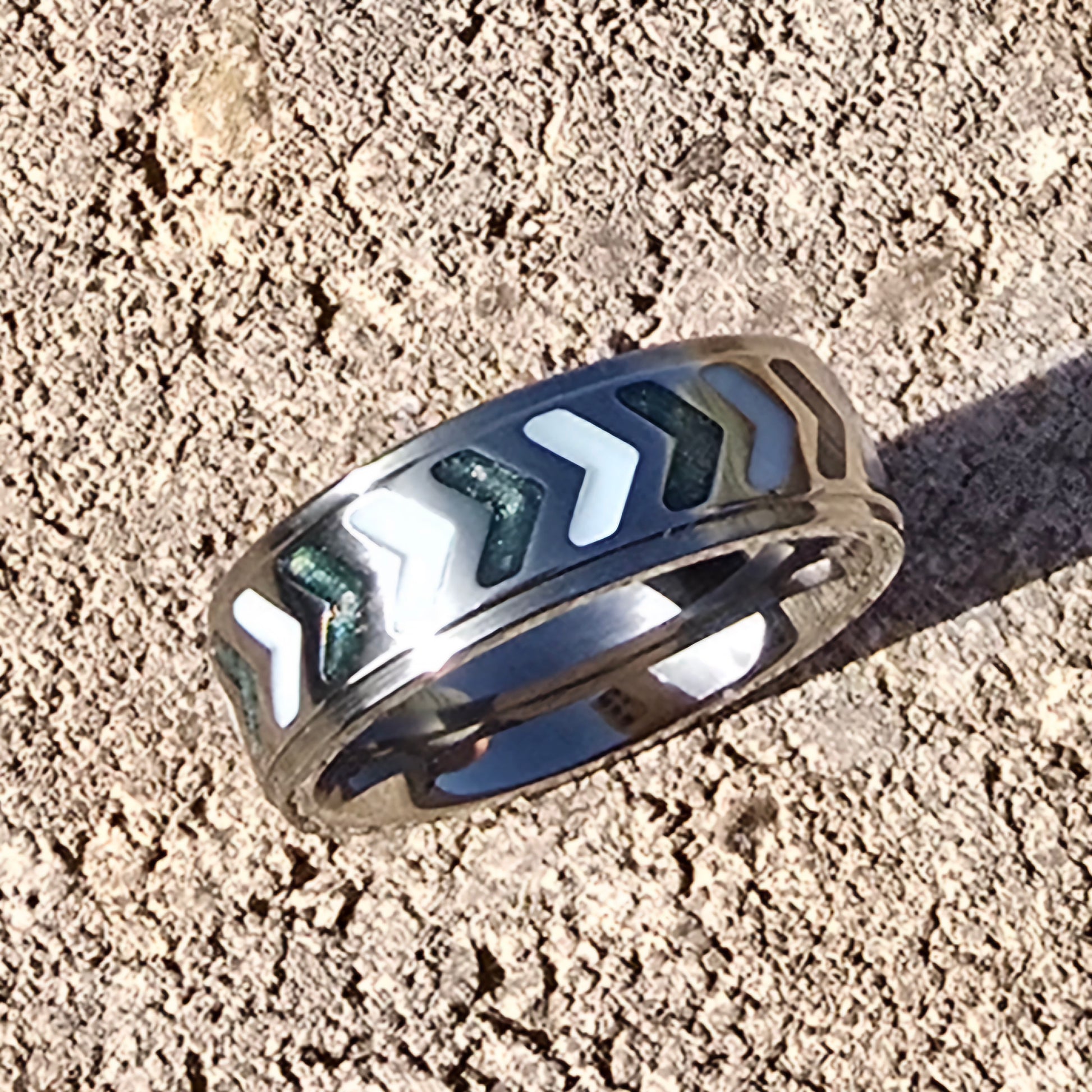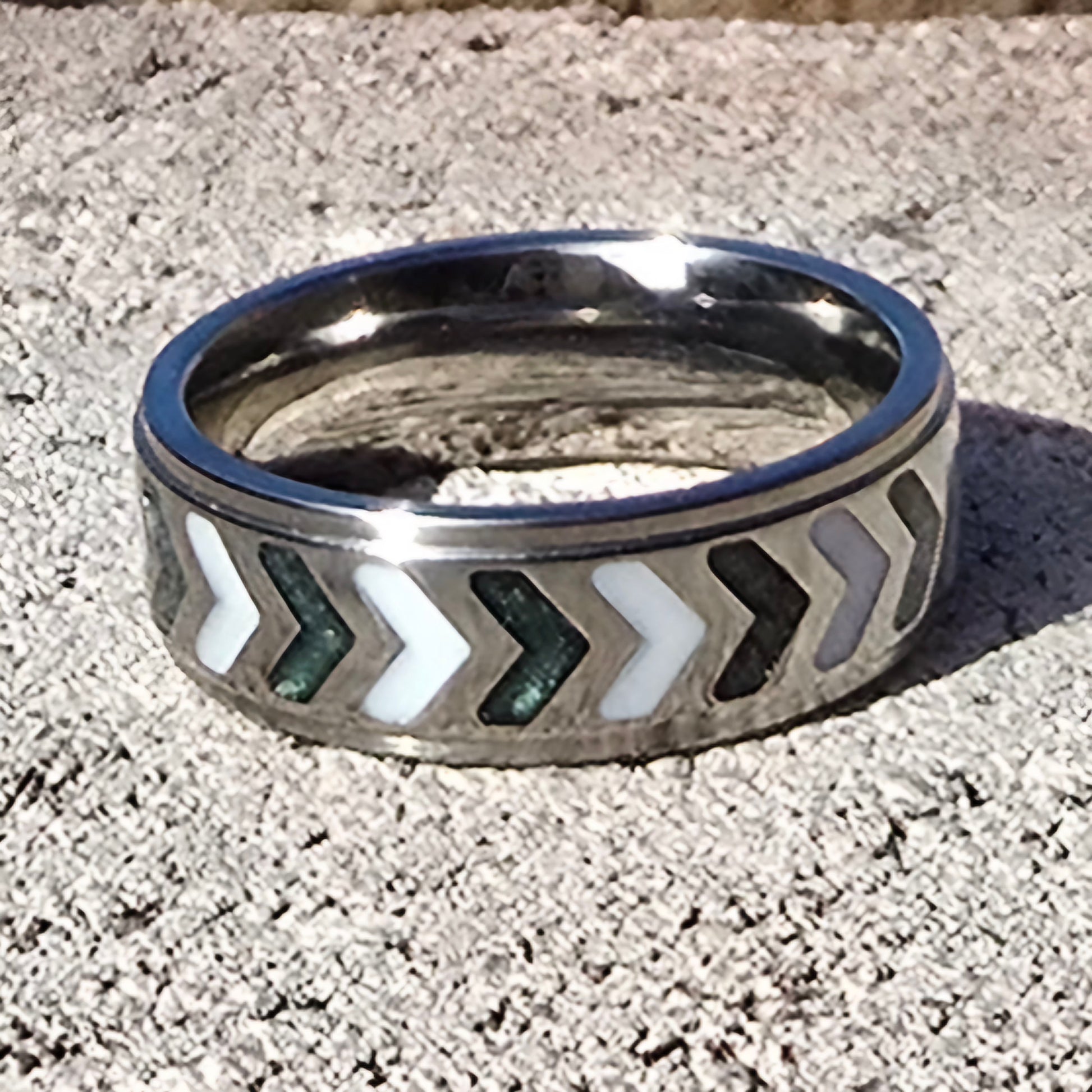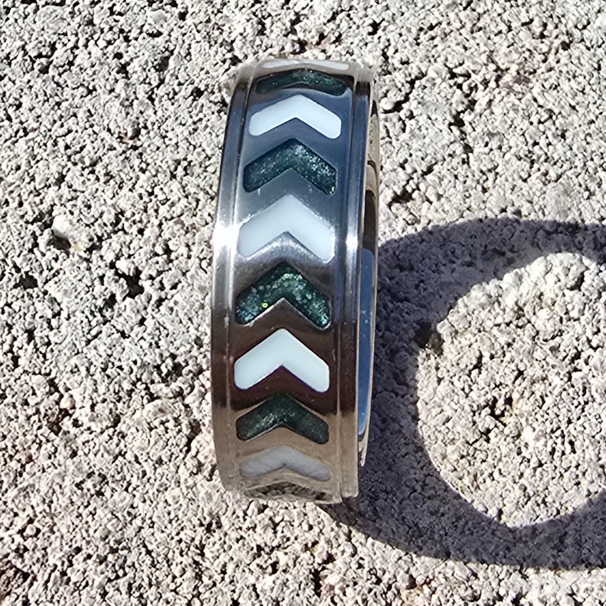 Titanium arrows design, inlayed with midnight green mica and white resin, size 12