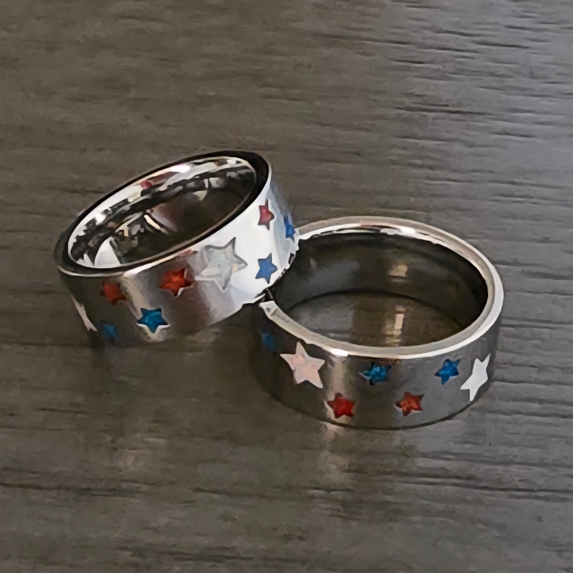 8mm stainless steel, star design, inlaid with red, white and blue fire opals, size 10