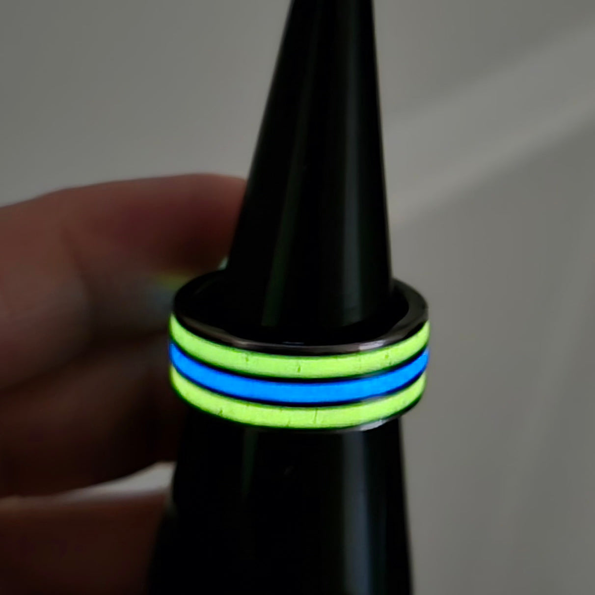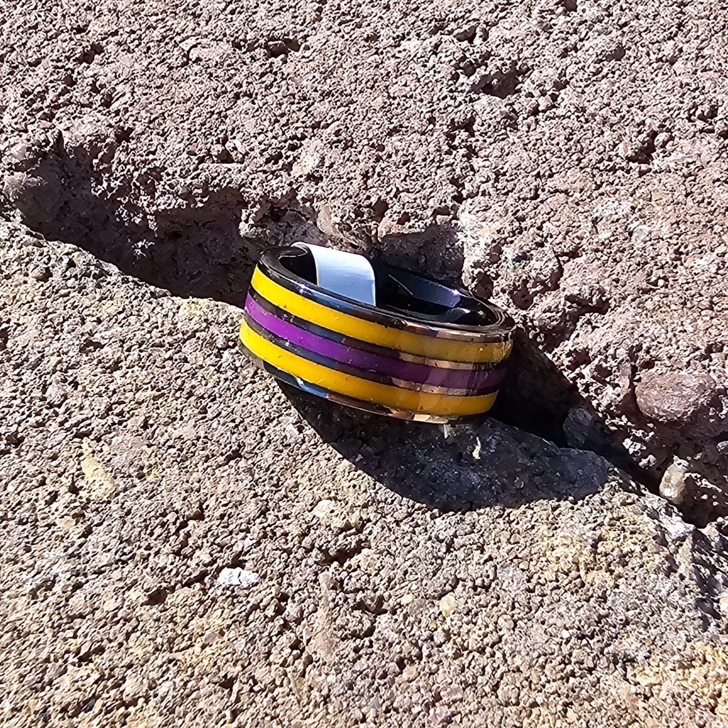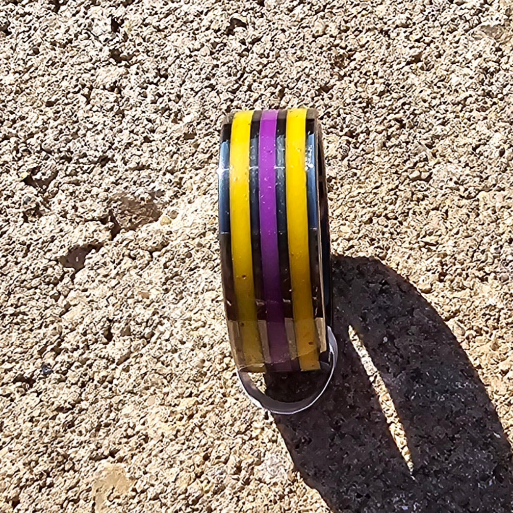 3 channel Tungsten, inlayed with orange to yellow glow and purple to blue glow, size 8