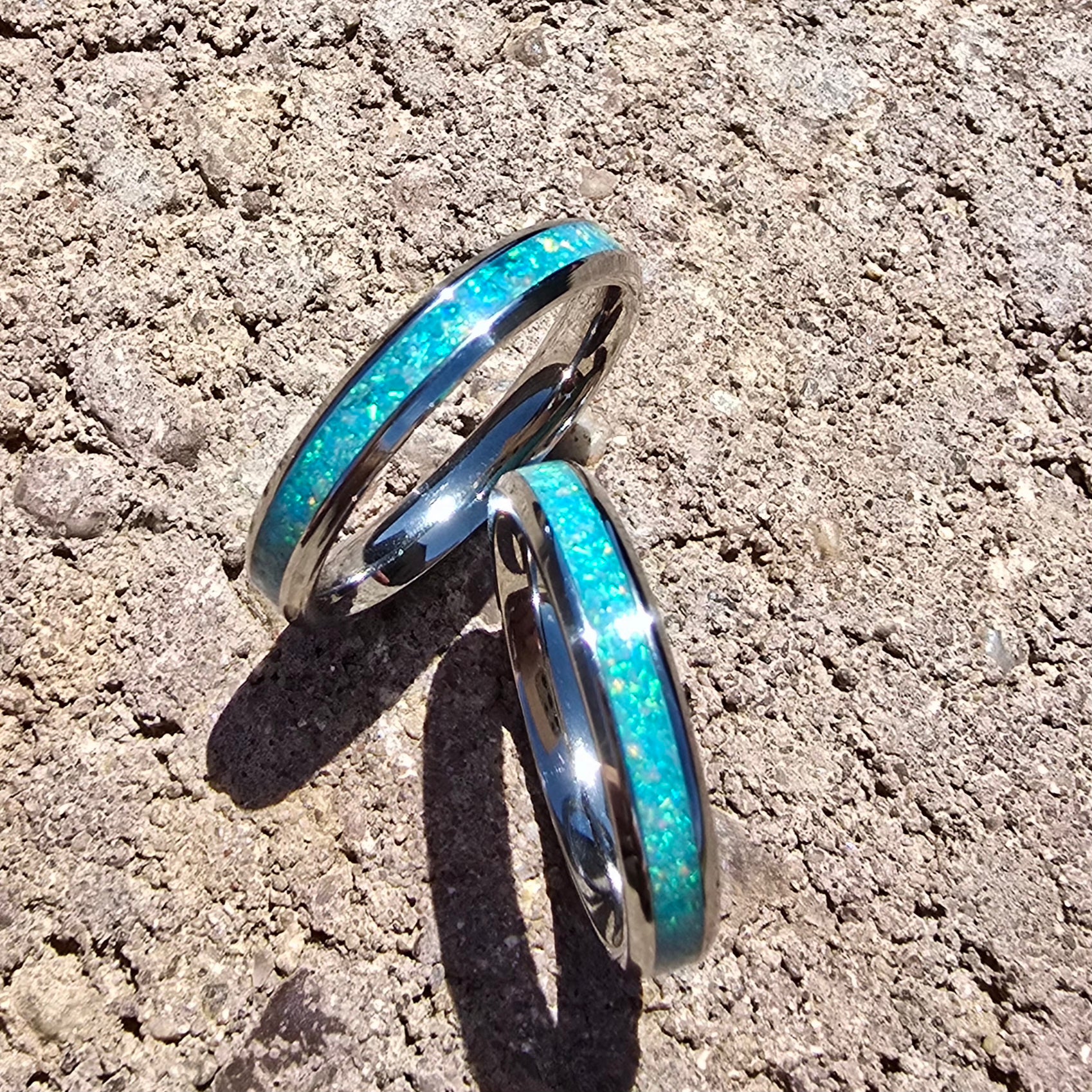 4mm stainless steel, inlaid with sea green and sea blue fire opals, size 10.5