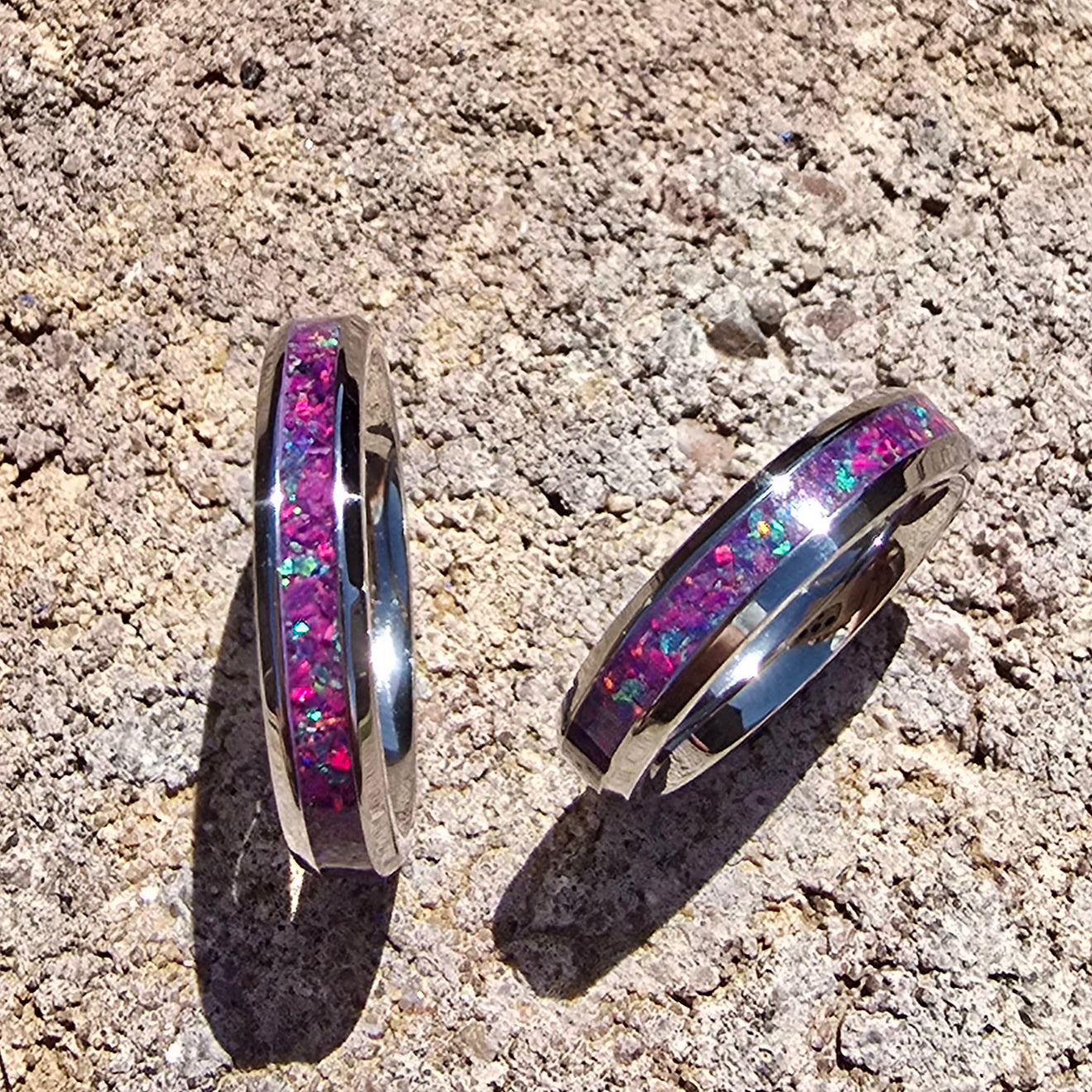 4mm stainless steel, inlaid with purple and peacock fire opals, size 7.5