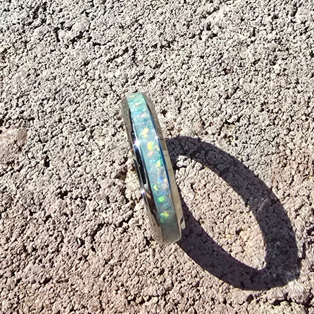 4mm stainless steel, inlaid with white and sea green fire opals, size 4.5