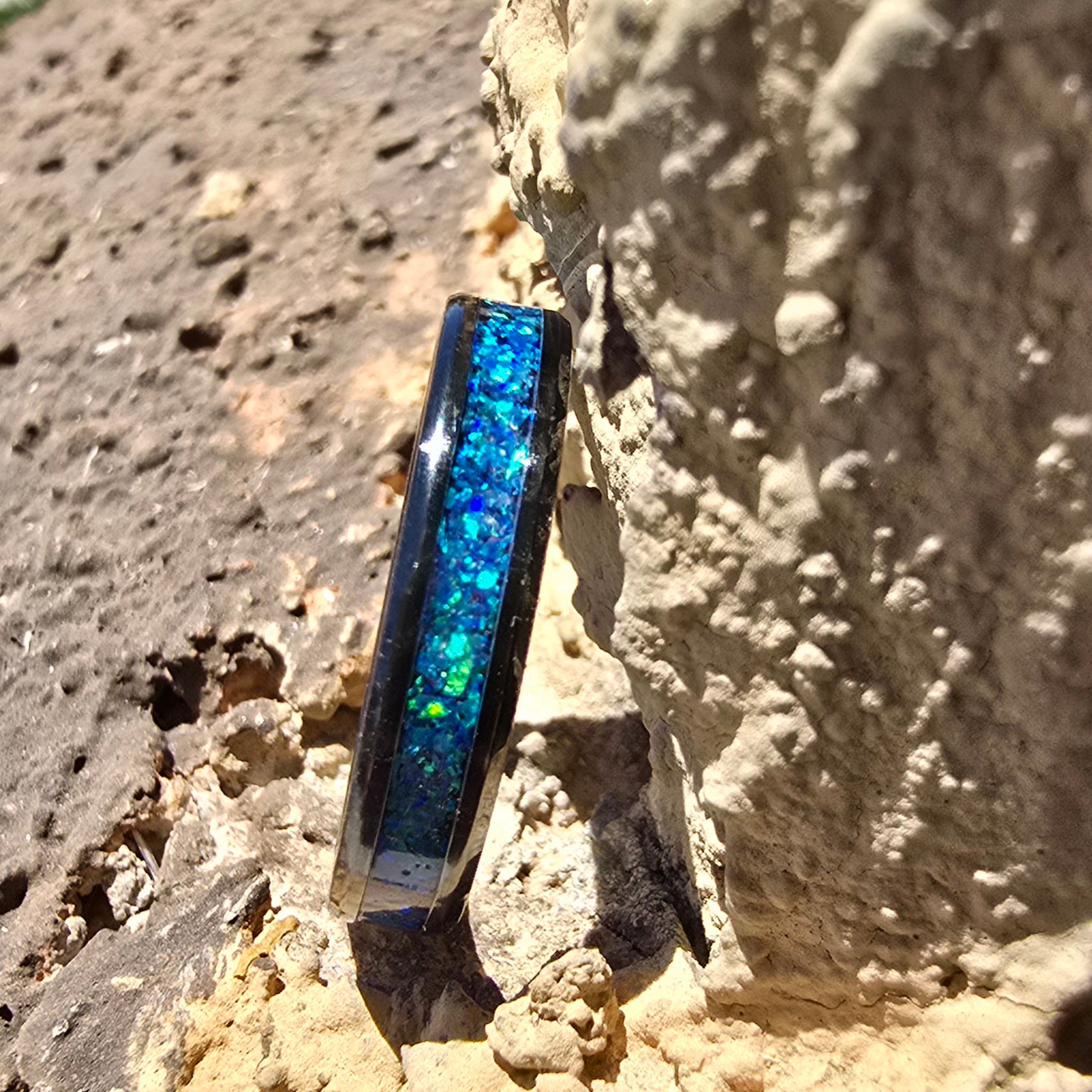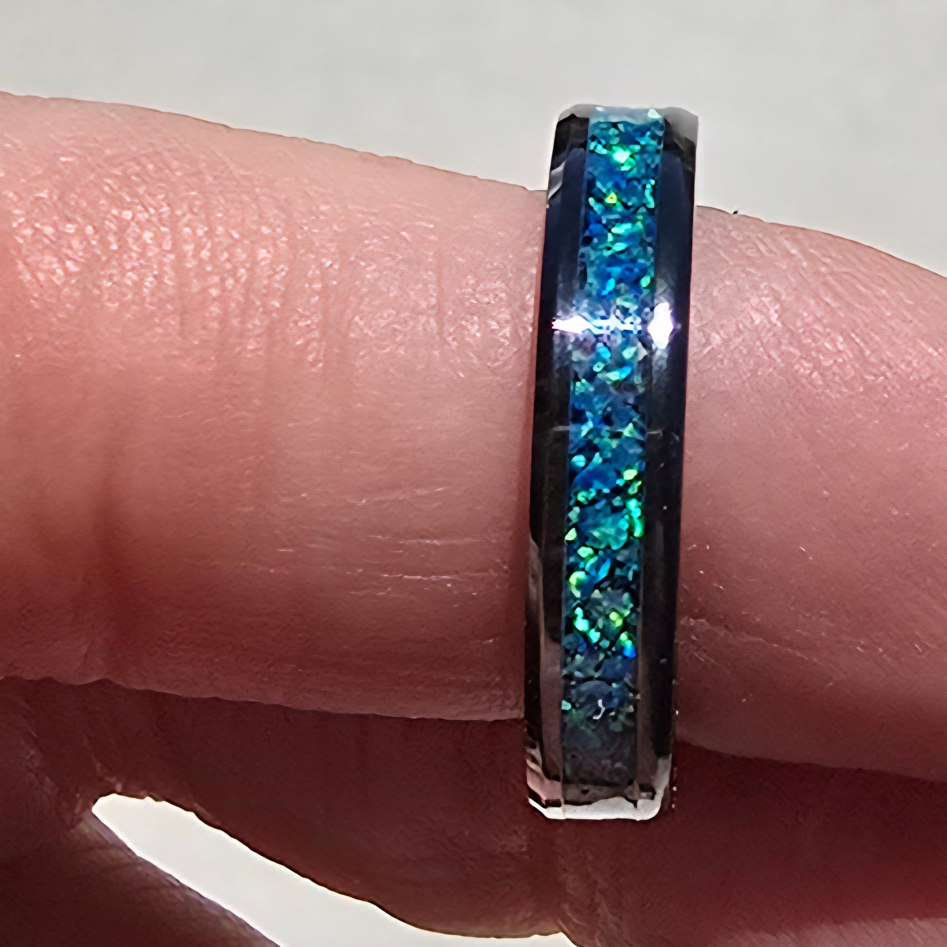 4mm black ceramic, inlaid with peacock and sapphire opals, size 6