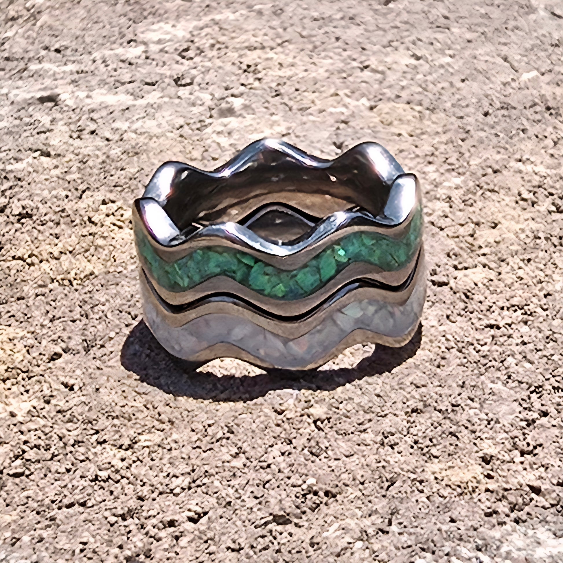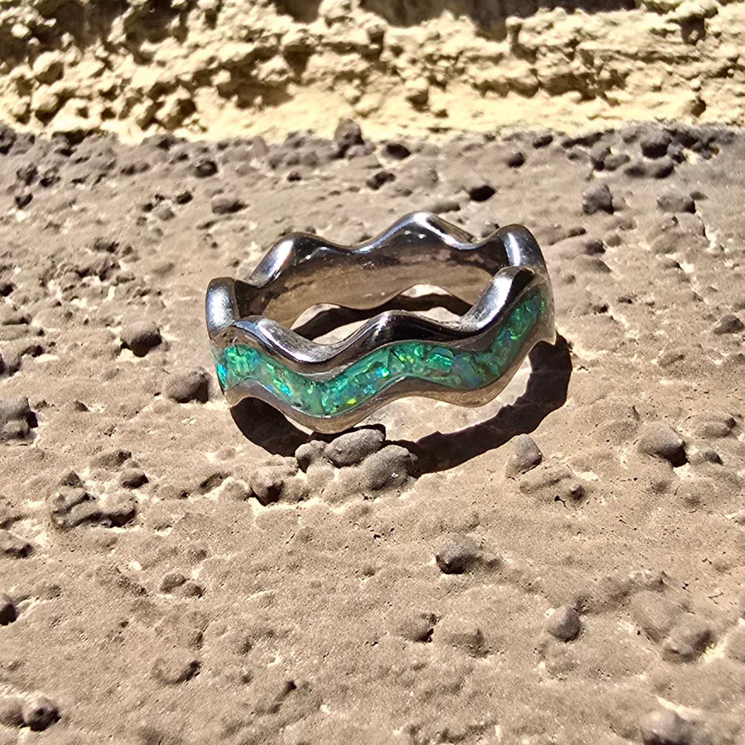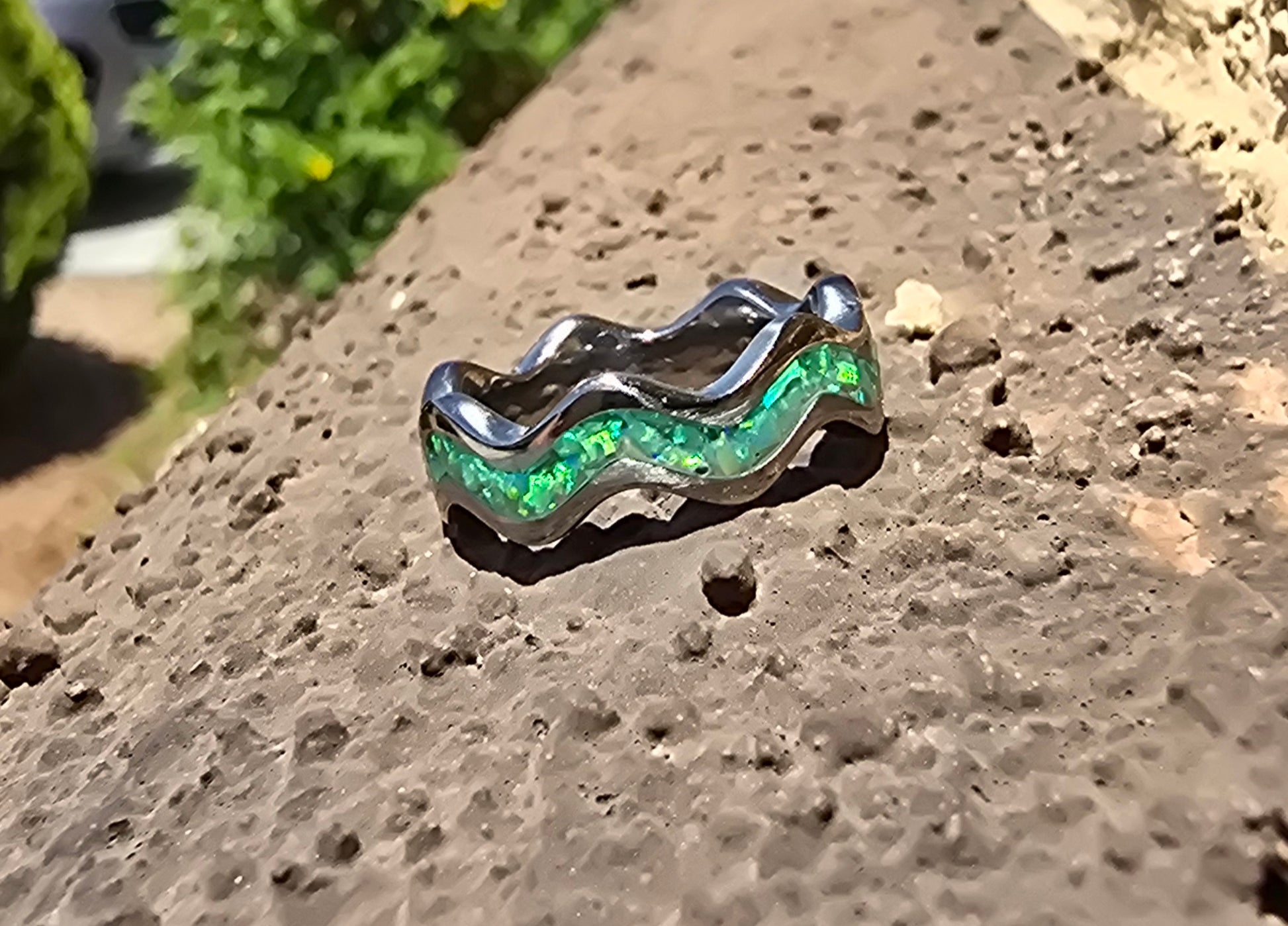 Titanium clamshell design, inlaid with kiwi opals, size 6