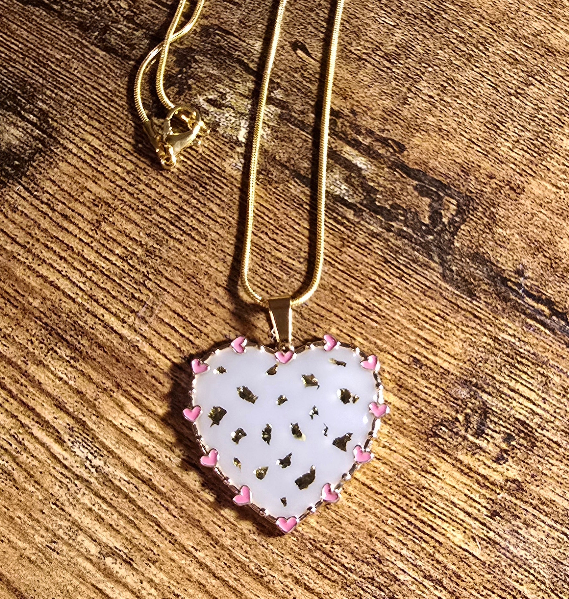 Gold finished stainless steel chain, gold finished heart shaped pendant, accented with tiny pink hearts, inlaid with white resin and gold flakes