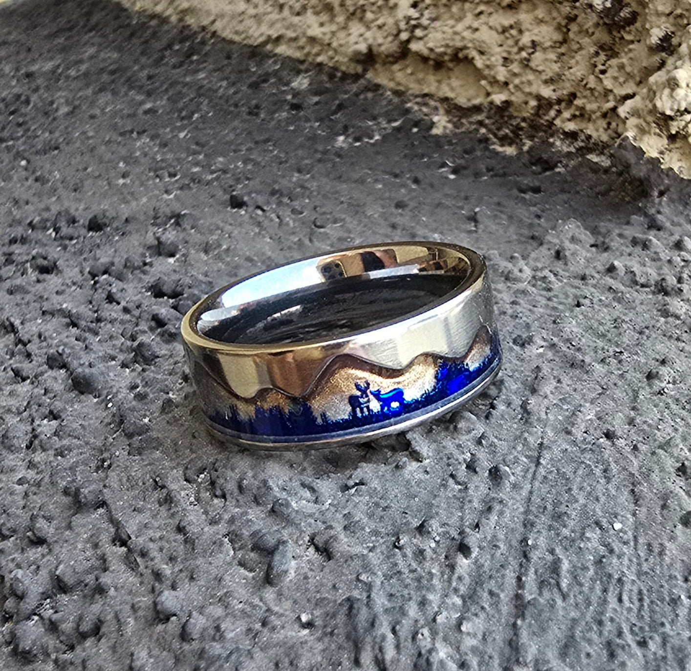 Titanium mountain design, inlaid with blue metal wildlife theme, size 10.5