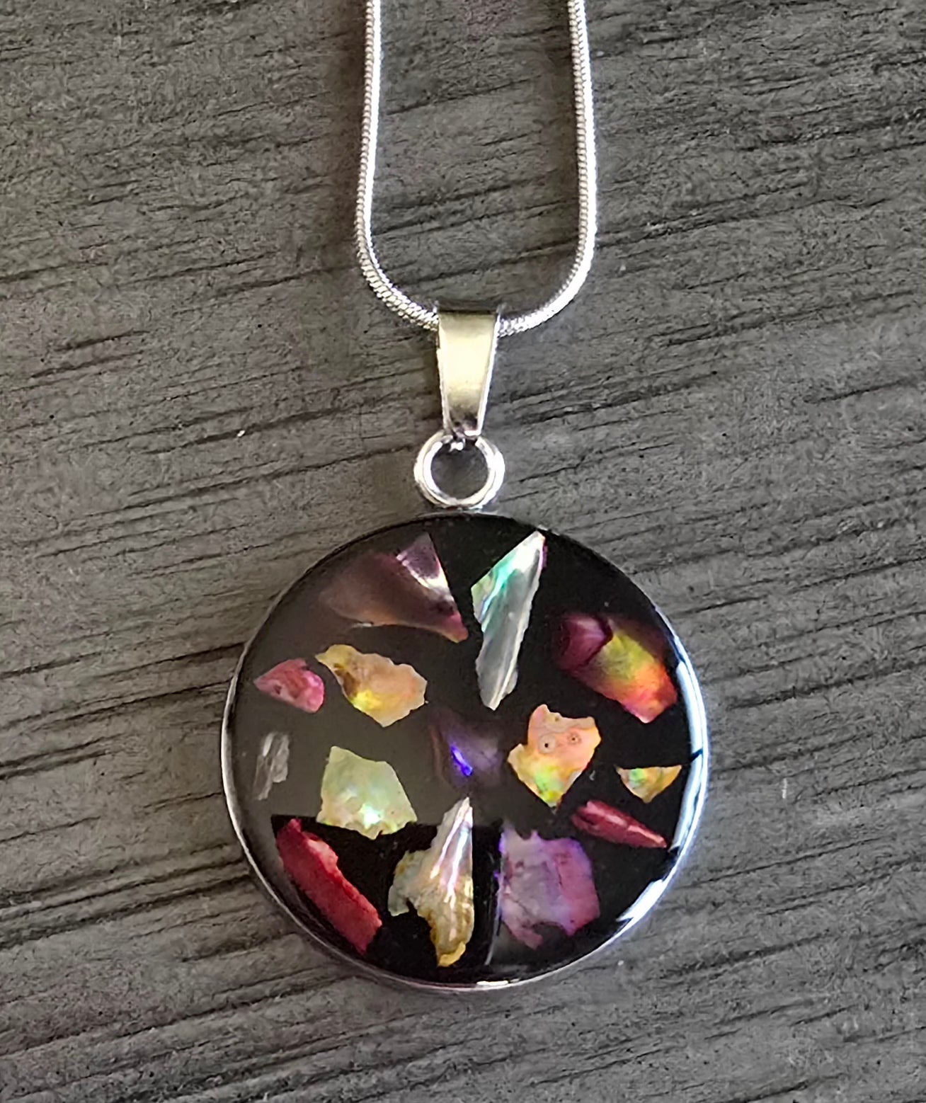 Stainless steel round pendant, stain less steel chain, black with different colors of abalone shell