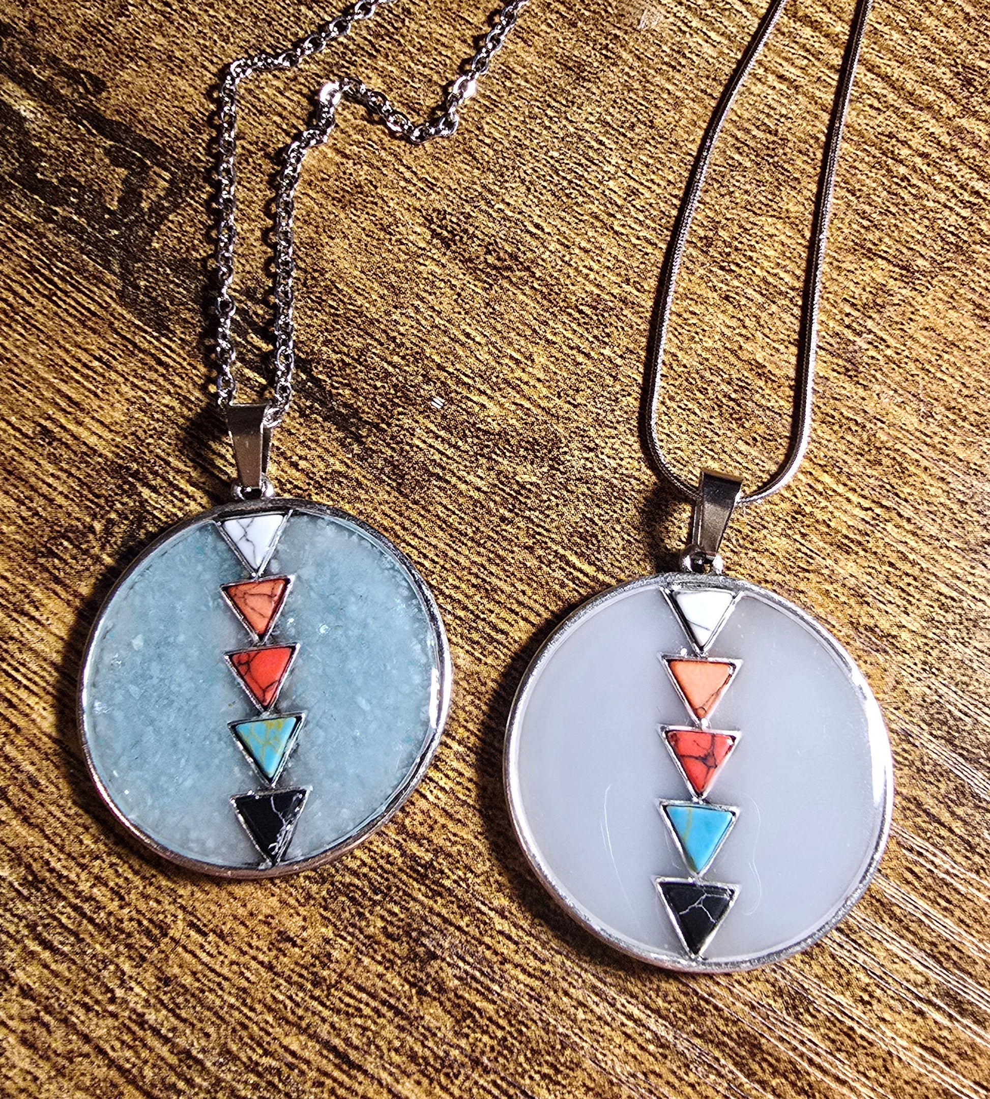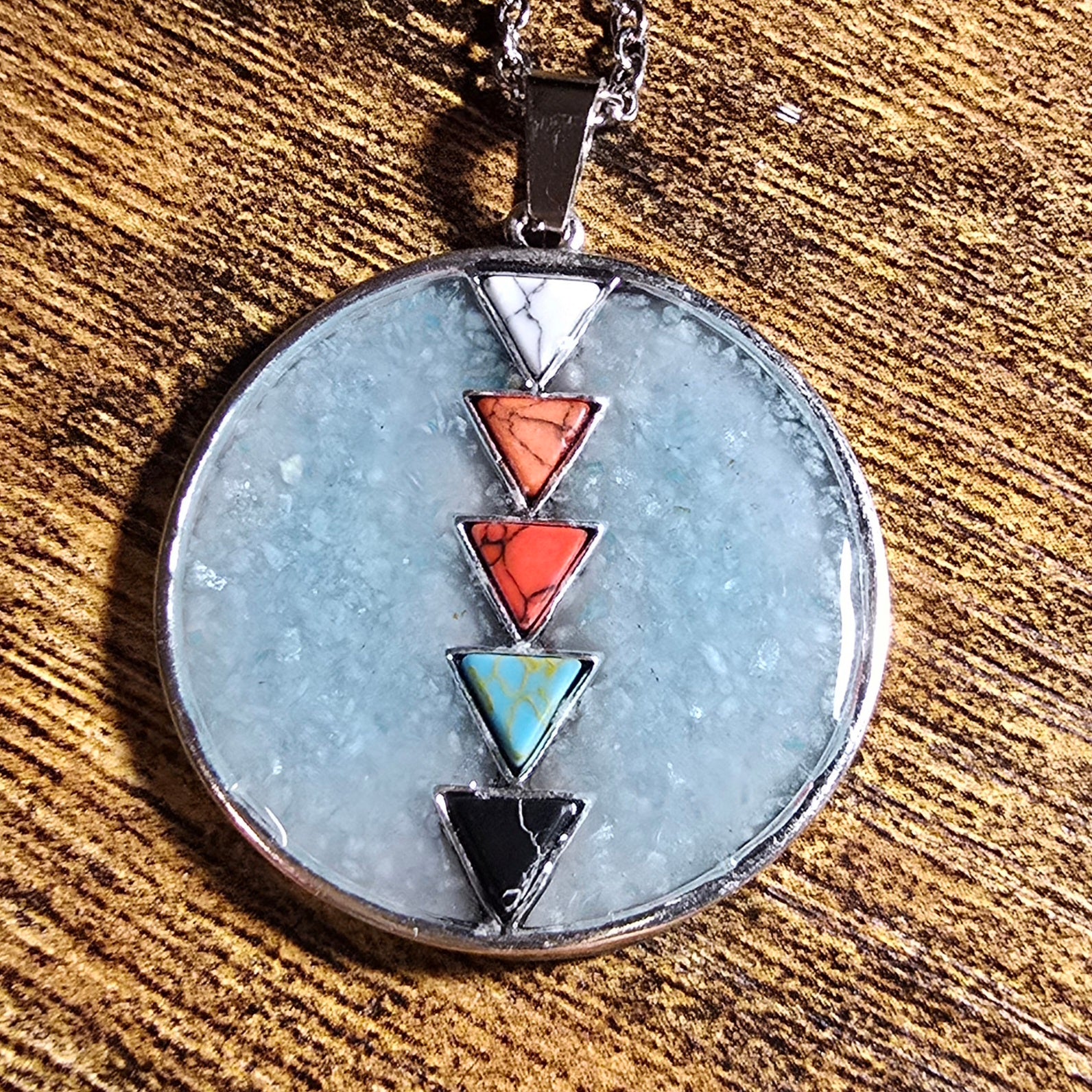 Stainless steel chain, round shaped pendant with triangle shaped stones