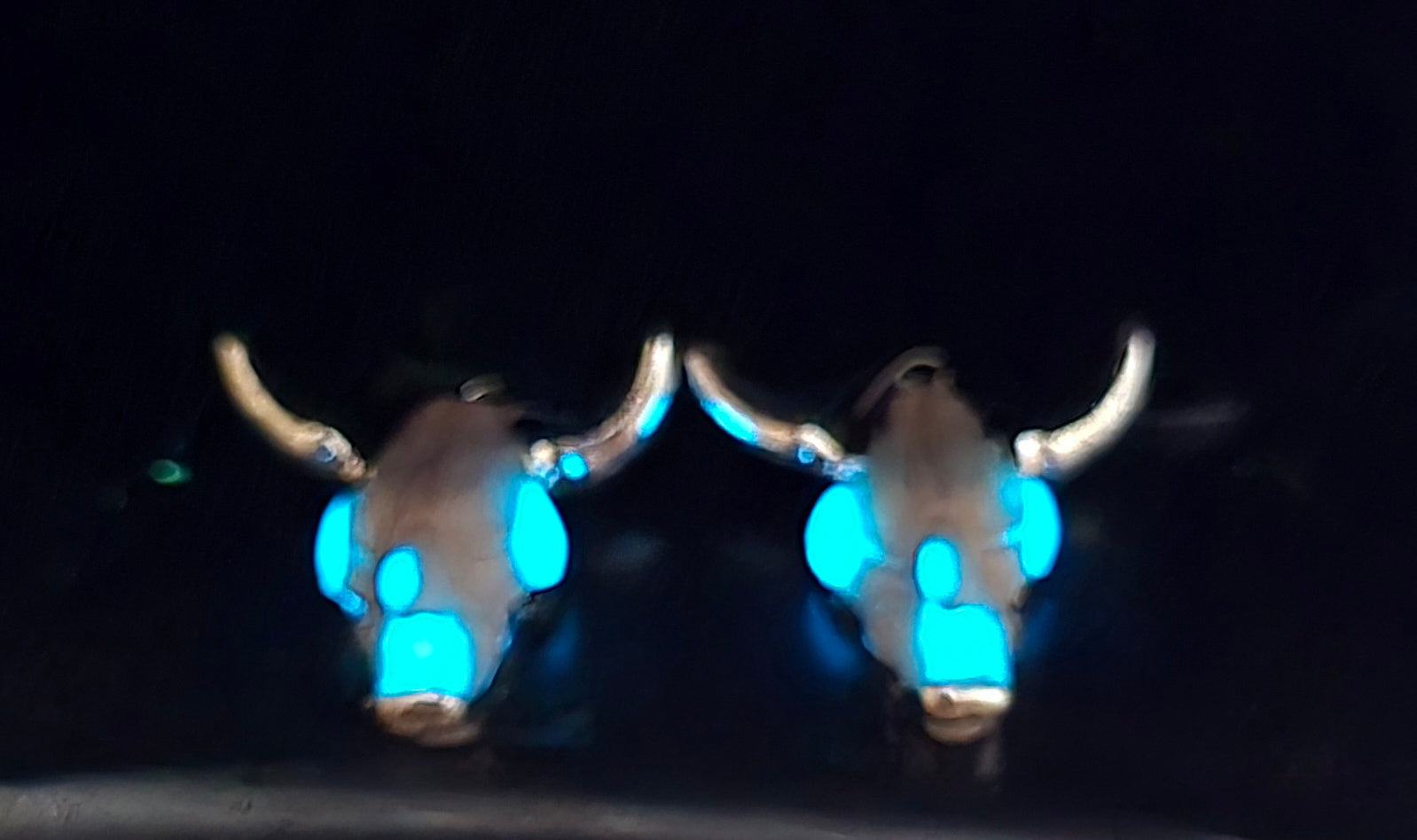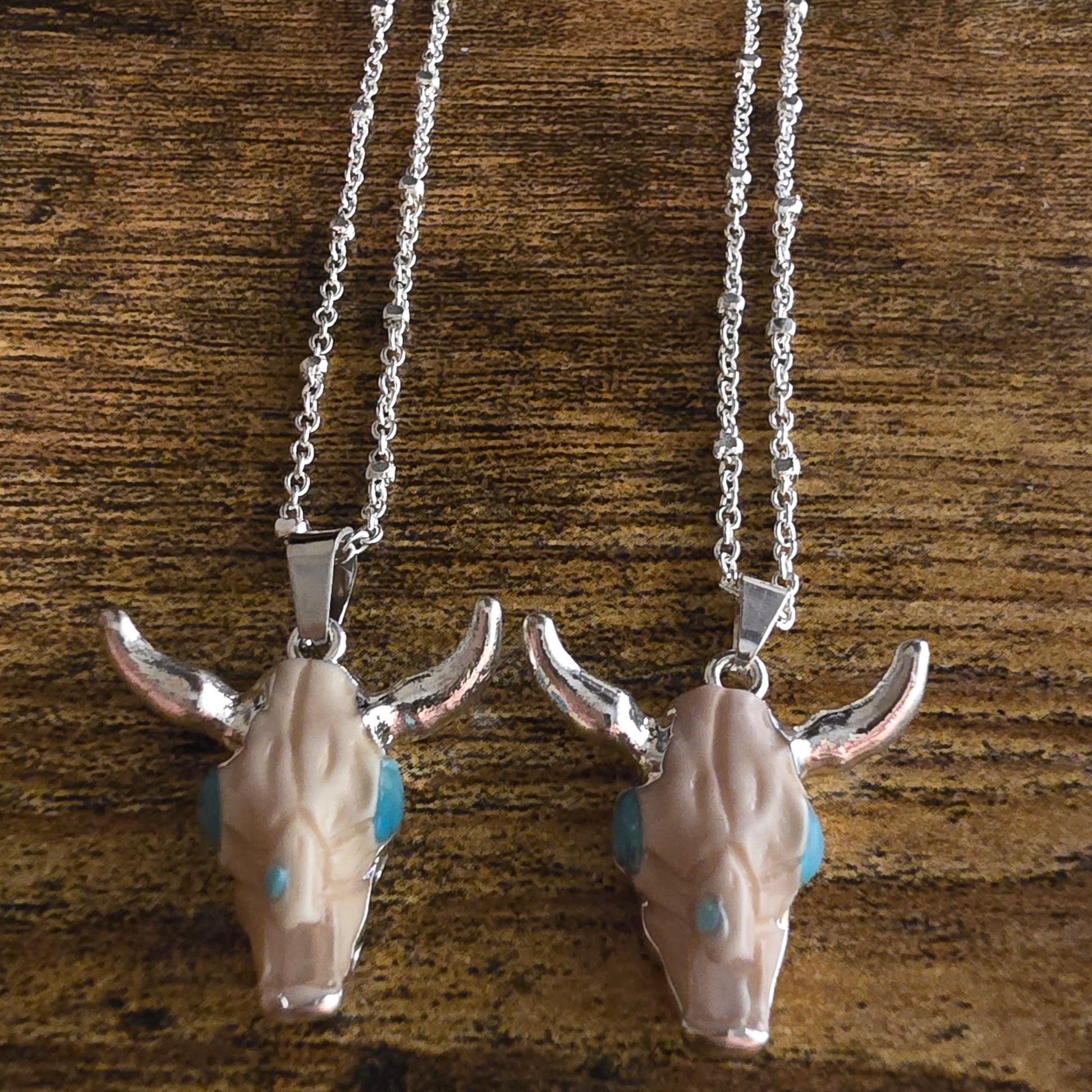 Stainless steel chain, steer skull pendant, inlaid with genuine crushed turquoise and turquoise glow