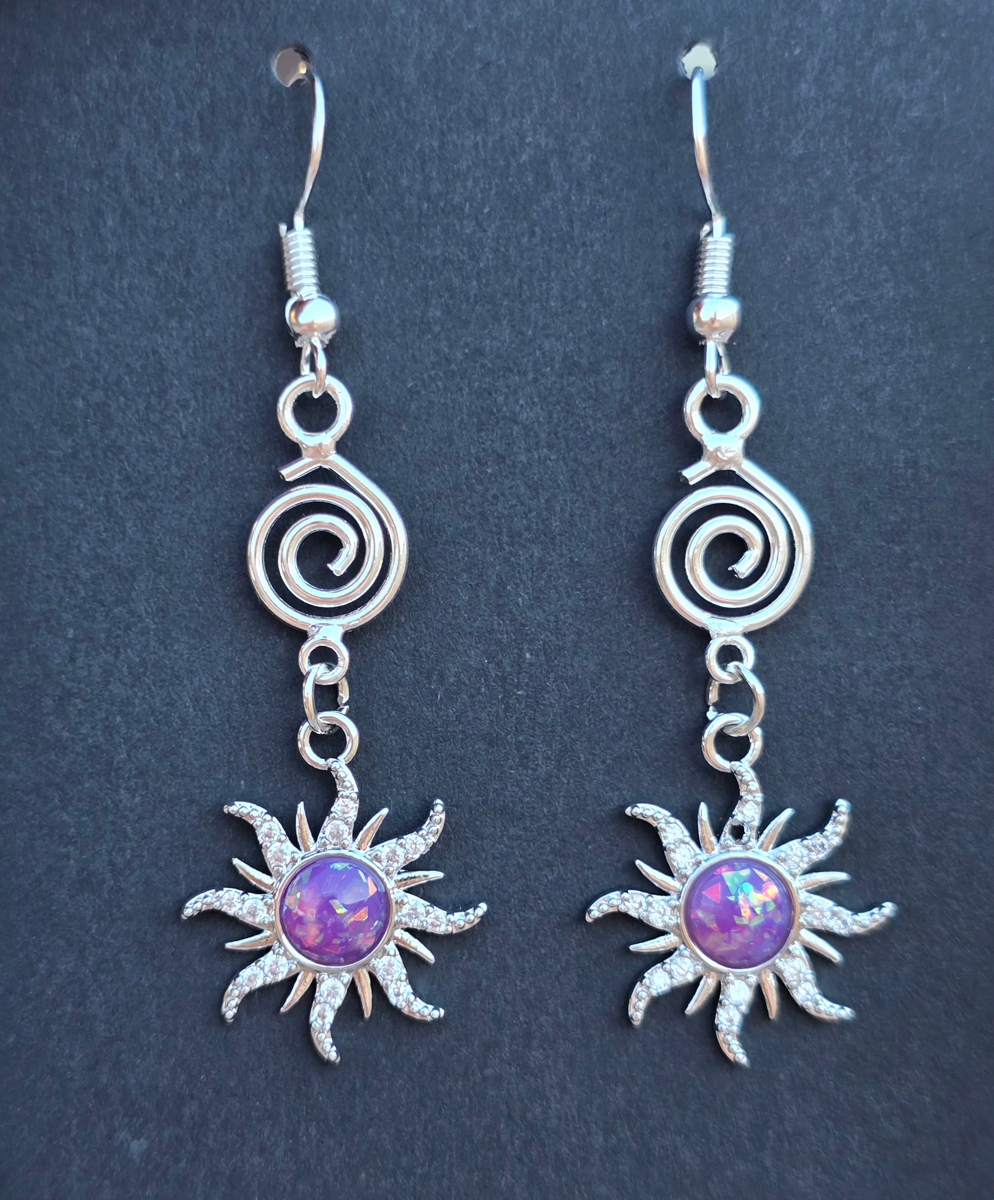 Stainless steel, nickel free, sun shaped earrings, inlaid with pink opals