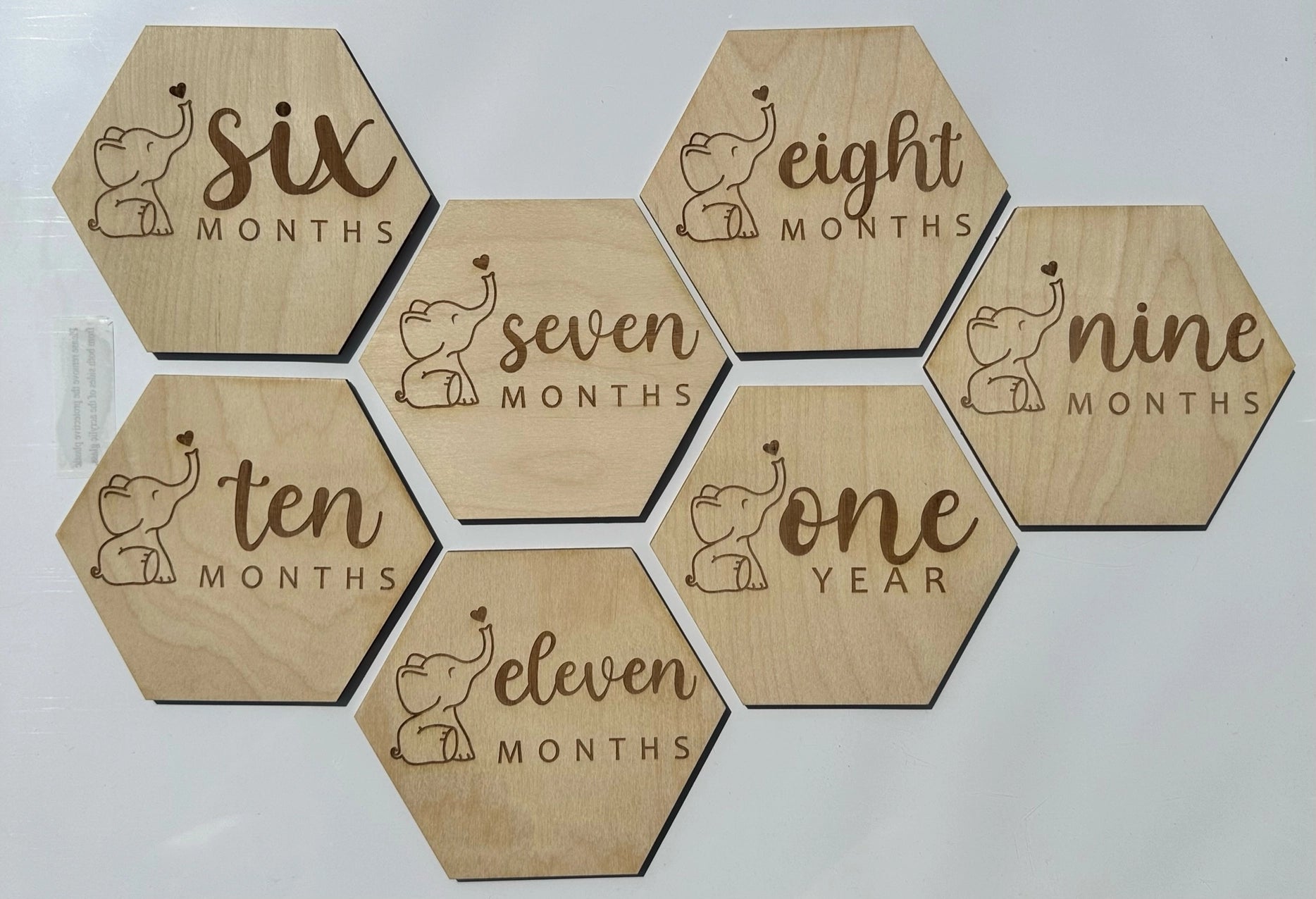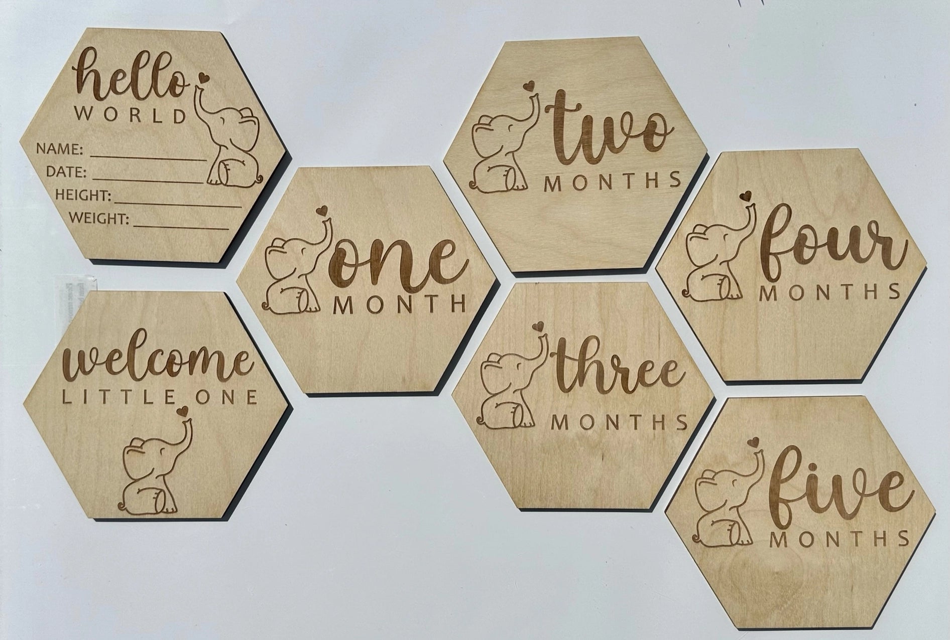 Laser Cut and Engraved Birch Hexagons! Crafted from high-quality 1/4" birch wood, these hexagons measure 5.4"x4.7" and come with a variety of charming designs, including "Hello World," "Welcome Little One," and placeholders for each month from 1 to 11, as well as Year 1. The included write-on plaque allows for personalization and customization, making it a perfect addition to any nursery or child's room. Add a touch of warmth and whimsy to your space with these adorable hexagons. Get yours today and capture those precious milestones in style!