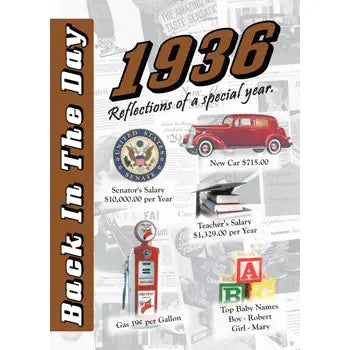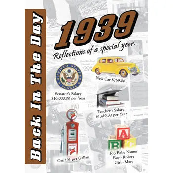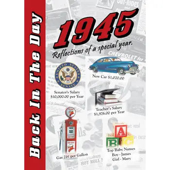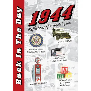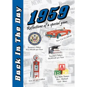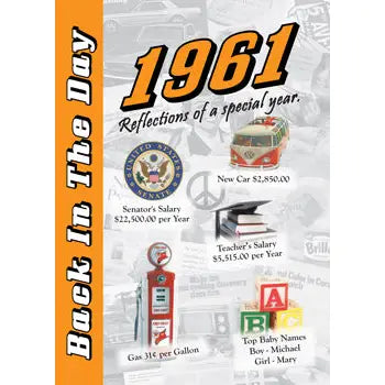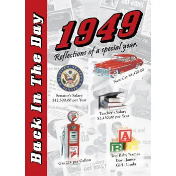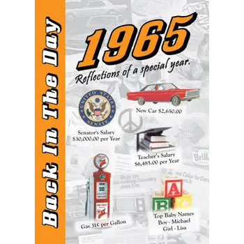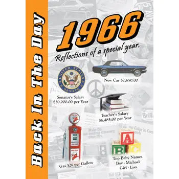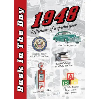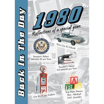 Take a stroll down memory lane as you flip through twenty-four (24) pages of advertisements, news headlines, cost of goods, and other interesting information from your special year. You will see advertisements showing items from your special year including cars, appliances, food products, candy, and other household items. Back In The Day booklets make a great gift or card for Anniversaries, Birthdays, reunions, graduations or any other special event! There is even a short trivia game to play with others or just challenge yourself. With 24 pages of information, Back In The Day Greeting booklets offer a much better value than the traditional folded greeting card.