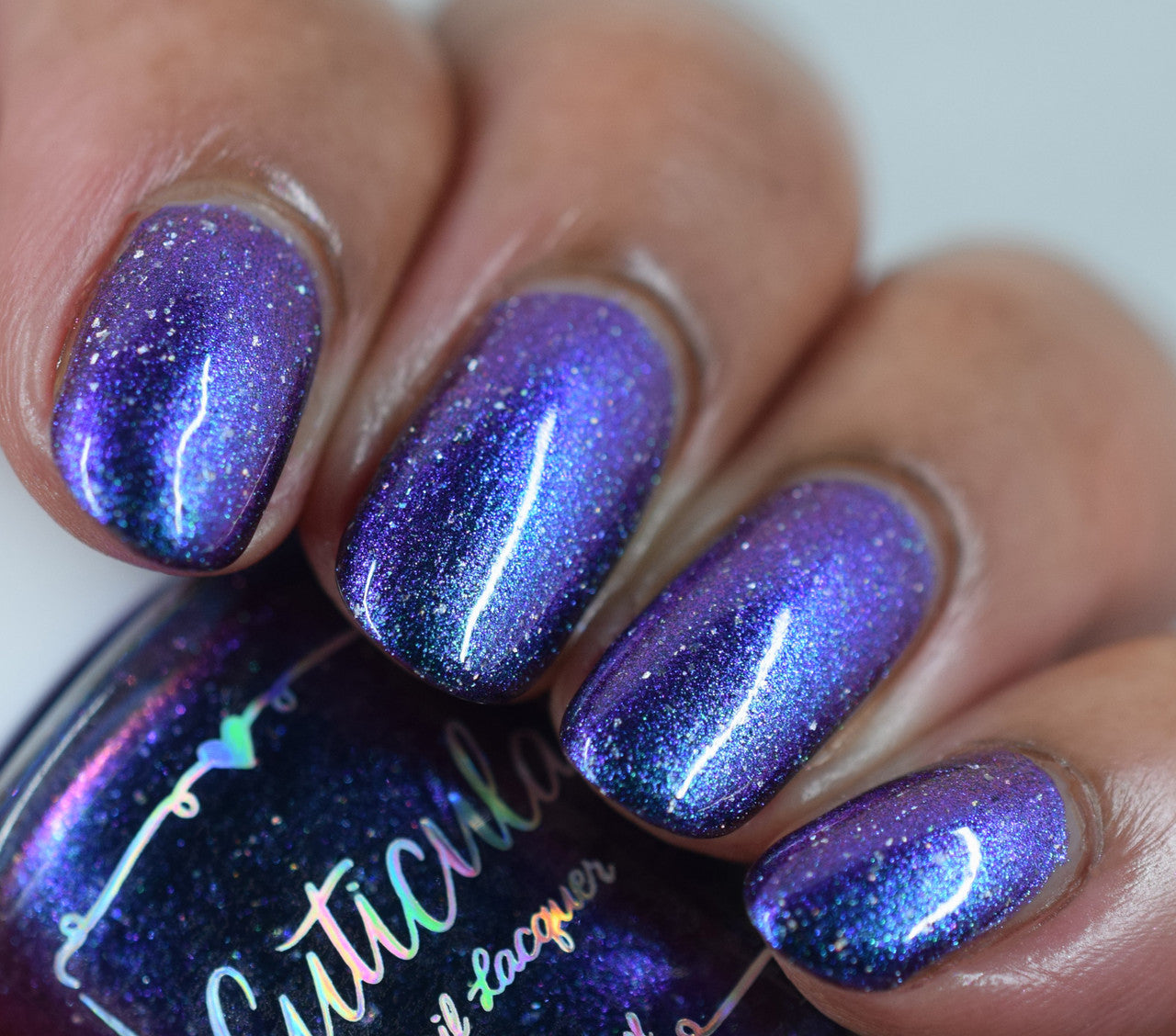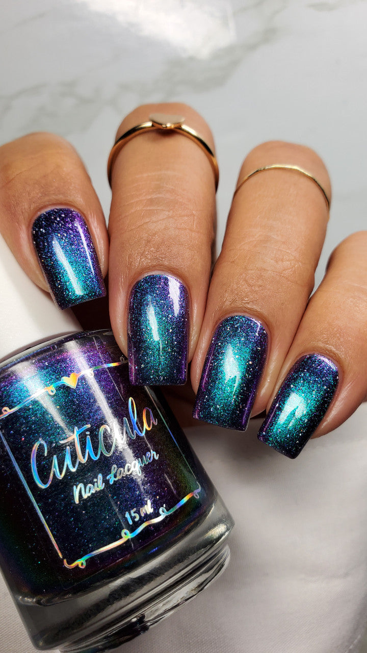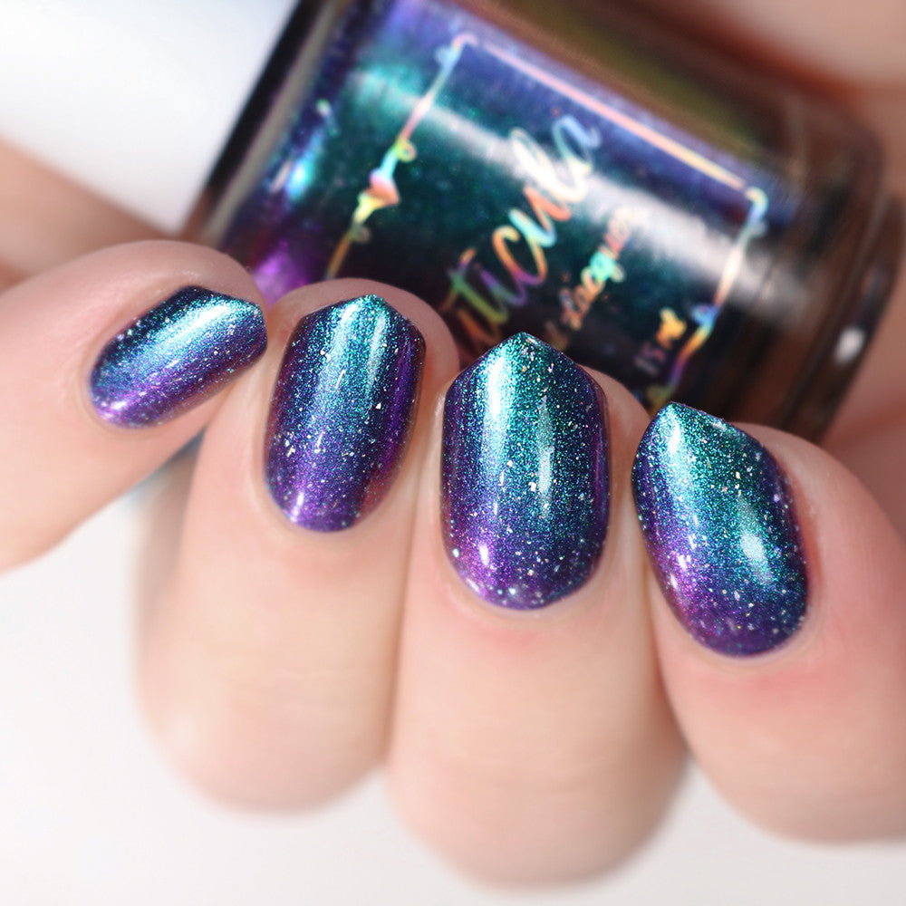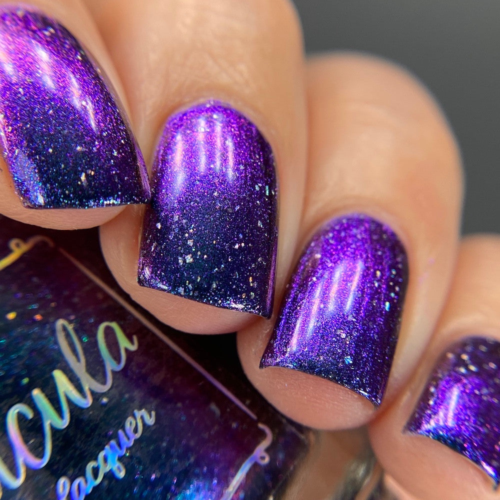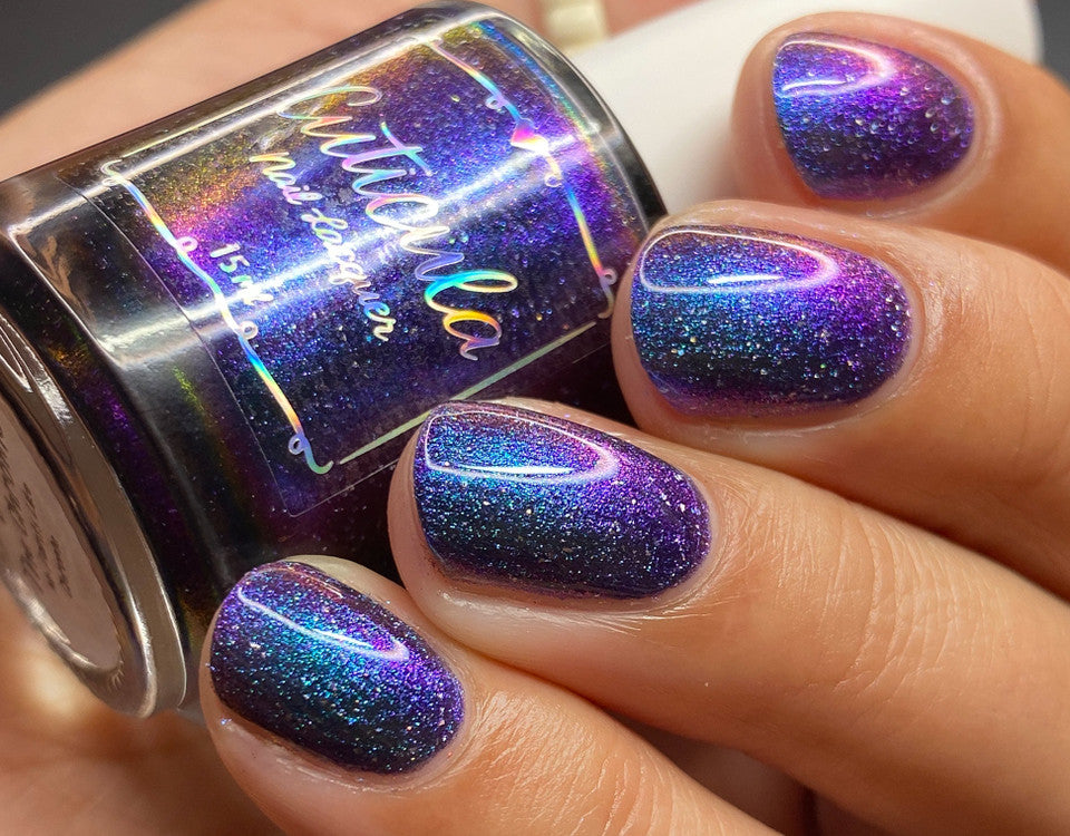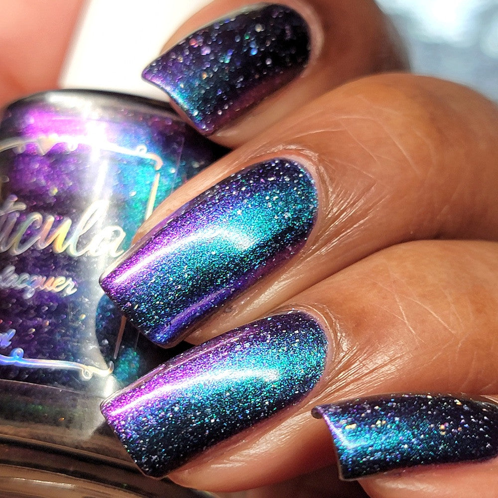 A violet base with green/blue/purple/gold shifting multichrome shimmer and silver holographic flakes.