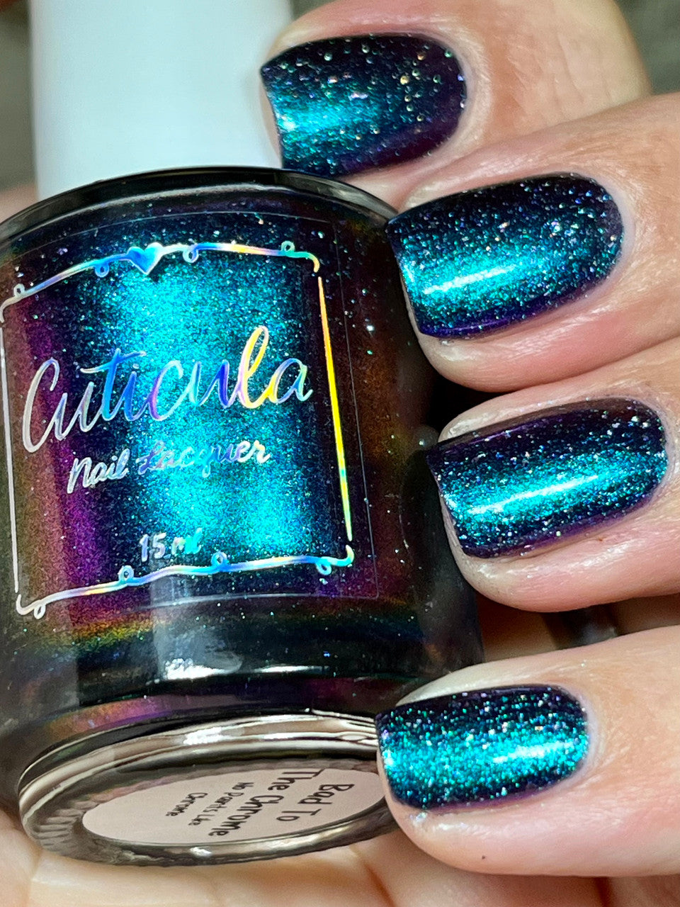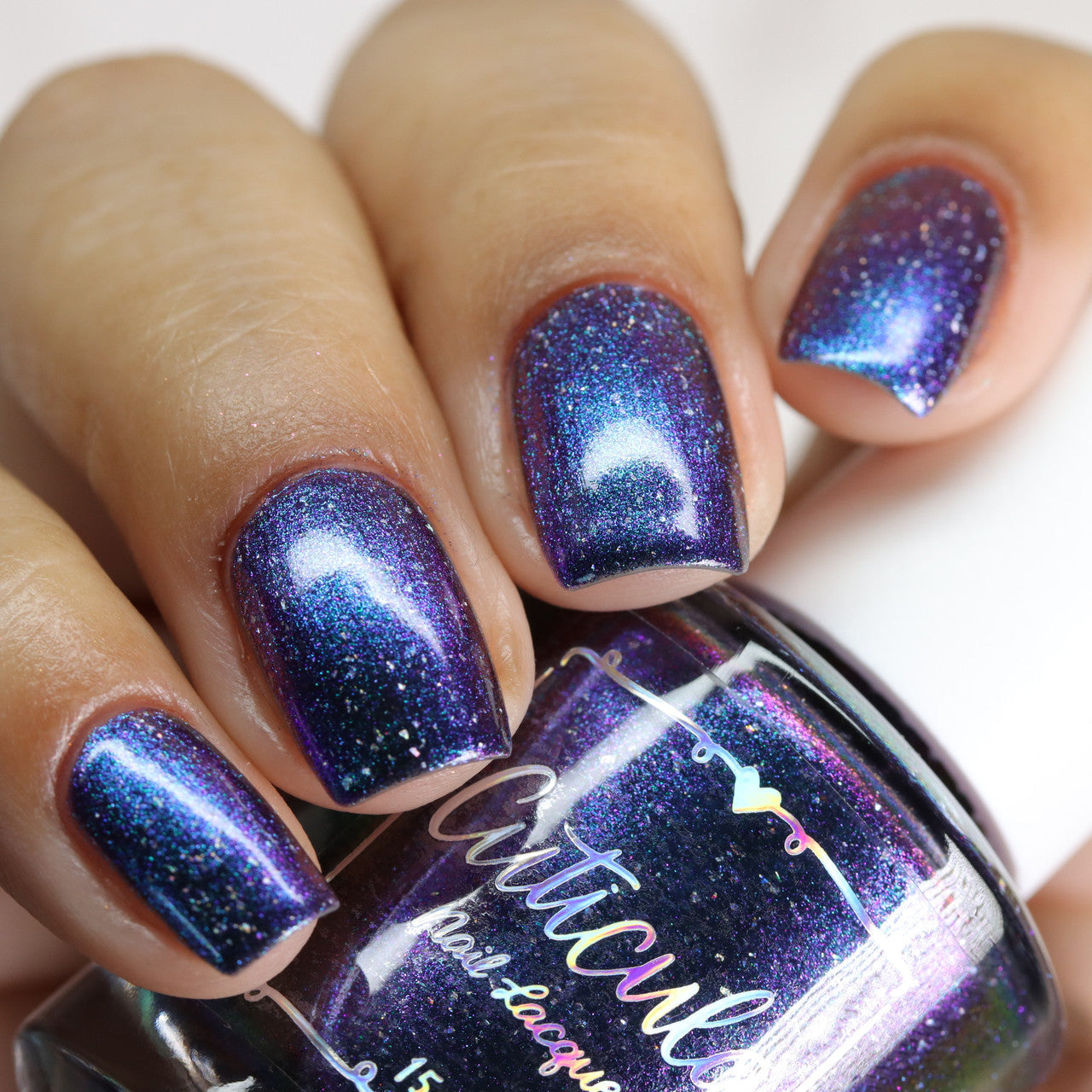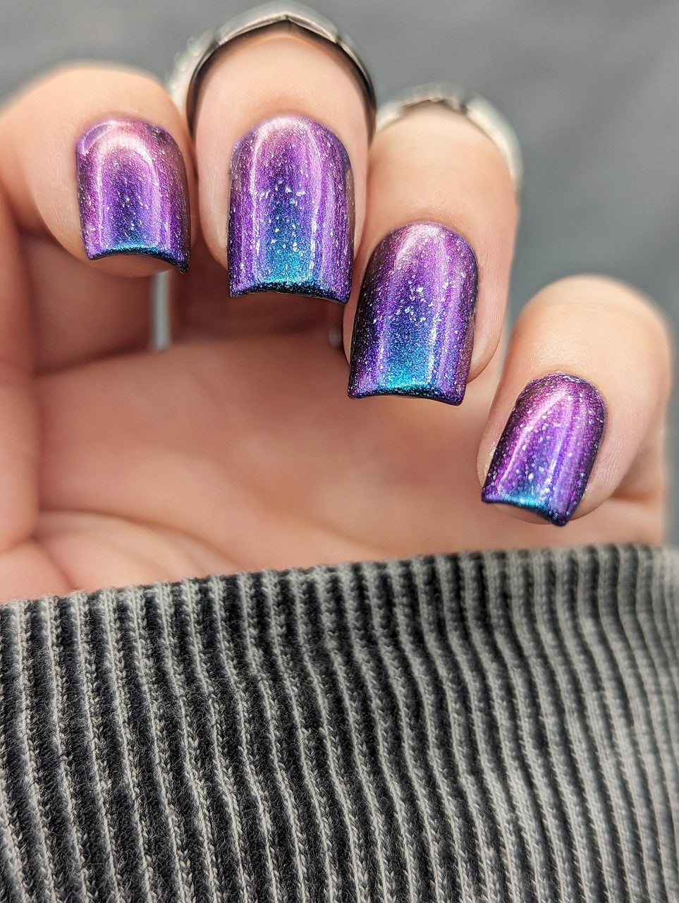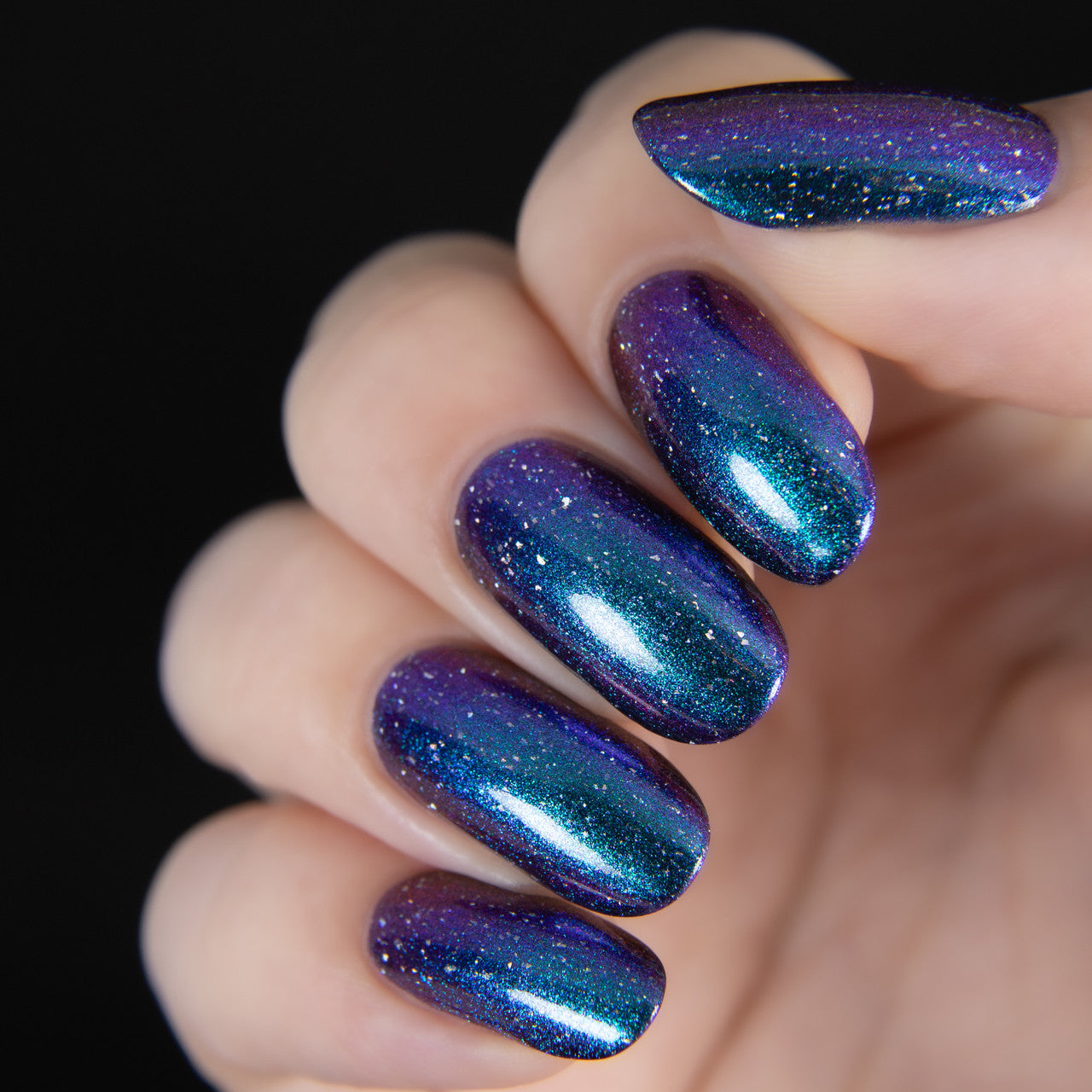 A violet base with green/blue/purple/gold shifting multichrome shimmer and silver holographic flakes.