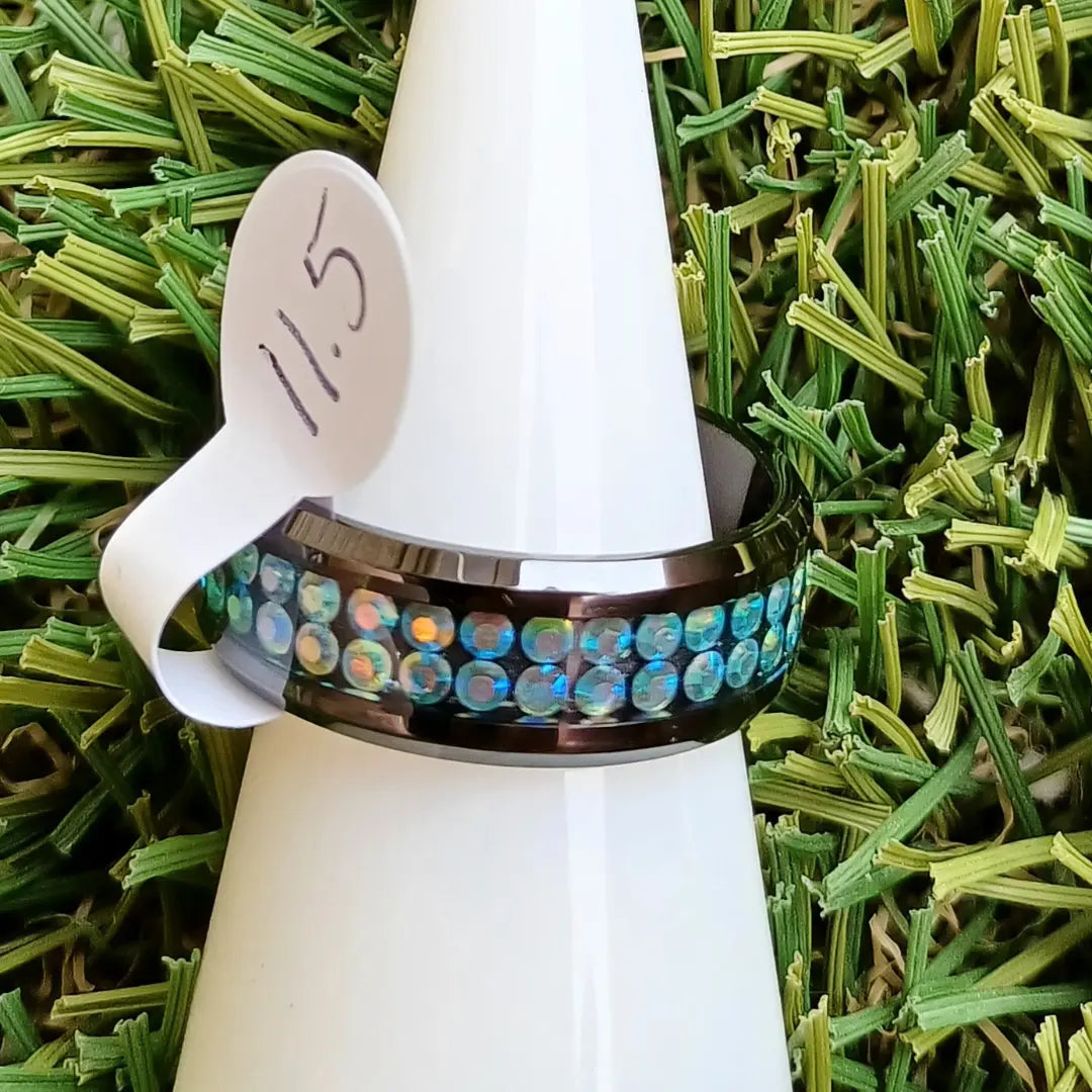 8mm Black ceramic, inlayed with blue iridescent rhinestones, size 11.5