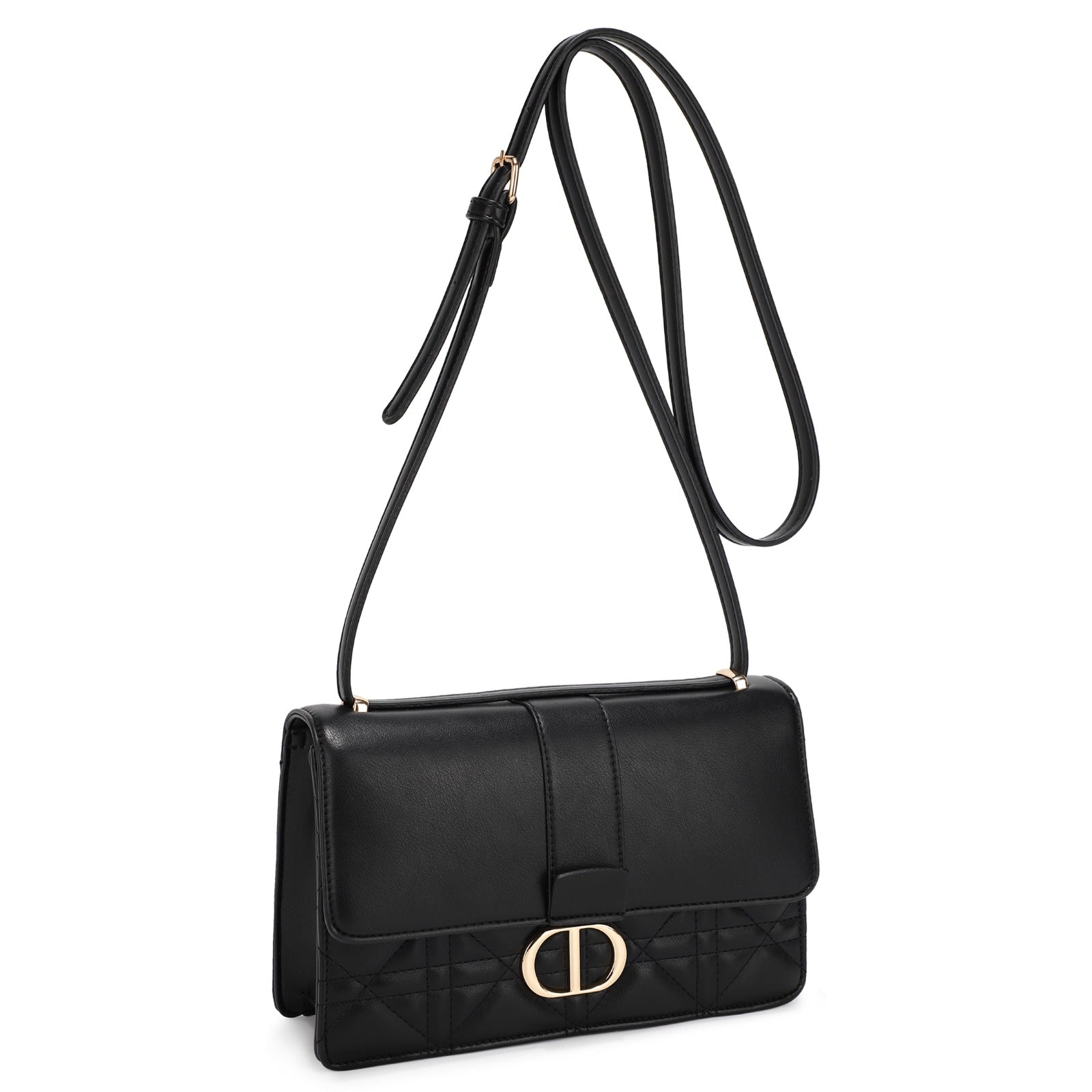 Chic and functional, this quilted black shoulder bag is made from soft vegan leather with diamond stitching and gold tone hardware.