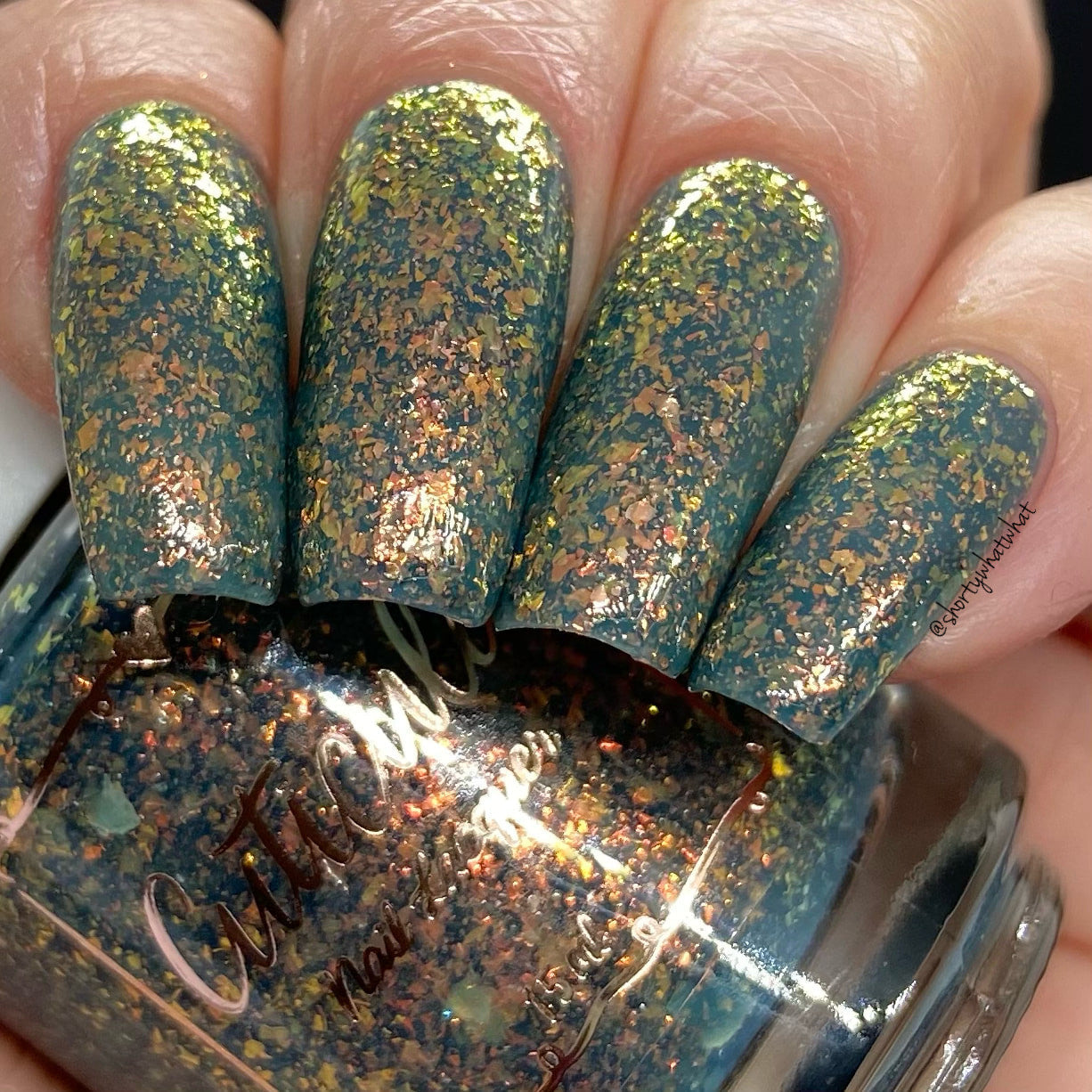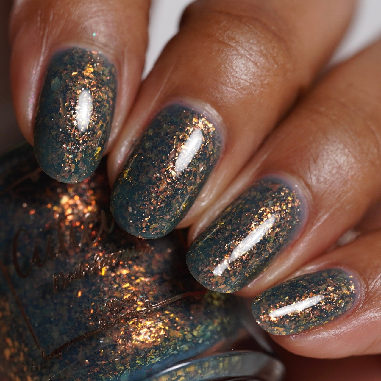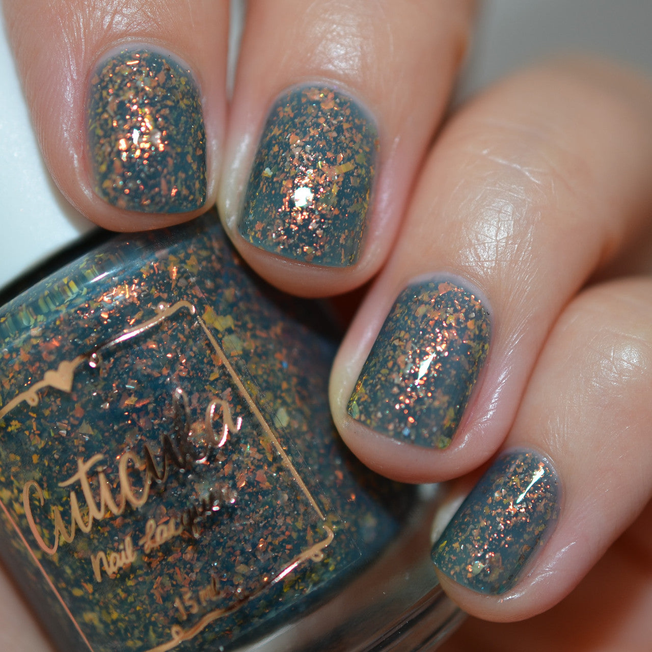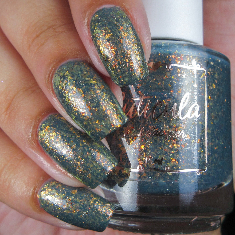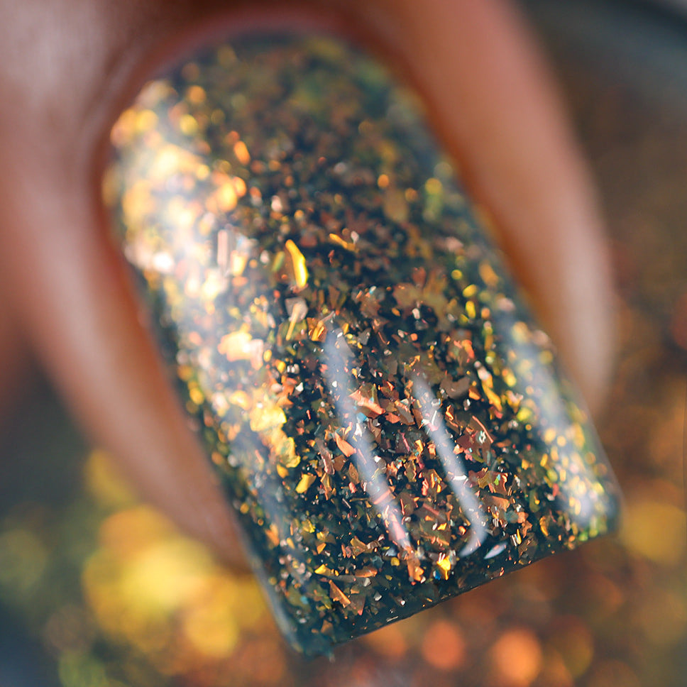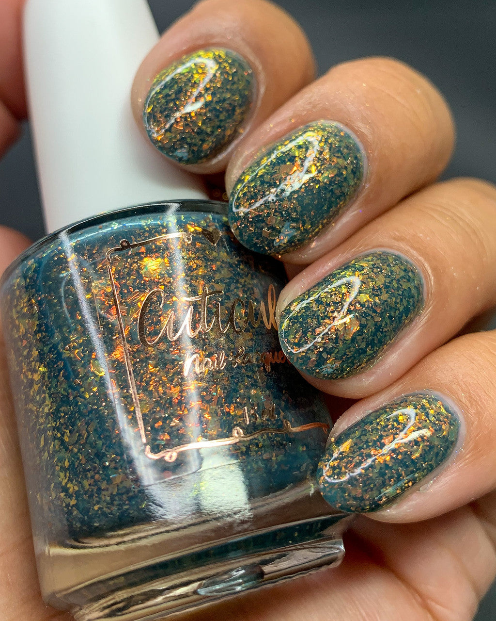 A murky teal base with orange/gold glass flakes and bronze metallic flakes.