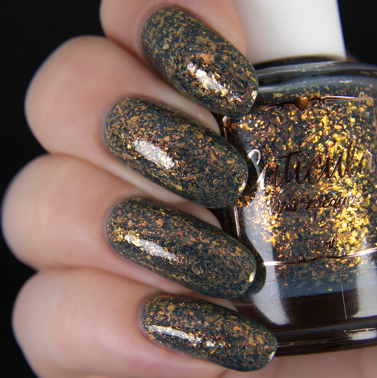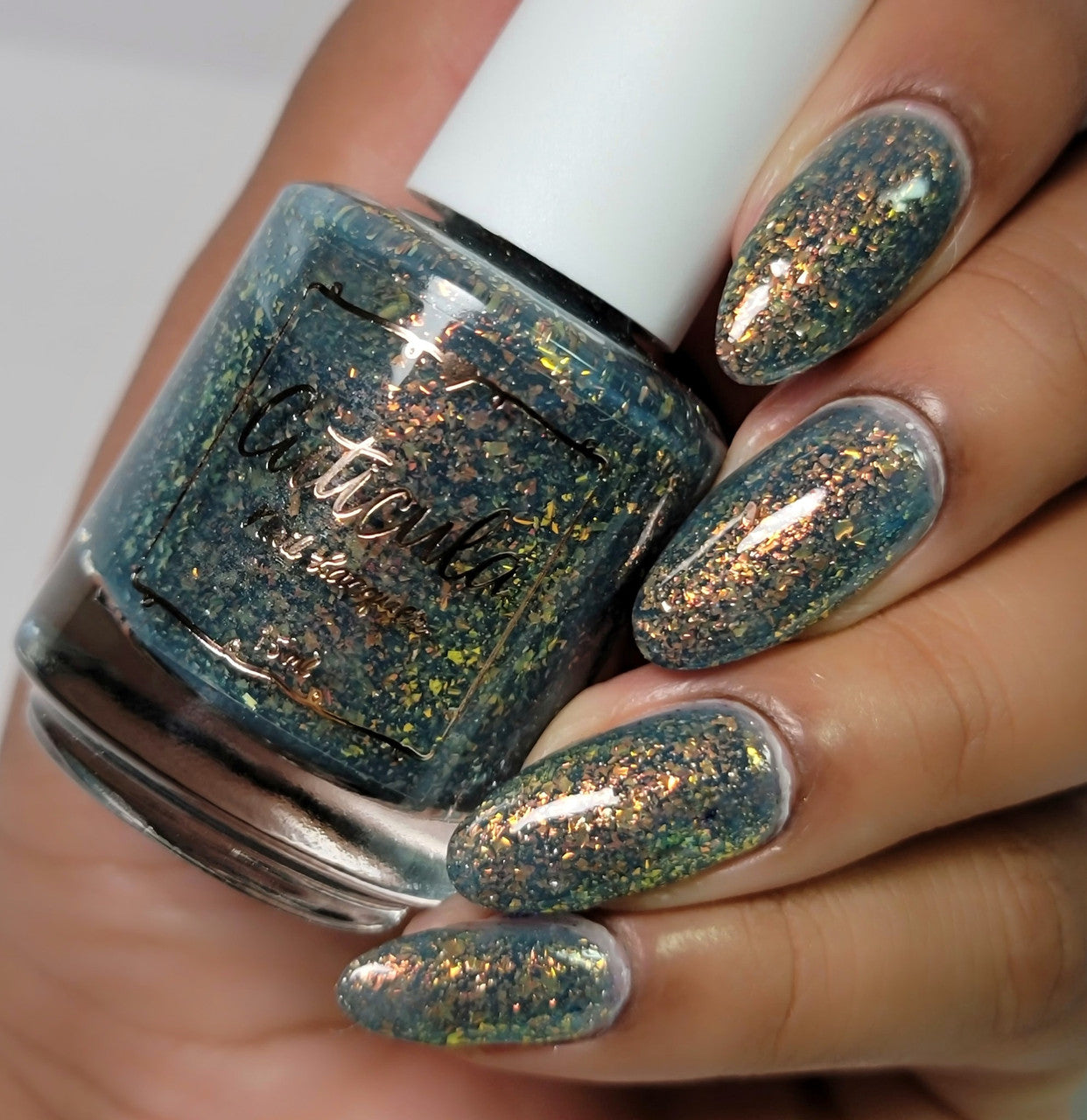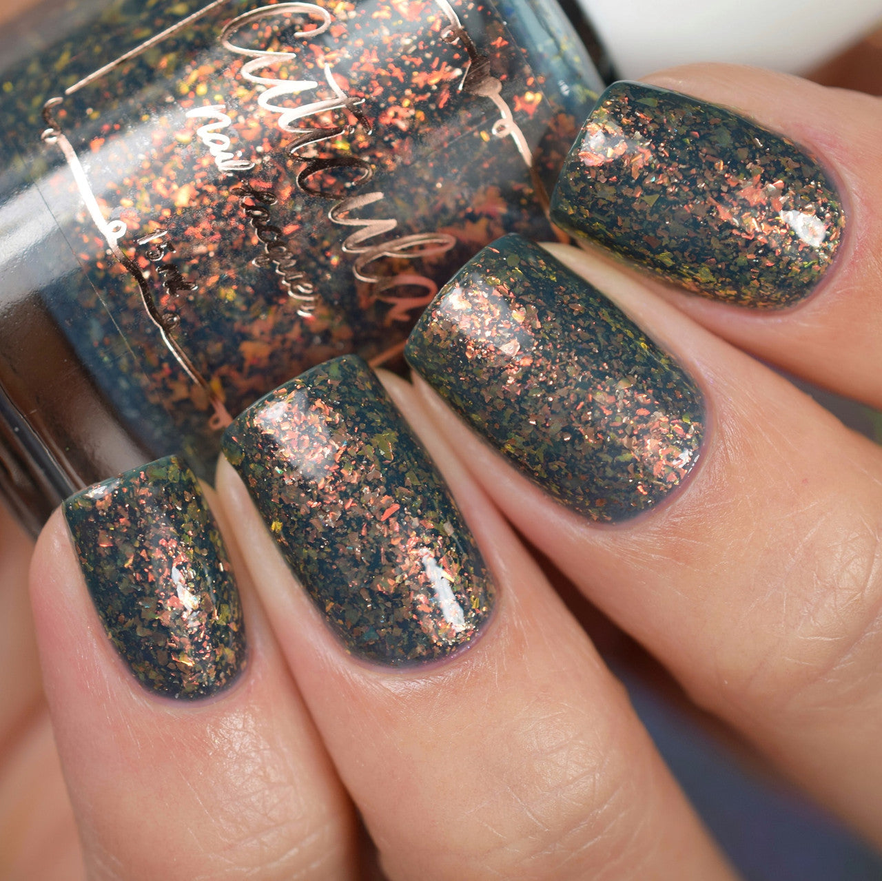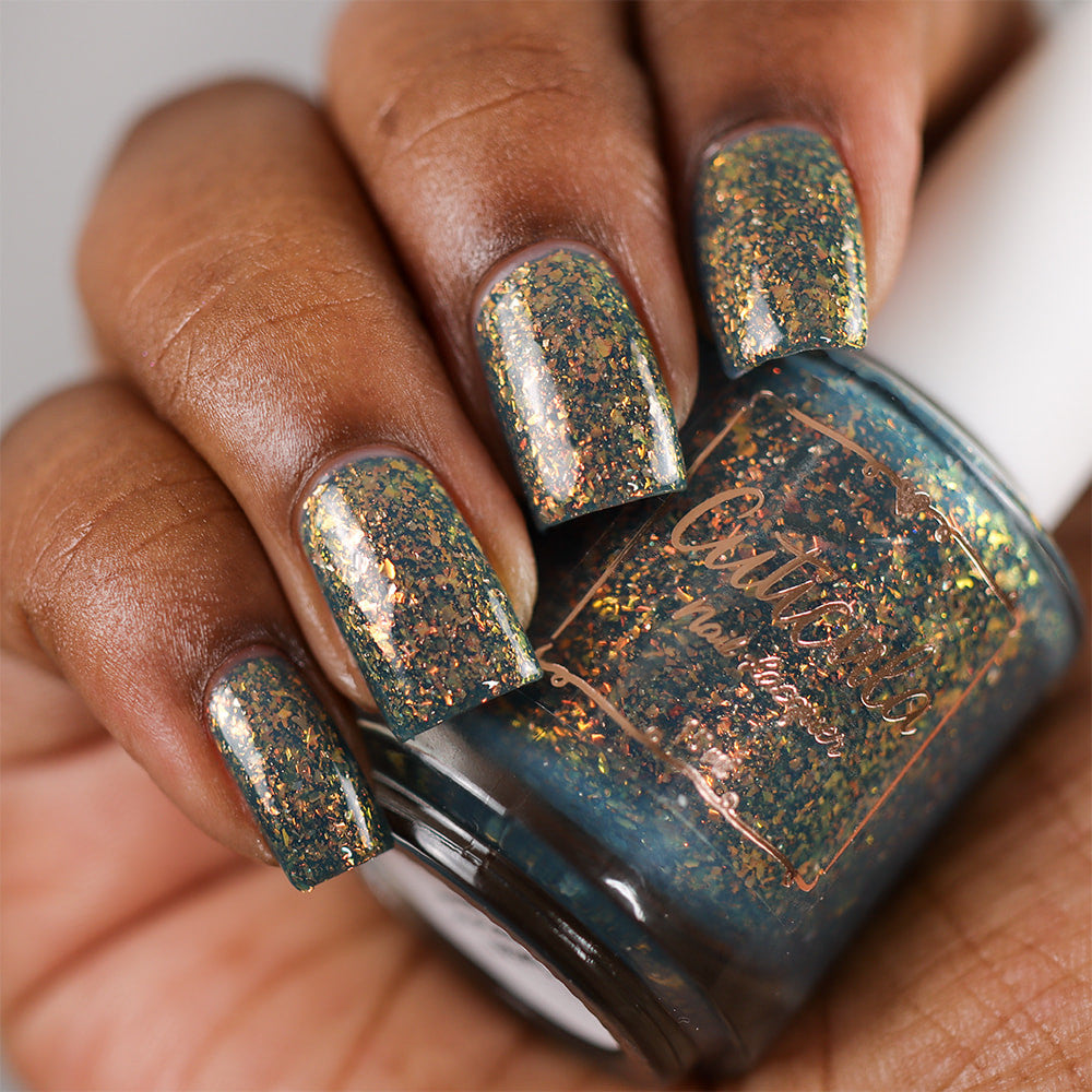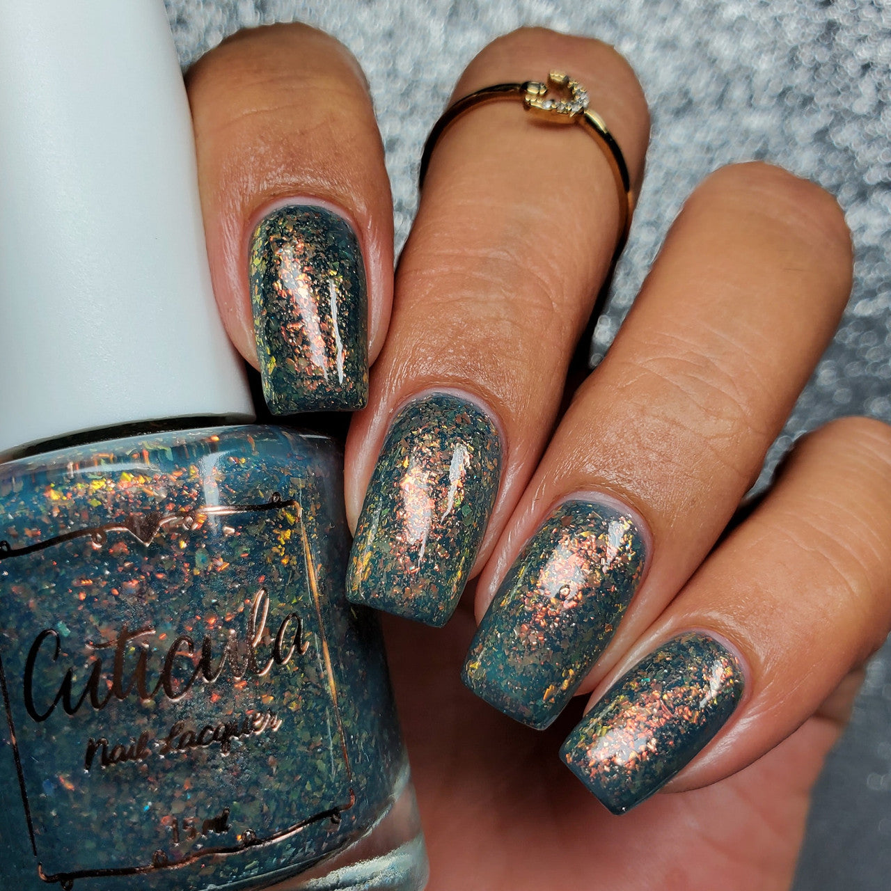 A murky teal base with orange/gold glass flakes and bronze metallic flakes.