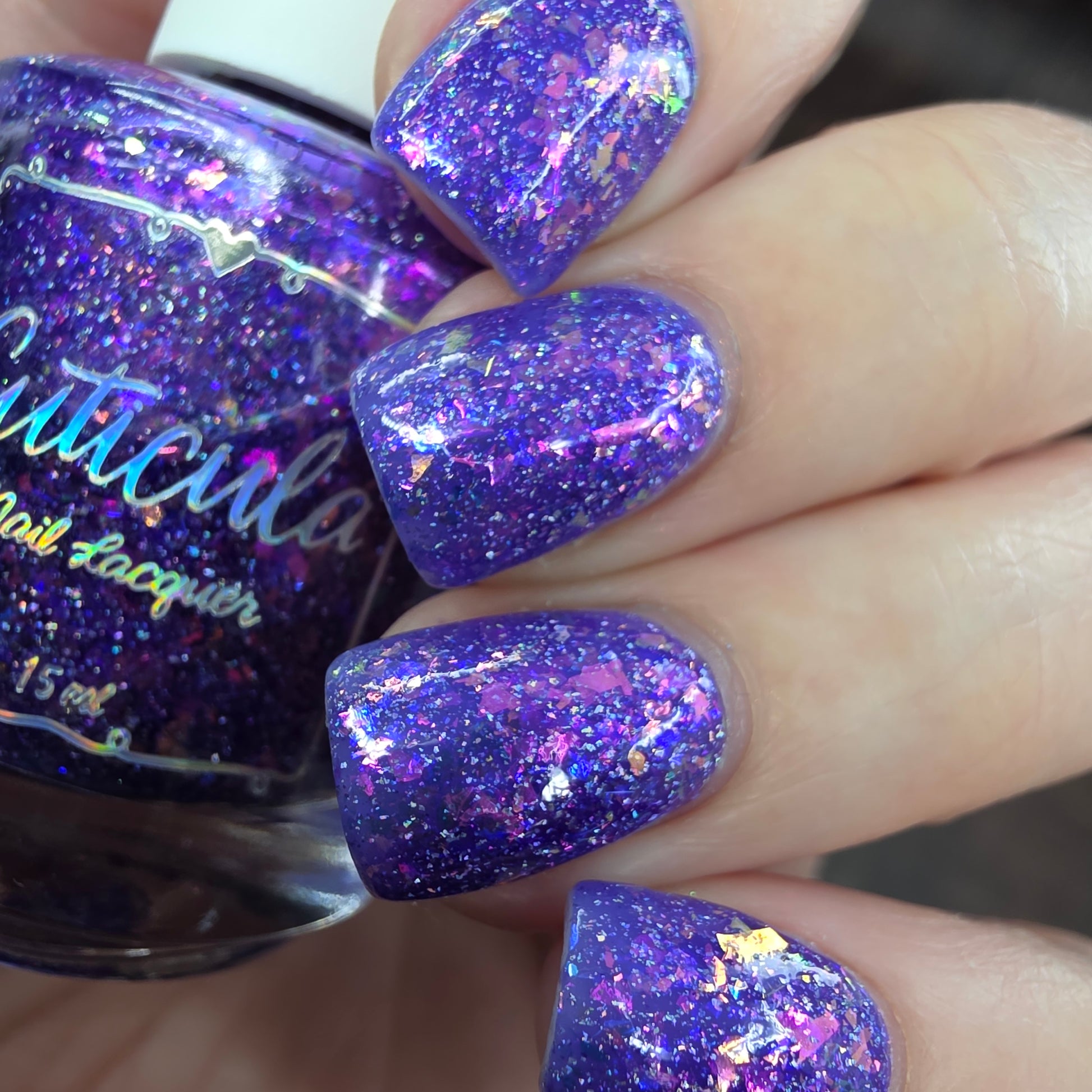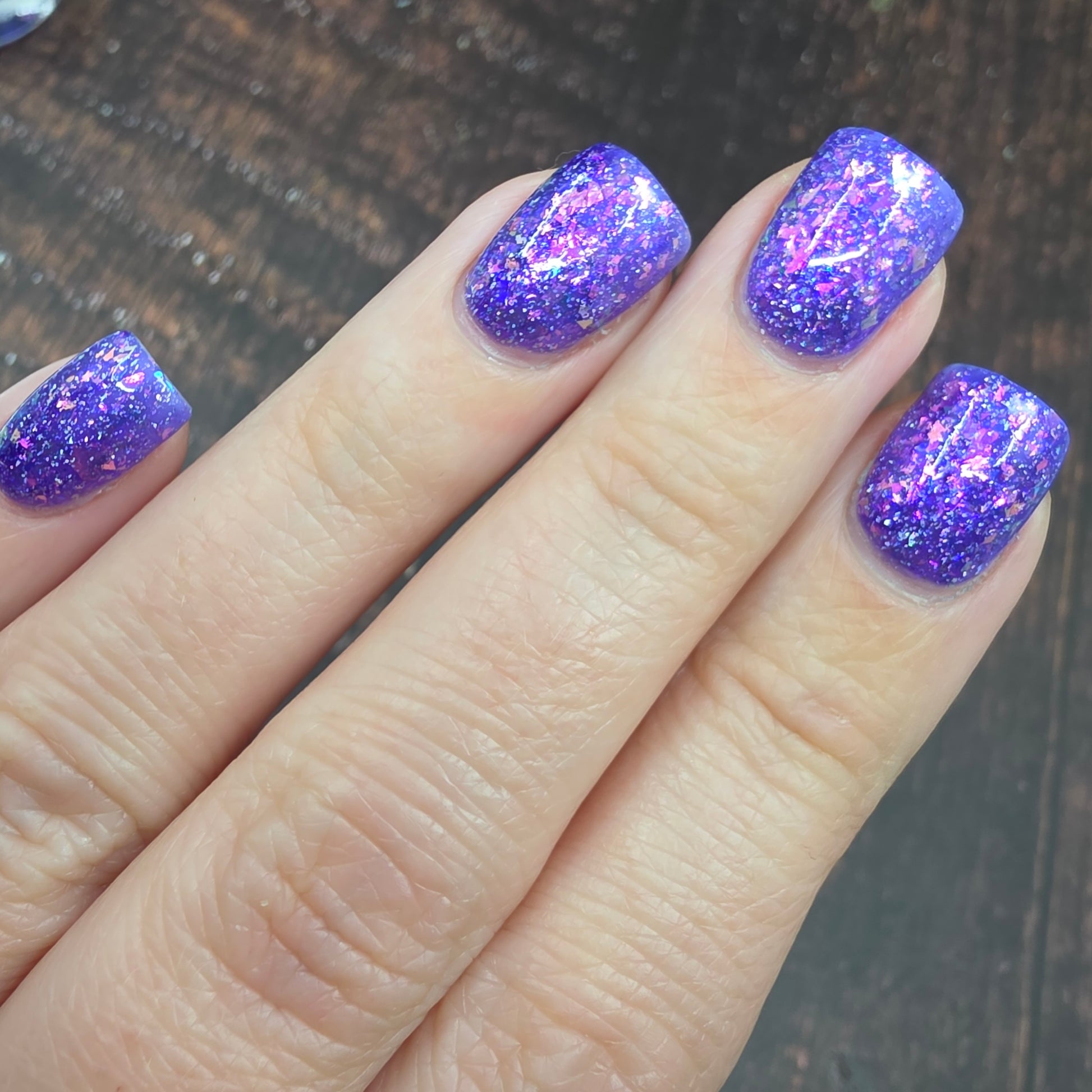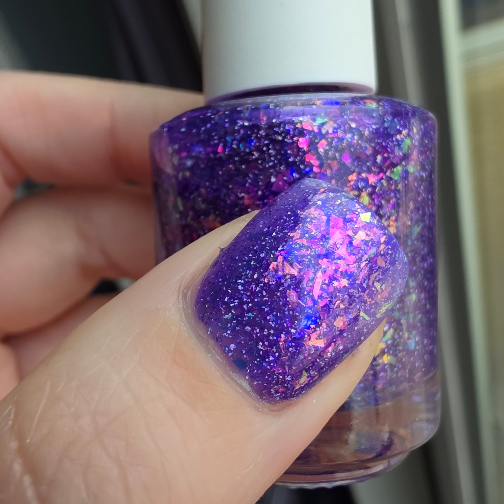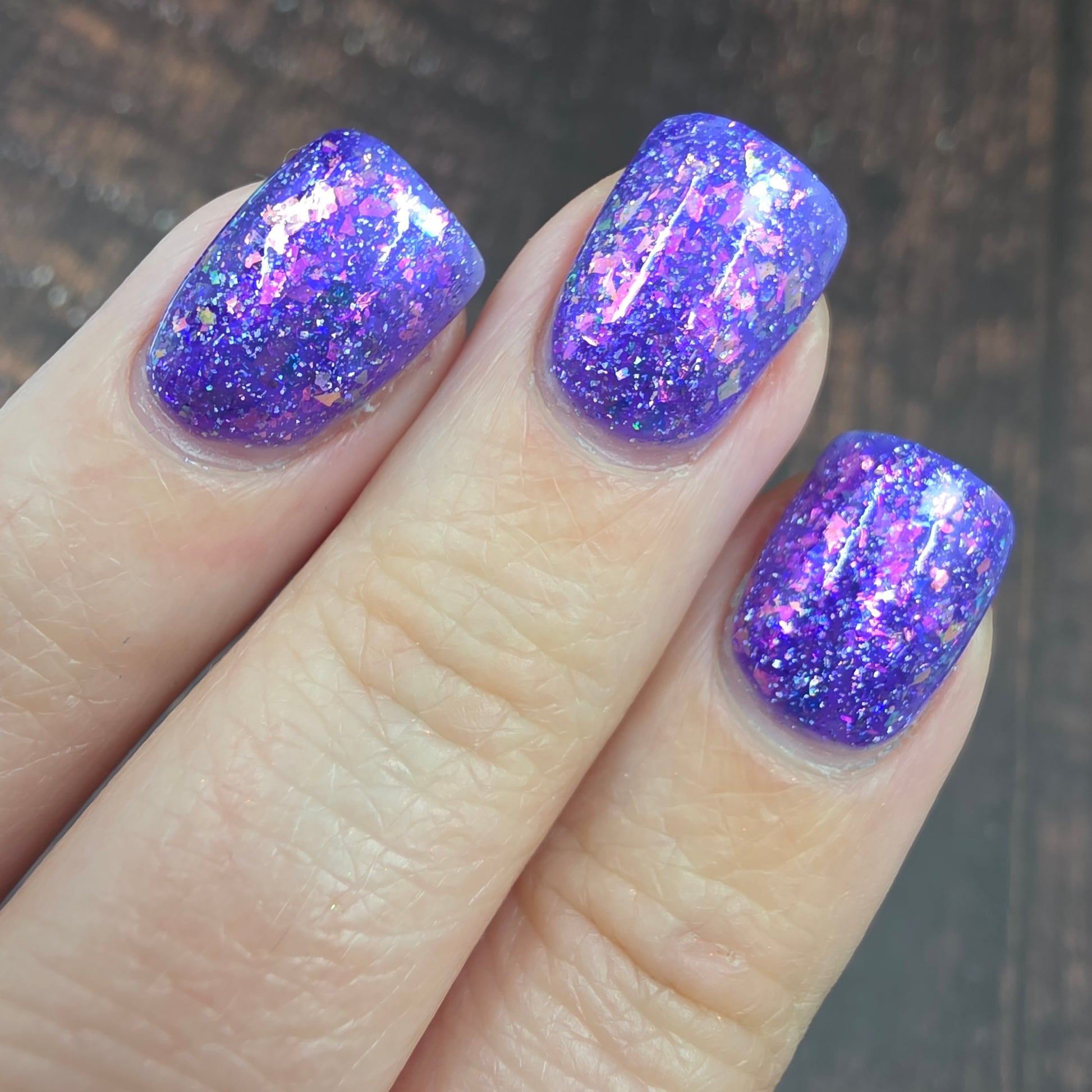A violet jelly base full of ultra glowy flakes that shift pink/gold/green/orange and silver holographic flakes.