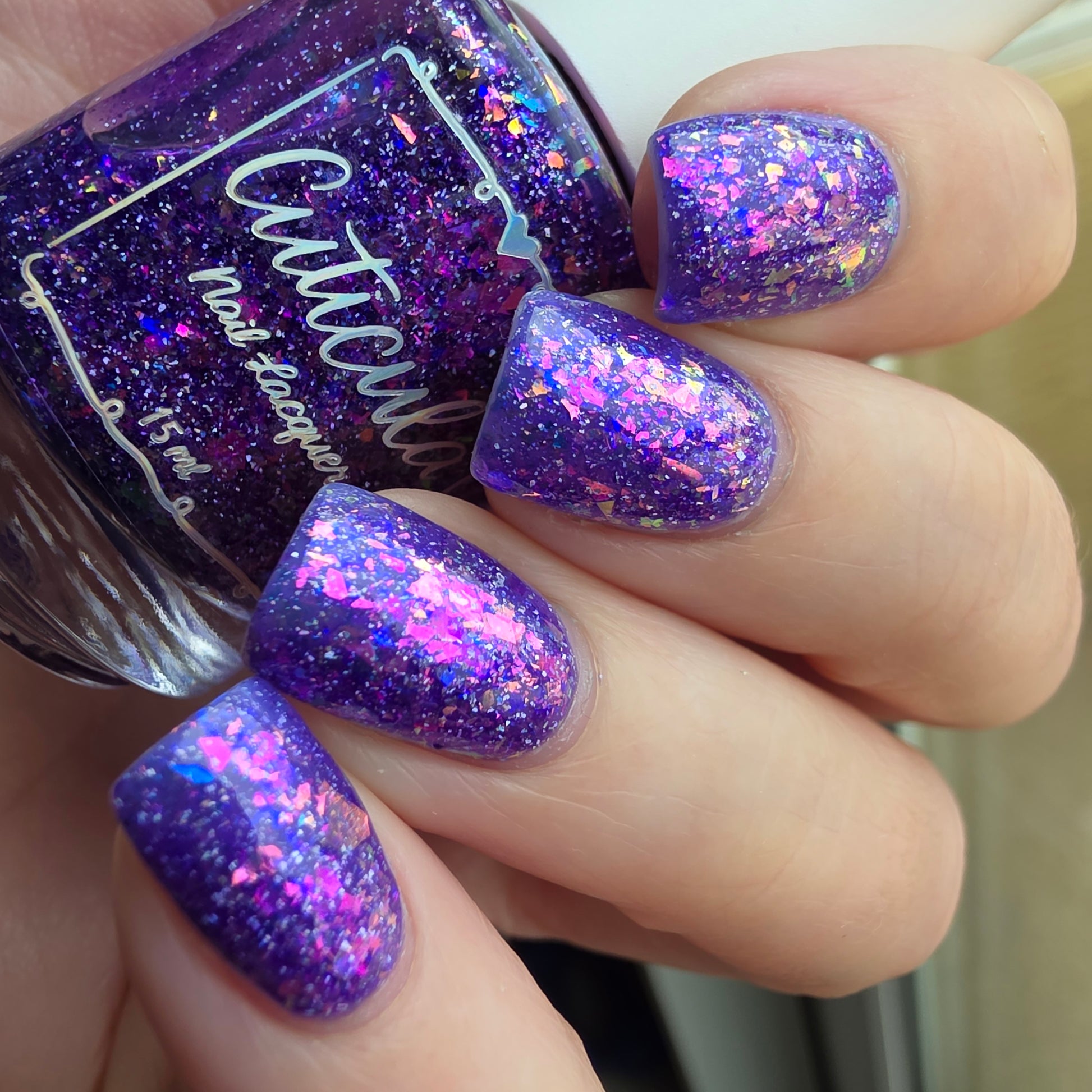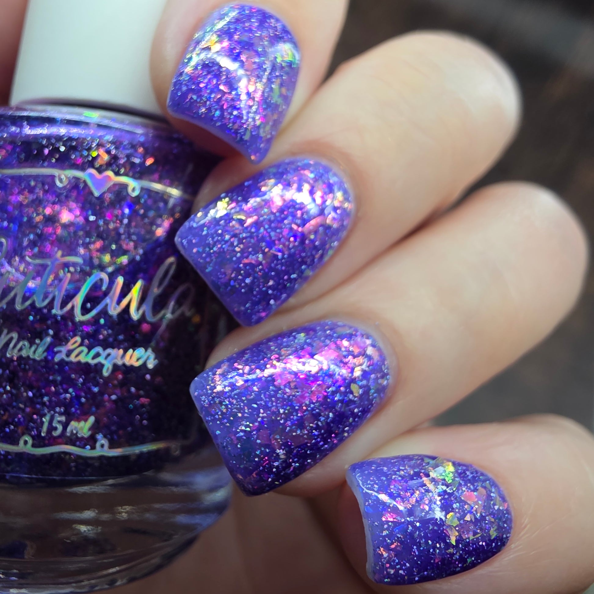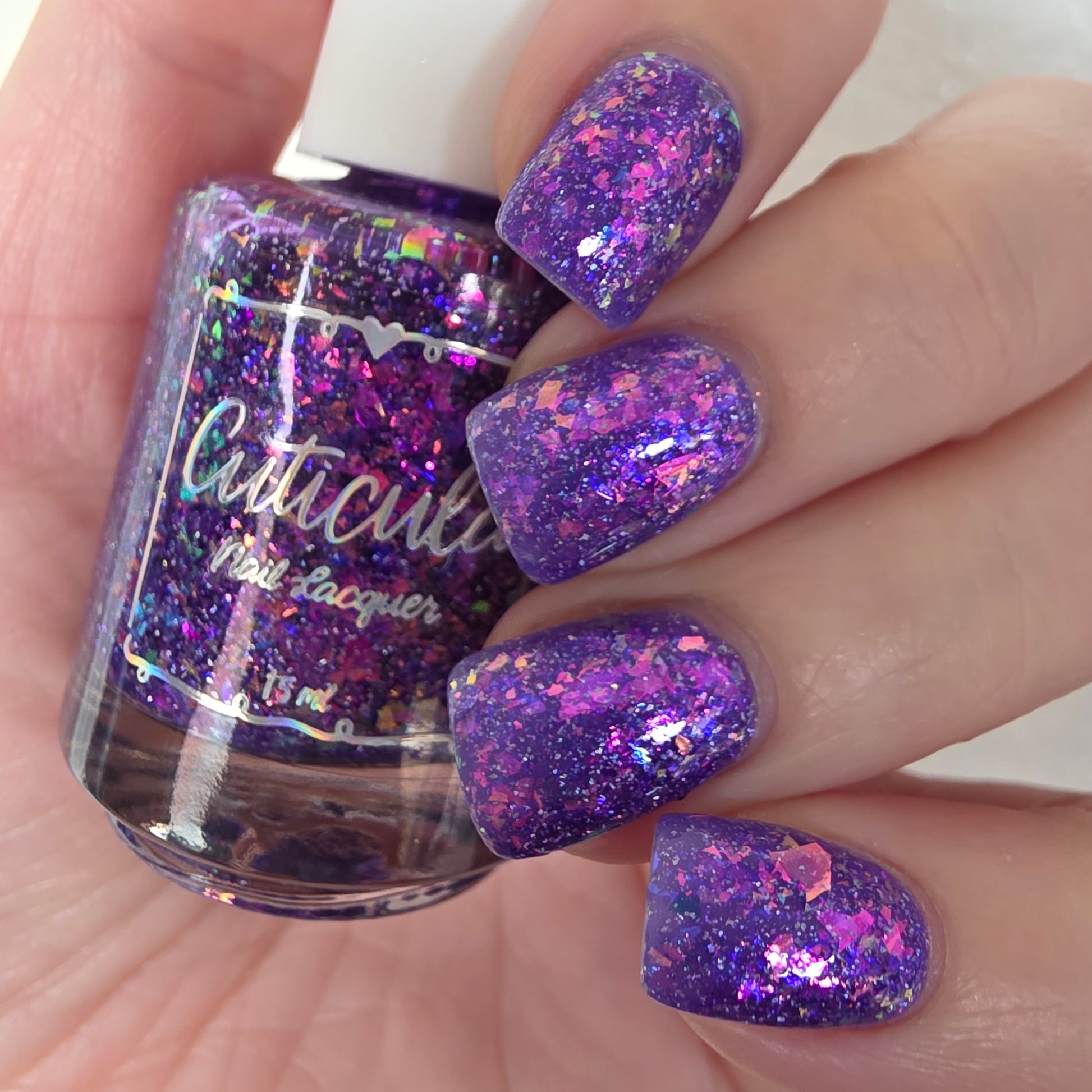 A violet jelly base full of ultra glowy flakes that shift pink/gold/green/orange and silver holographic flakes.