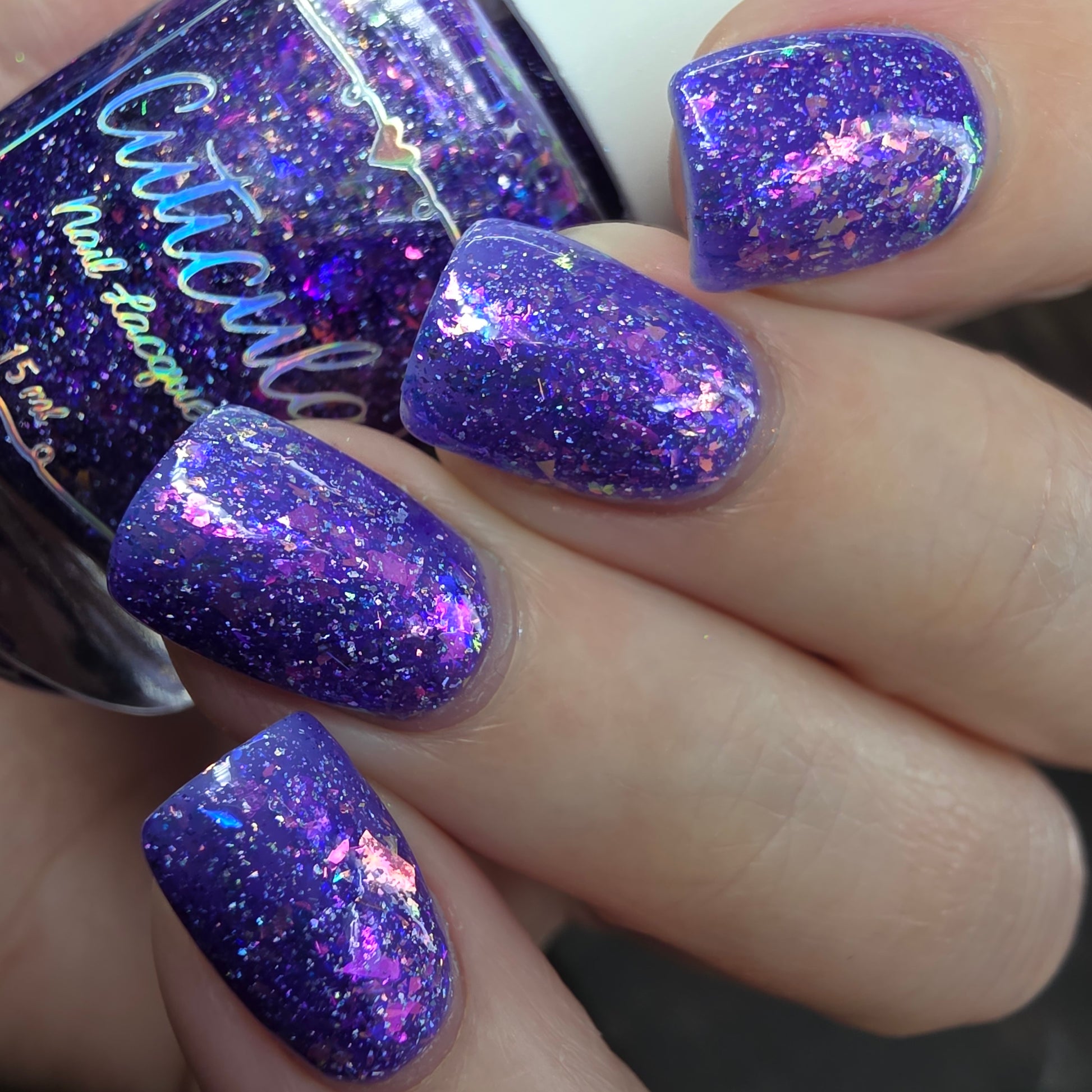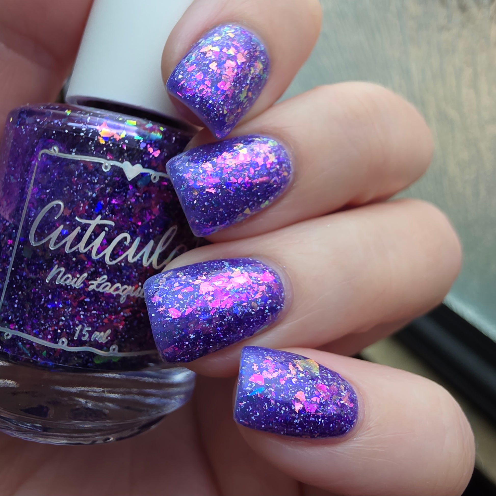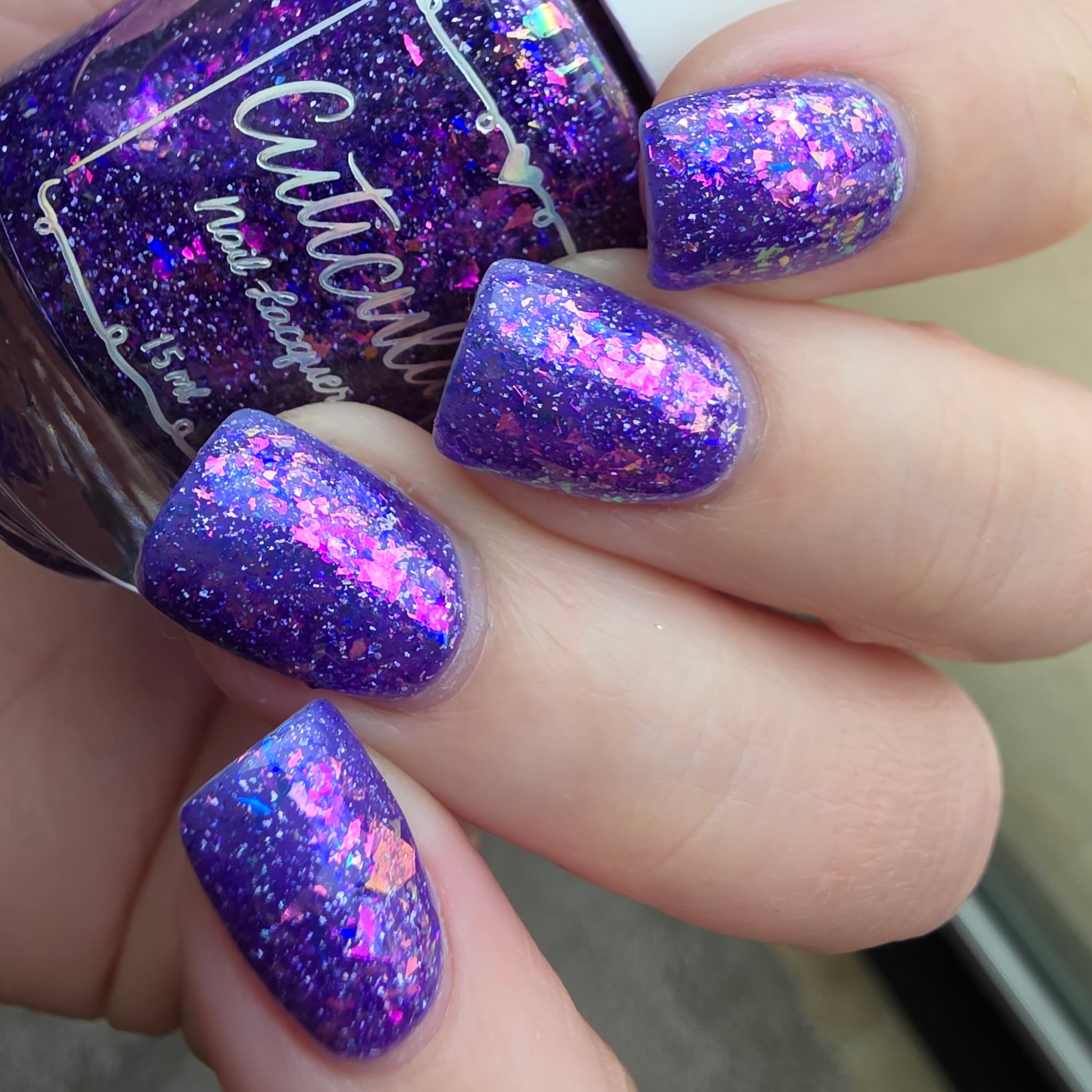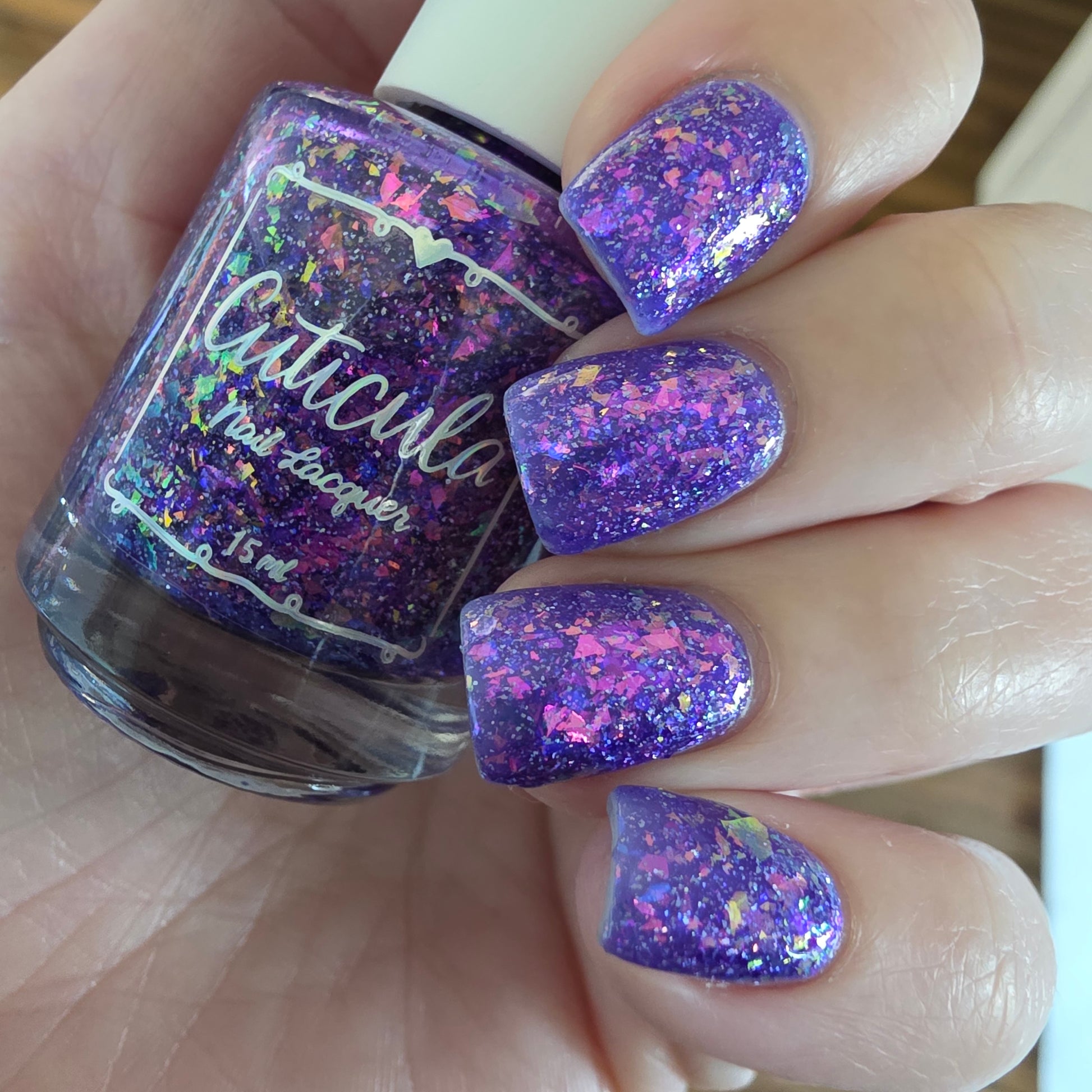 A violet jelly base full of ultra glowy flakes that shift pink/gold/green/orange and silver holographic flakes.