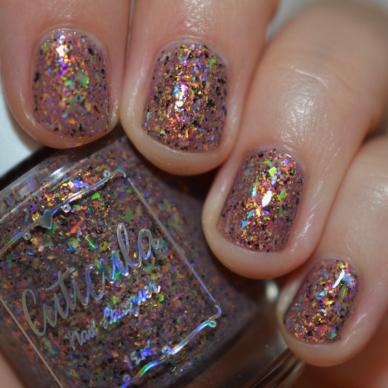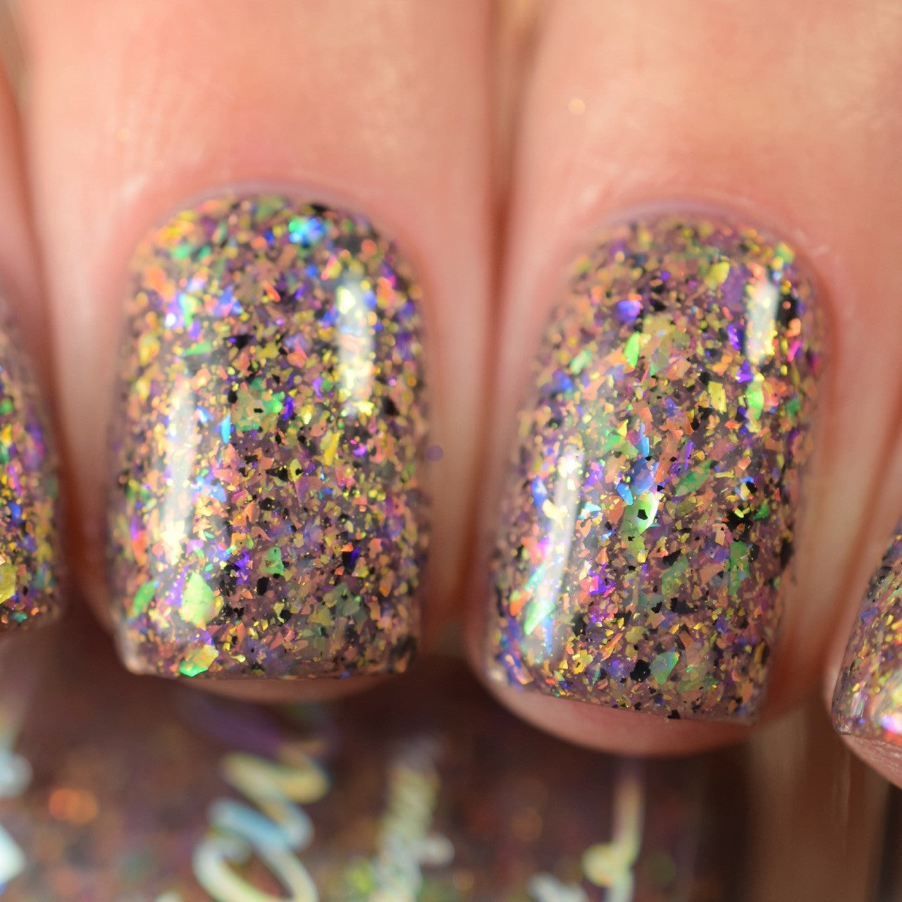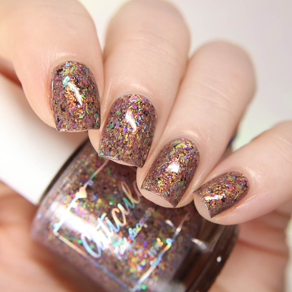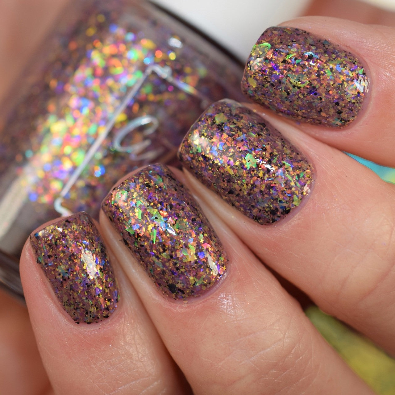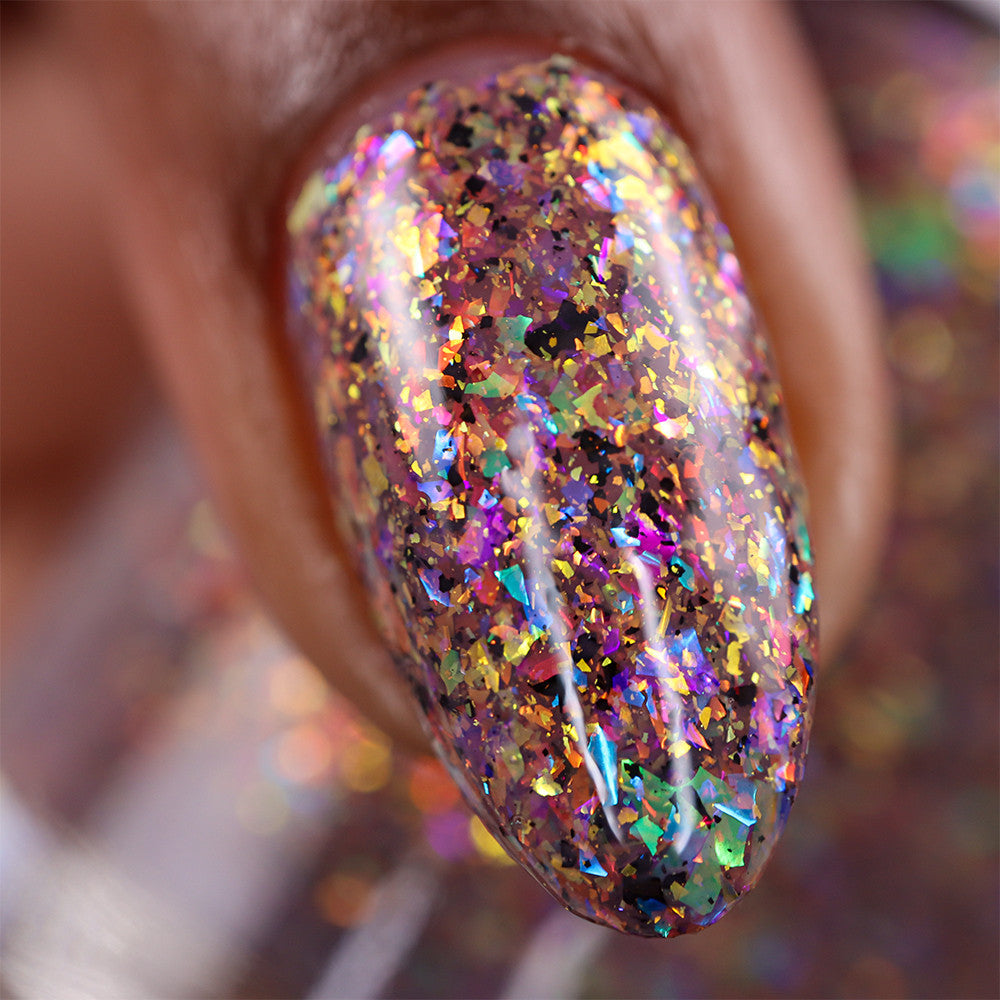 A chocolate crelly base full of rainbow shifting glass flakes, and black flakes.