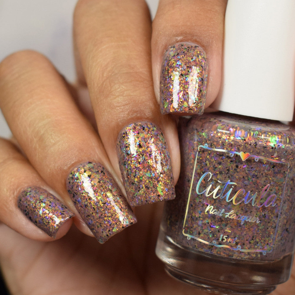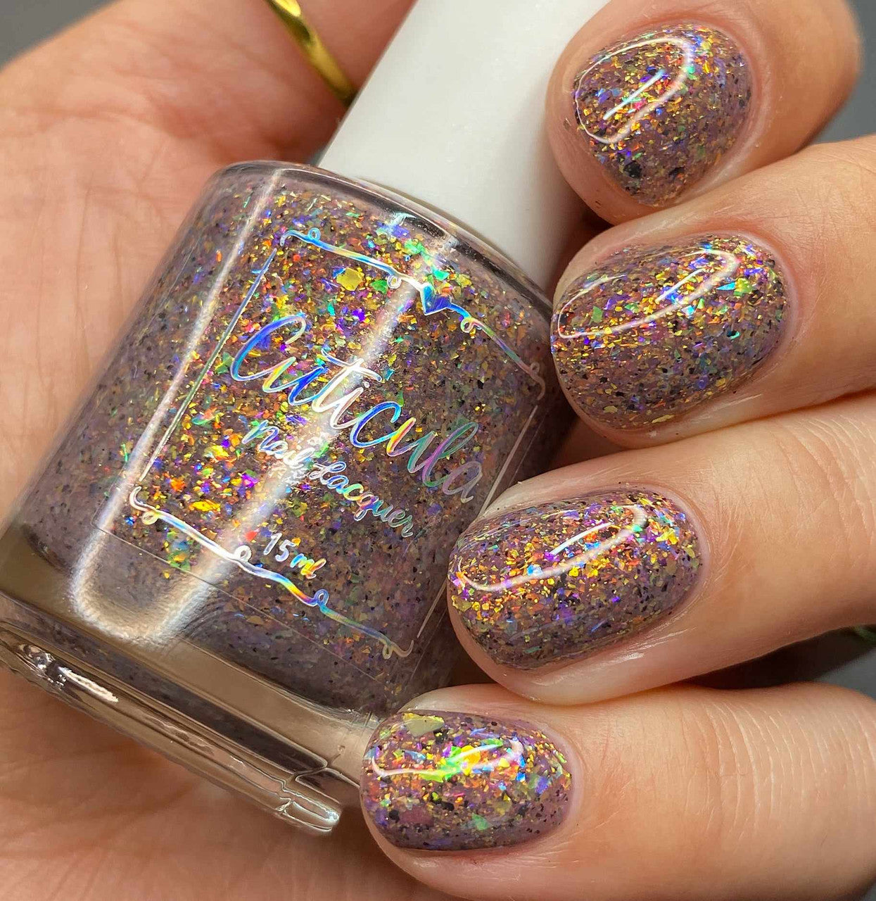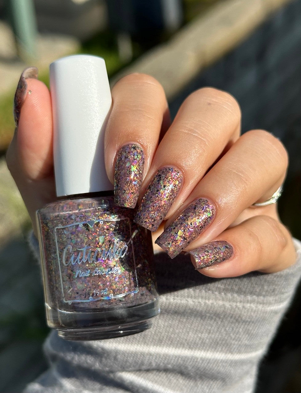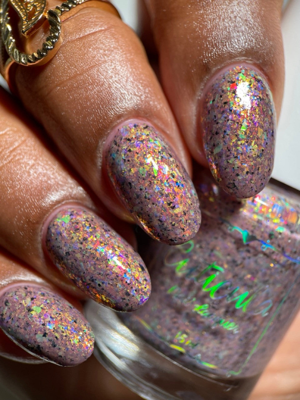 A chocolate crelly base full of rainbow shifting glass flakes, and black flakes.