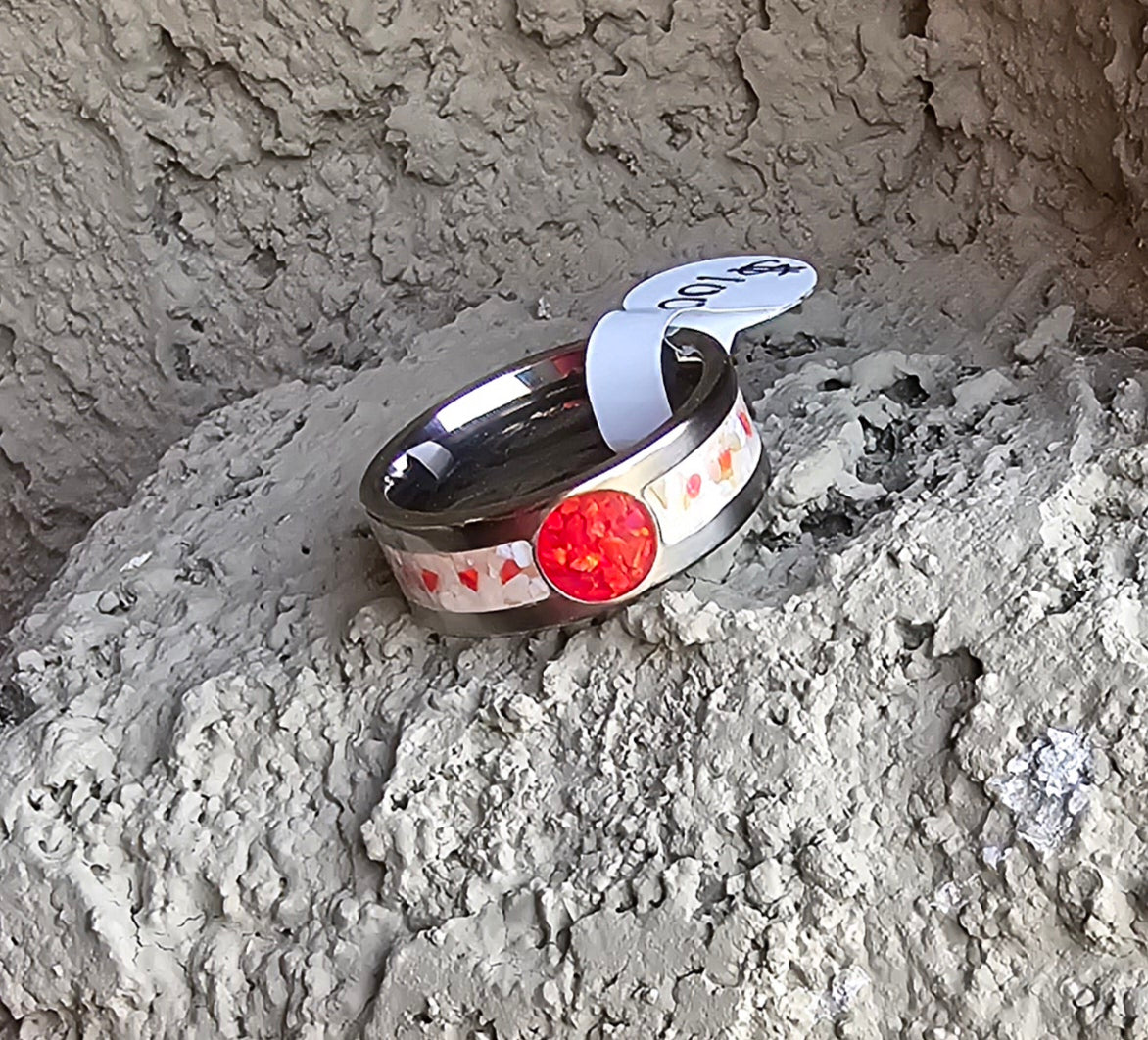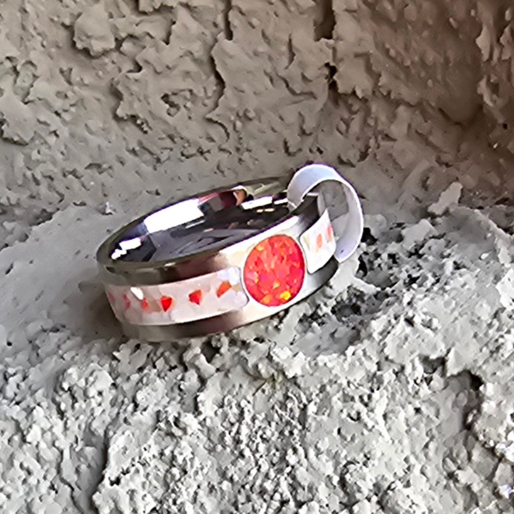 8mm titanium cup inlay design with red opals and mother of pearl, size 10
