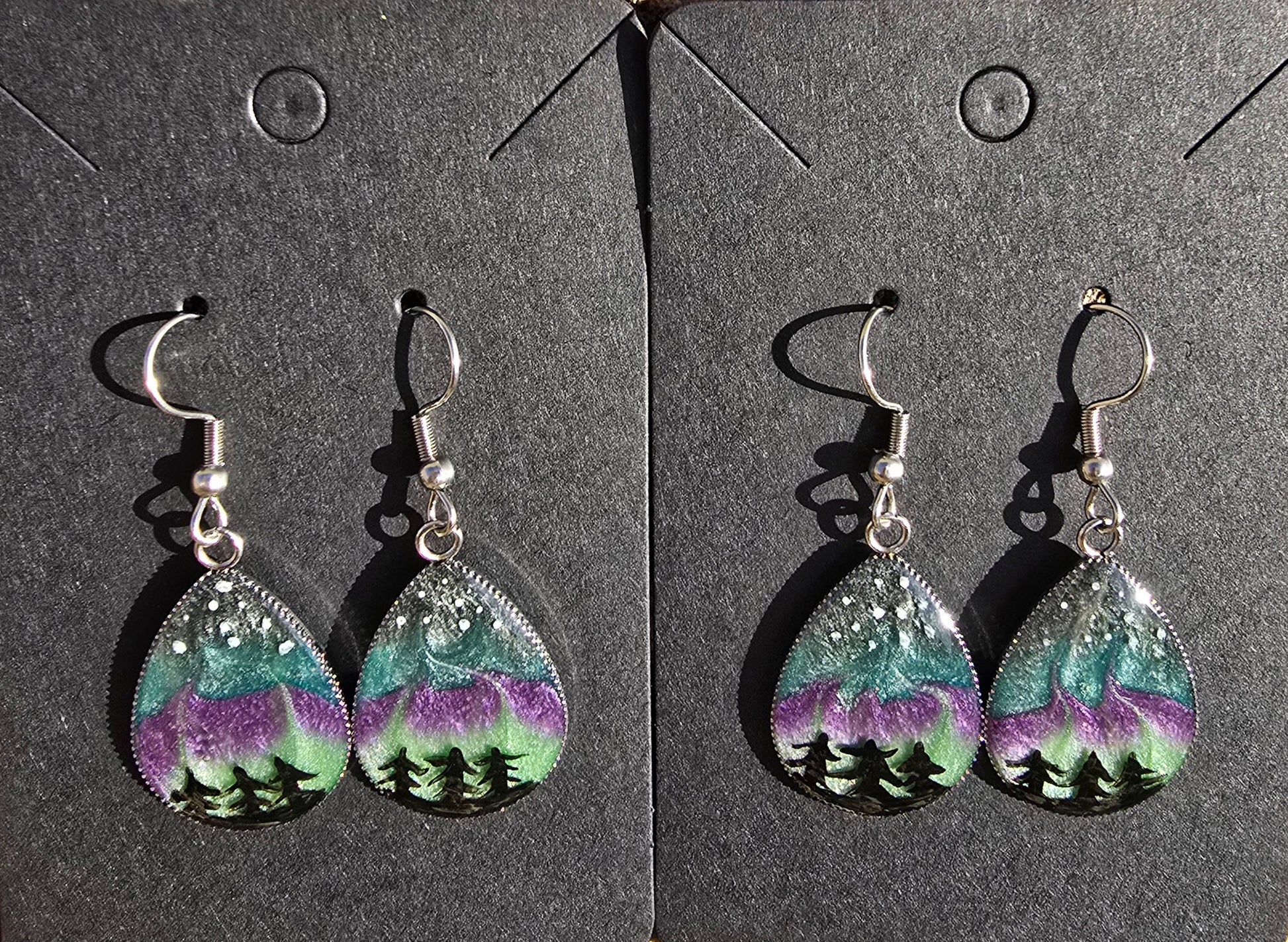Stainless steel dangle style earrings. Tear drop shape with northern lights design