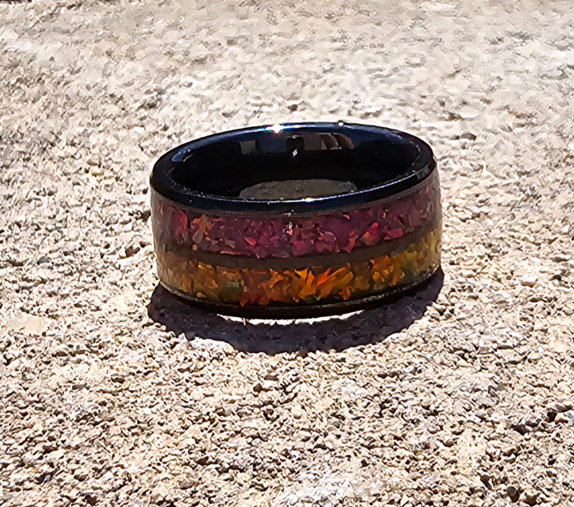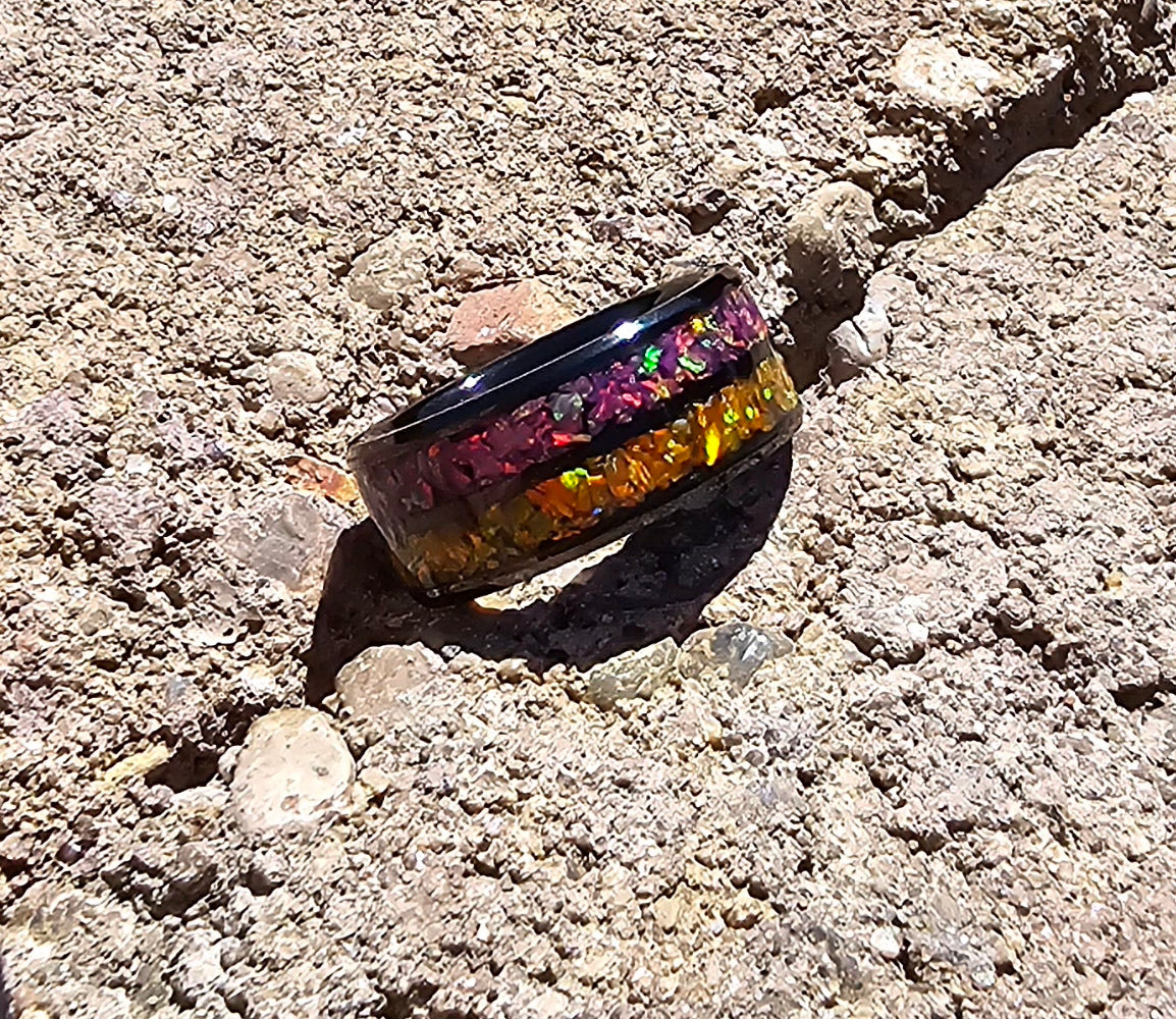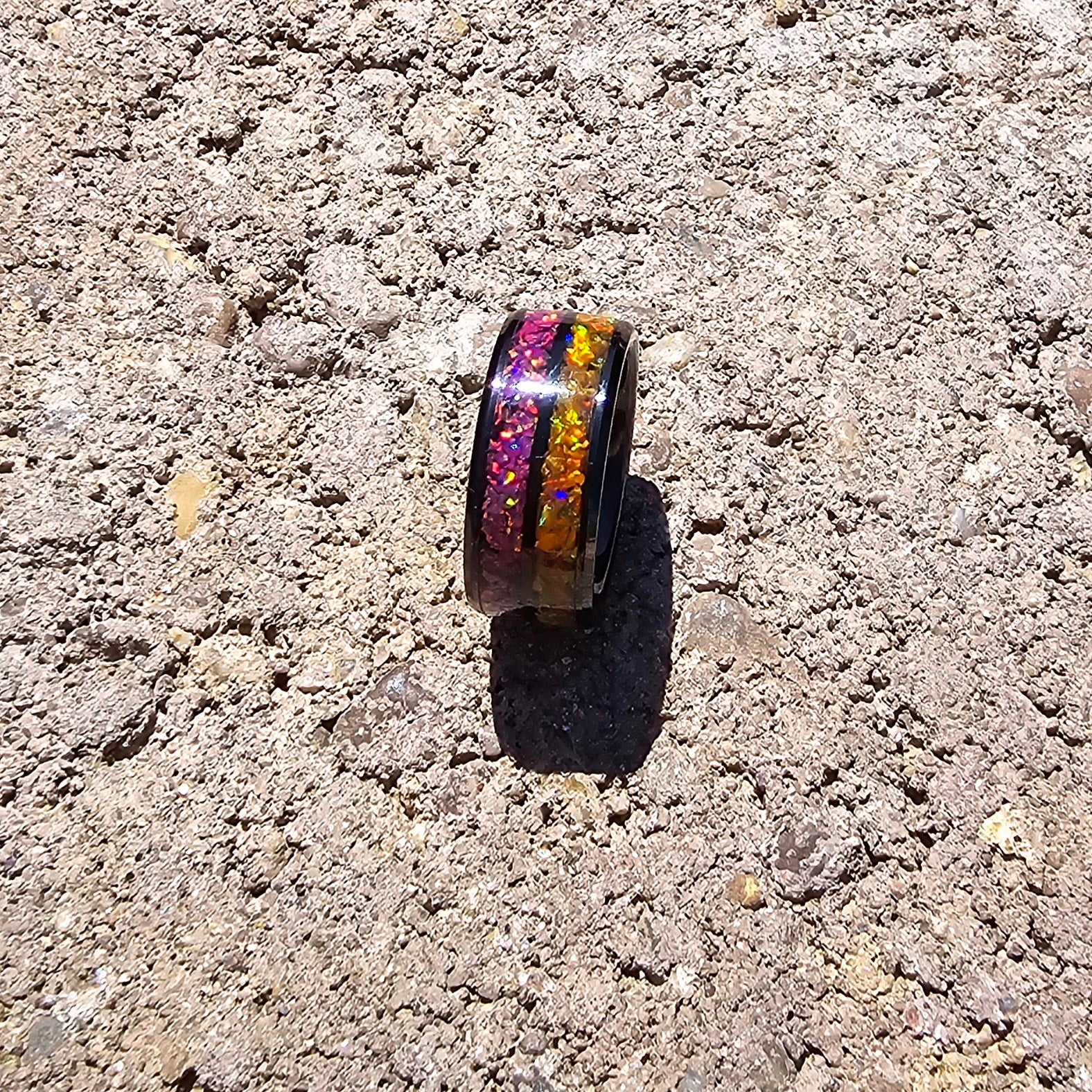 Double channel black ceramic, inlayed with orange and purple opals, size 5
