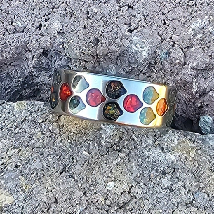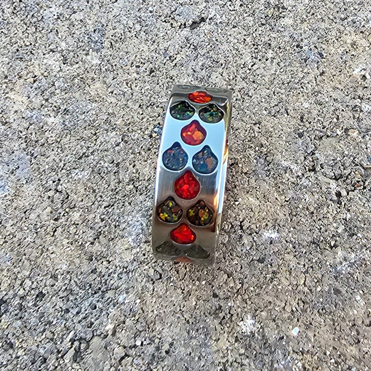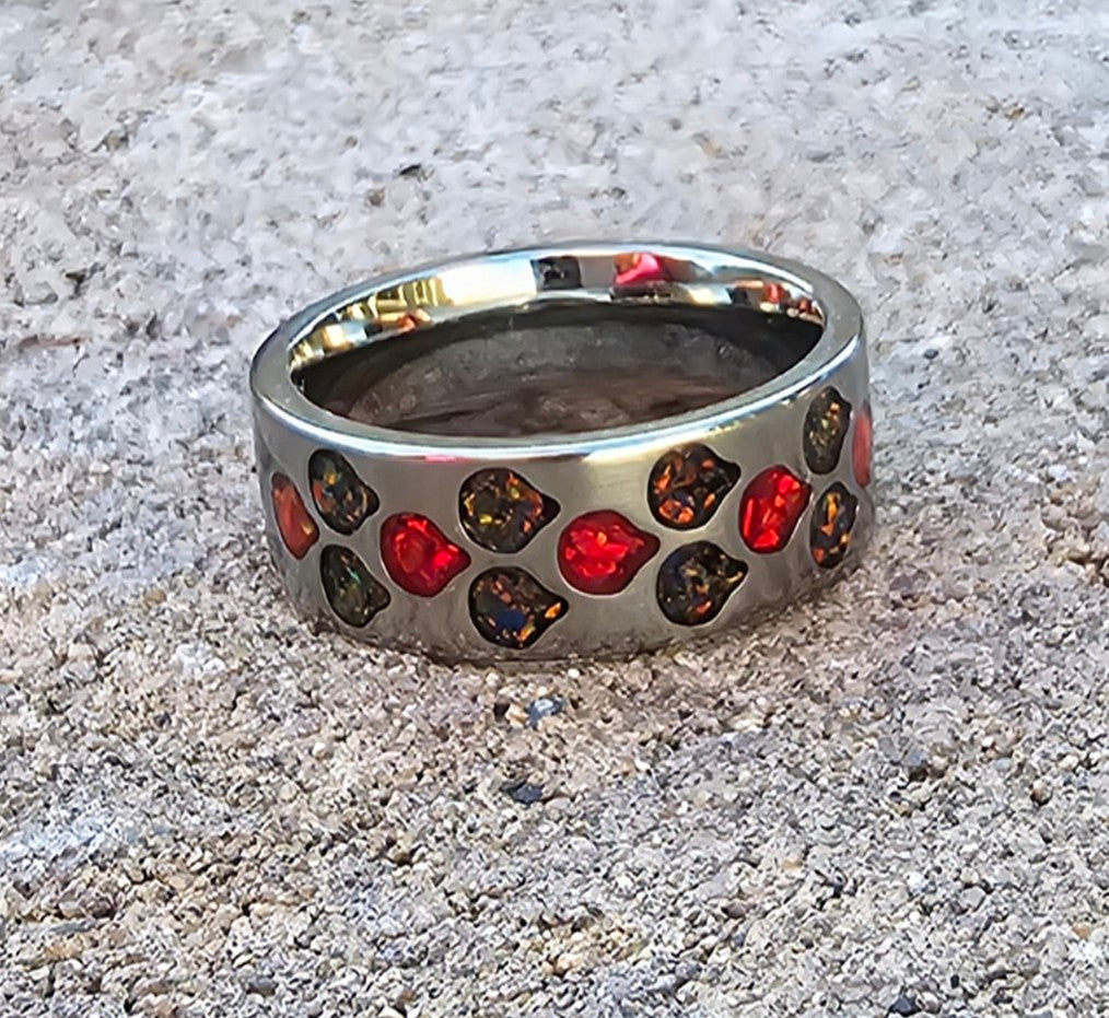 Titanium dragon scale design, inlayed with red and black opals Size 9