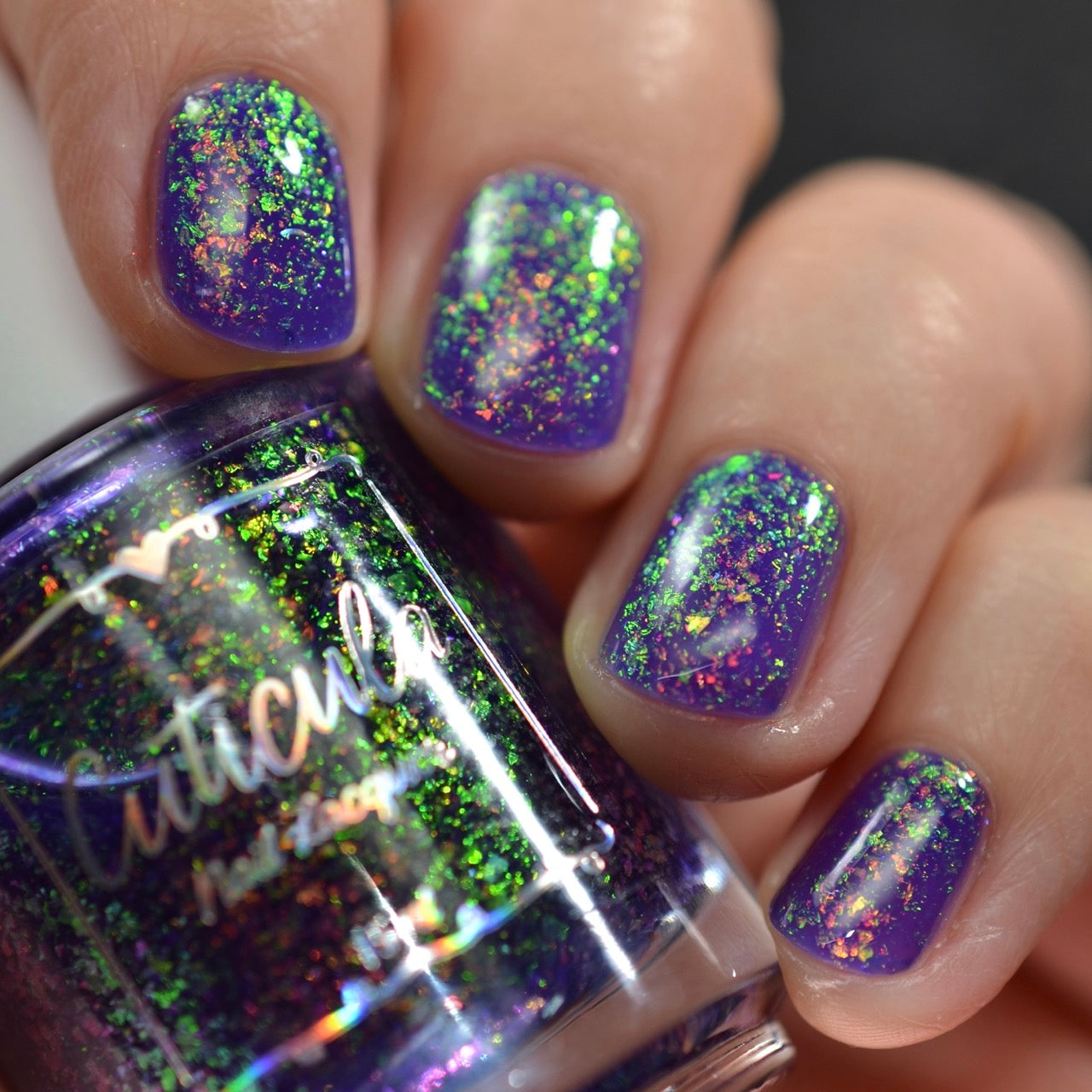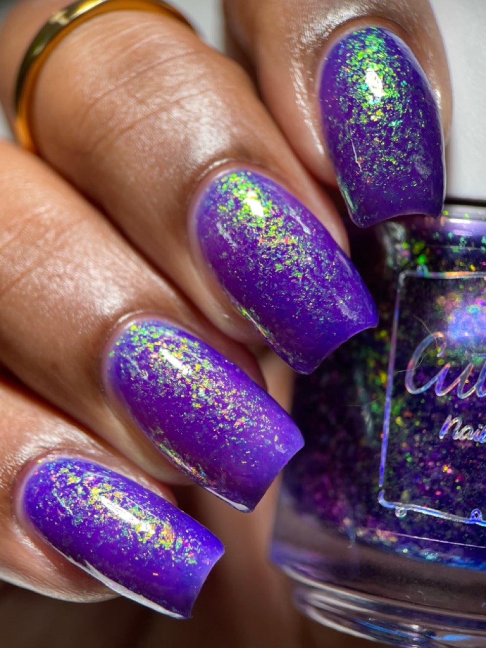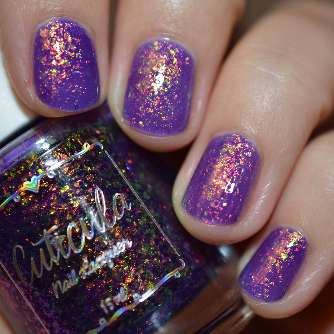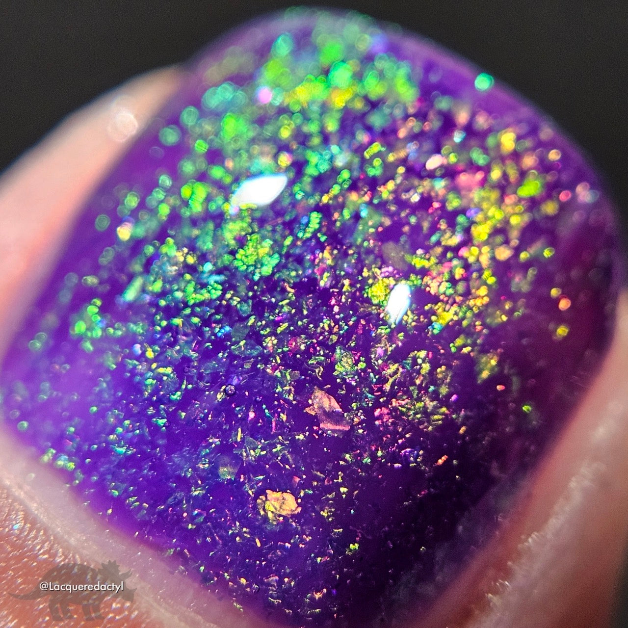 'Flake it till you make it' A bright purple jelly with orange/green/pink shifting iridescent flakes. Photos By: @caitlinswatches @lacqueredactyl @cheyennexodeborah @gaby_polish @mikkelz_nails @polishwithrae @50shadesofdip For best results, start with any of our available base coats and finish off your mani with any of our available top coats. This nail polish is 5 Free: Ingredients: Nitrocellulose, Ethyl Acetate, Butyl Acetate, Isopropyl Alcohol, Ethyl Alcohol, Triphenyl Phosphate, Propyl Acetate, n-Butyl Alcohol, Colorants.
