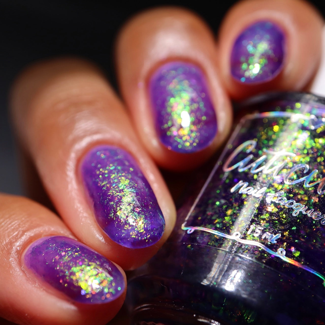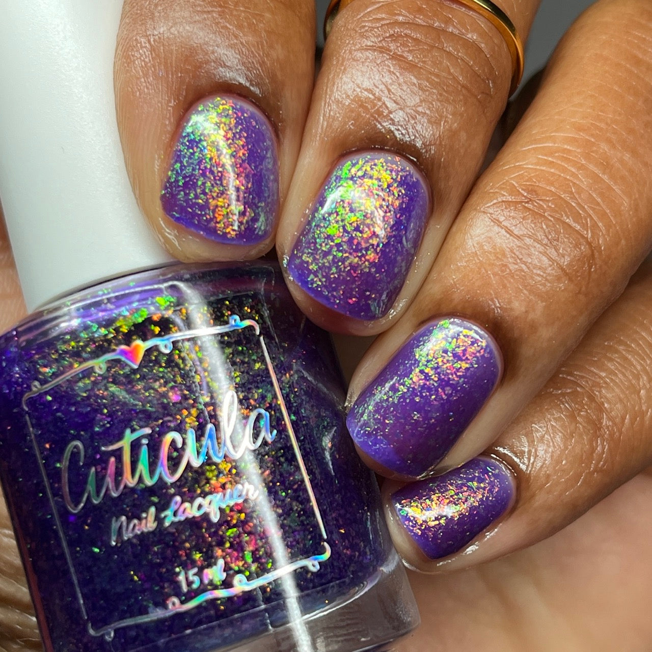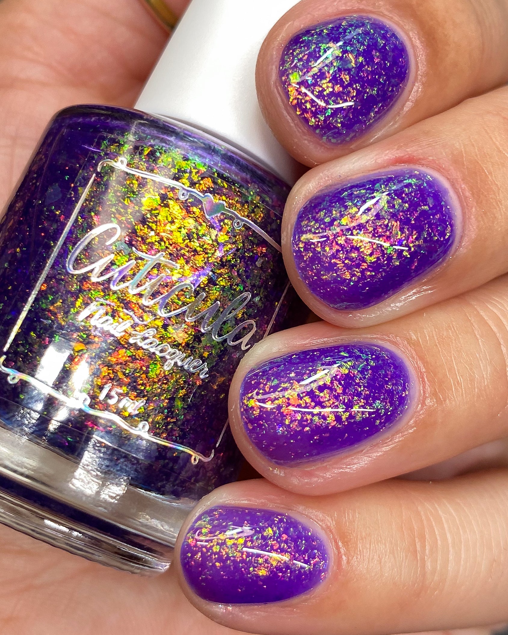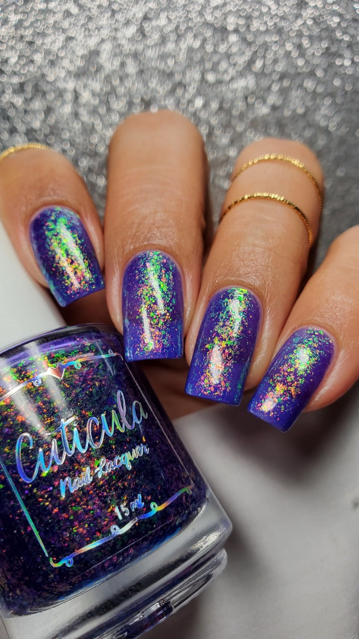 'Flake it till you make it' A bright purple jelly with orange/green/pink shifting iridescent flakes. Photos By: @caitlinswatches @lacqueredactyl @cheyennexodeborah @gaby_polish @mikkelz_nails @polishwithrae @50shadesofdip For best results, start with any of our available base coats and finish off your mani with any of our available top coats. This nail polish is 5 Free: Ingredients: Nitrocellulose, Ethyl Acetate, Butyl Acetate, Isopropyl Alcohol, Ethyl Alcohol, Triphenyl Phosphate, Propyl Acetate, n-Butyl Alcohol, Colorants.