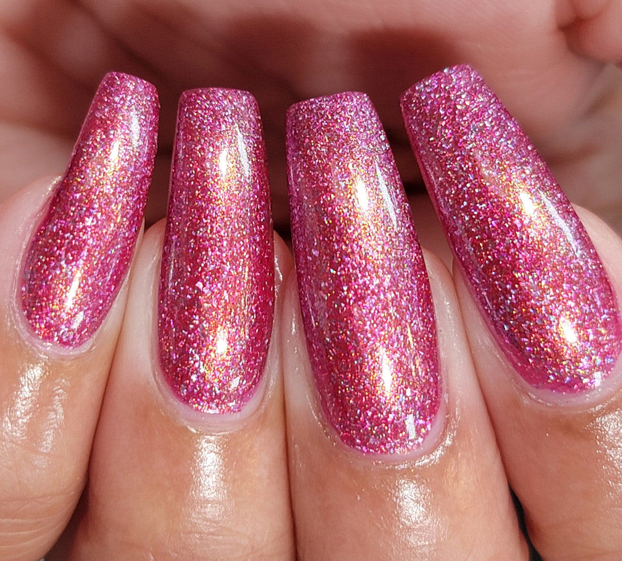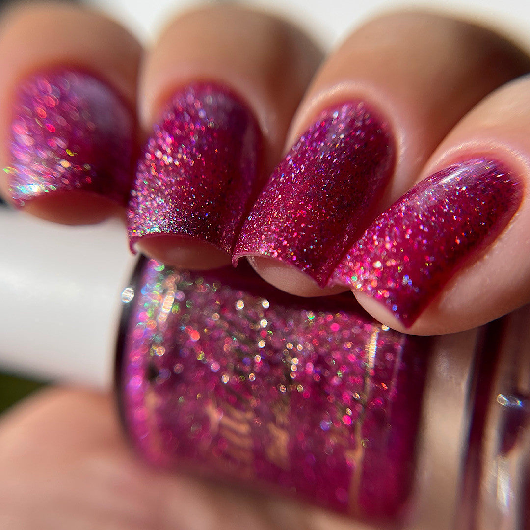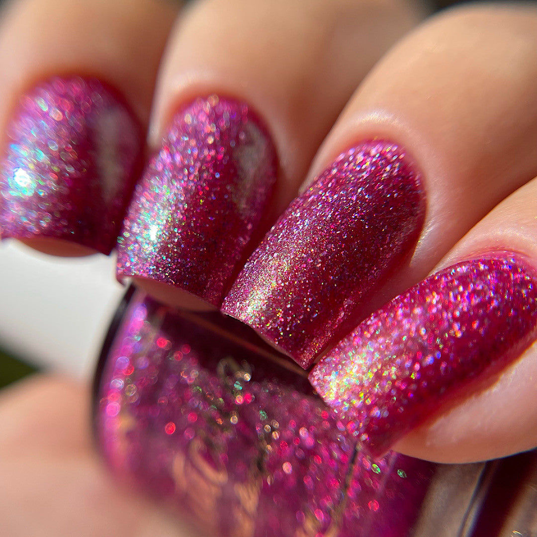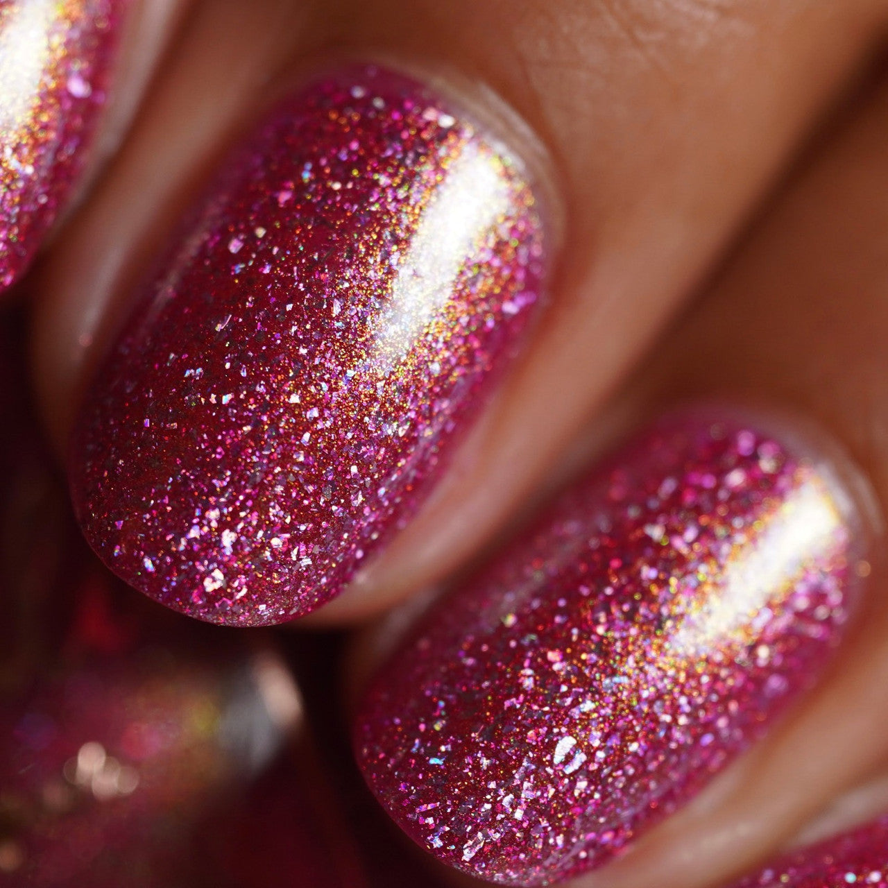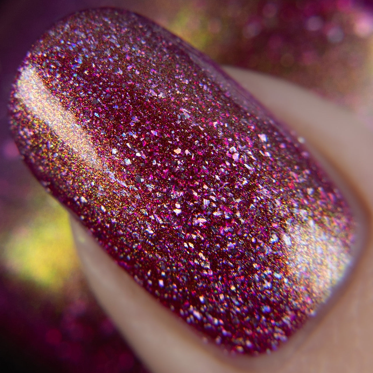 A bright fuchsia base with purple/gold/green shifting shimmer and a dash of silver holographic flakes.