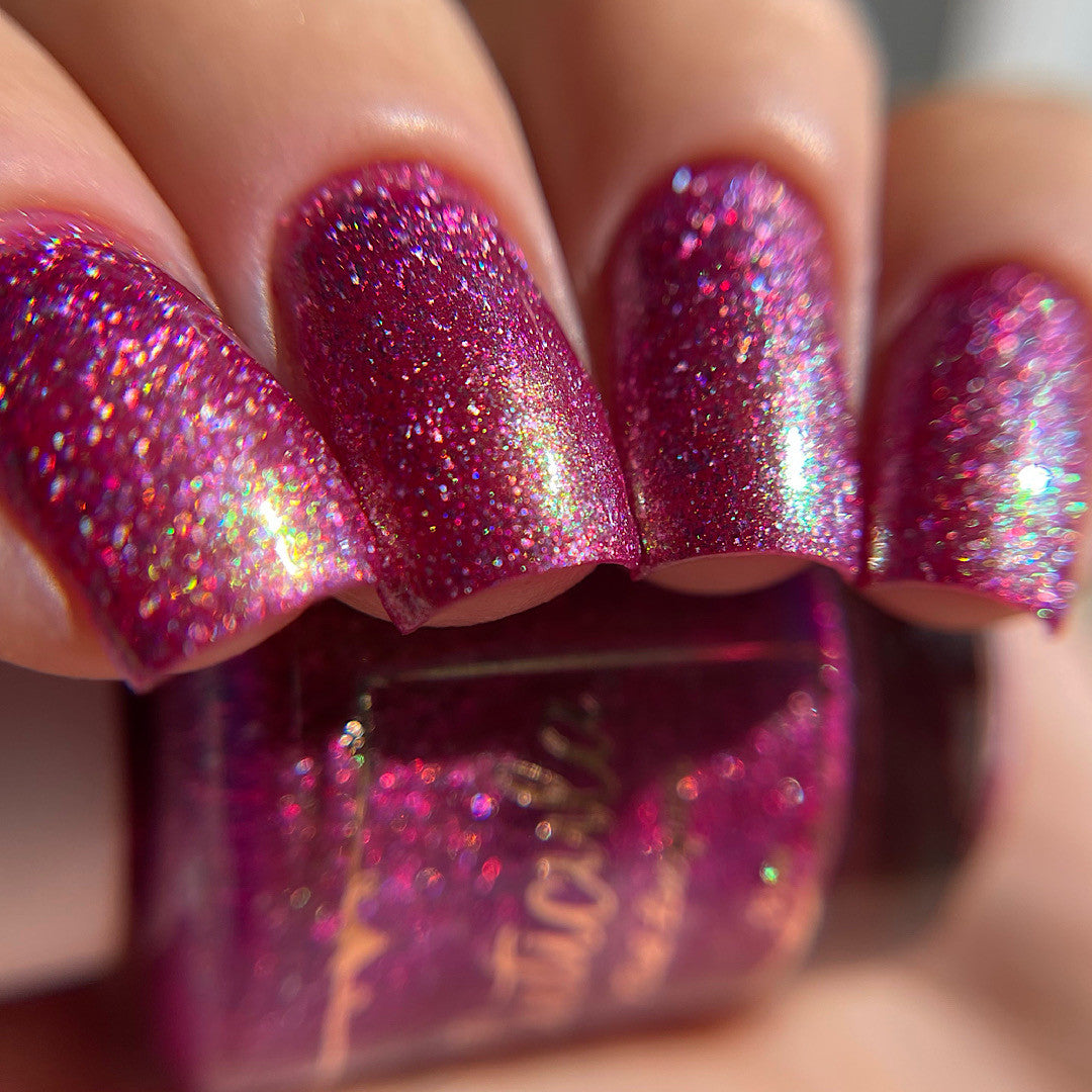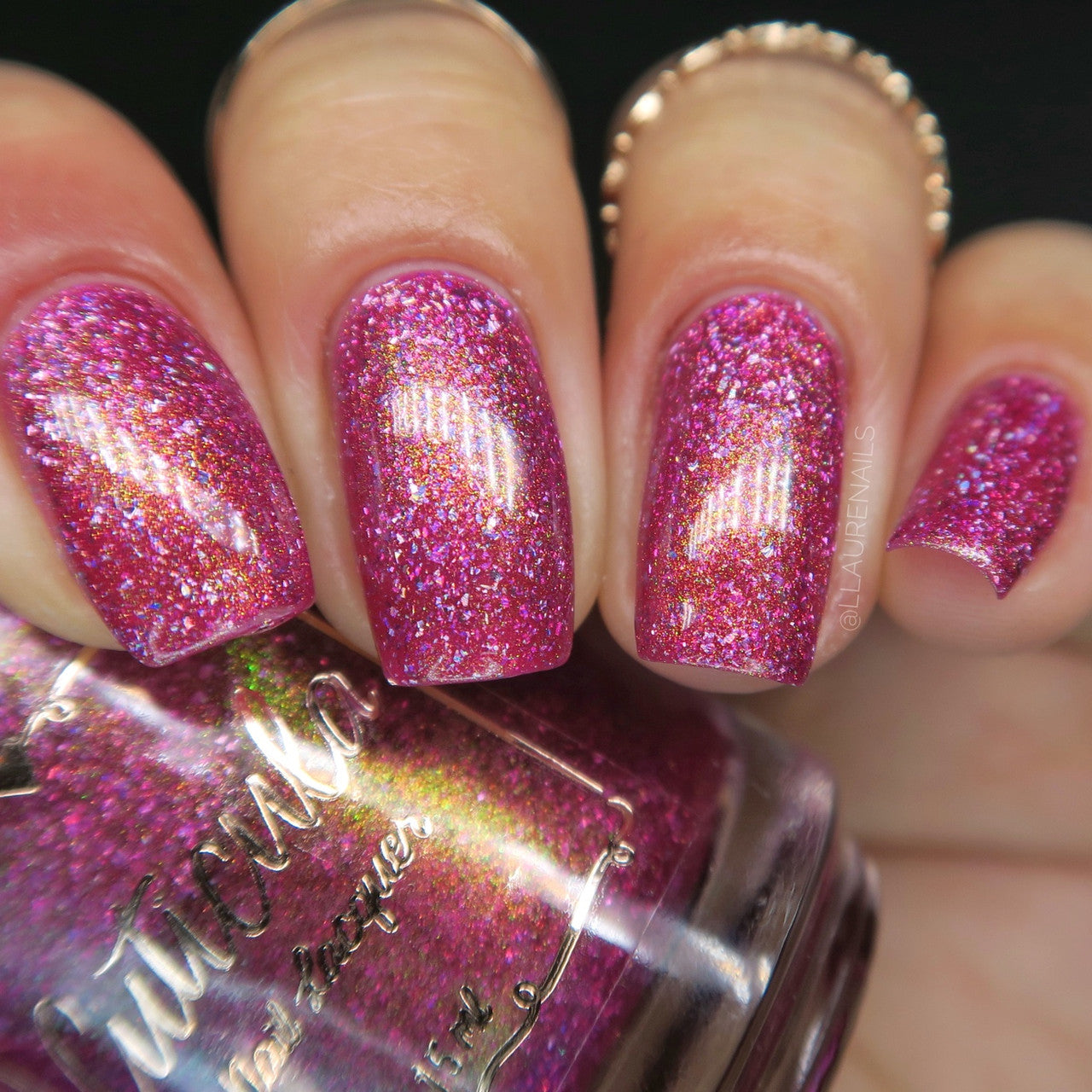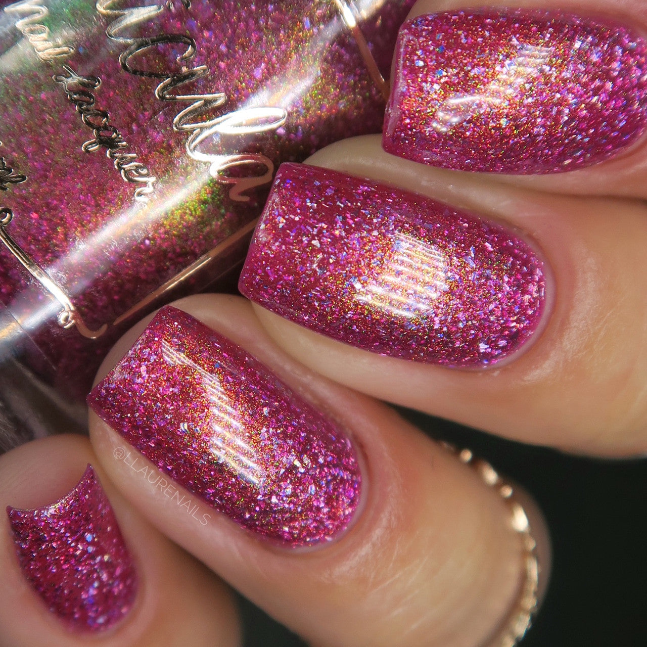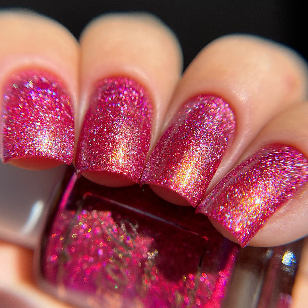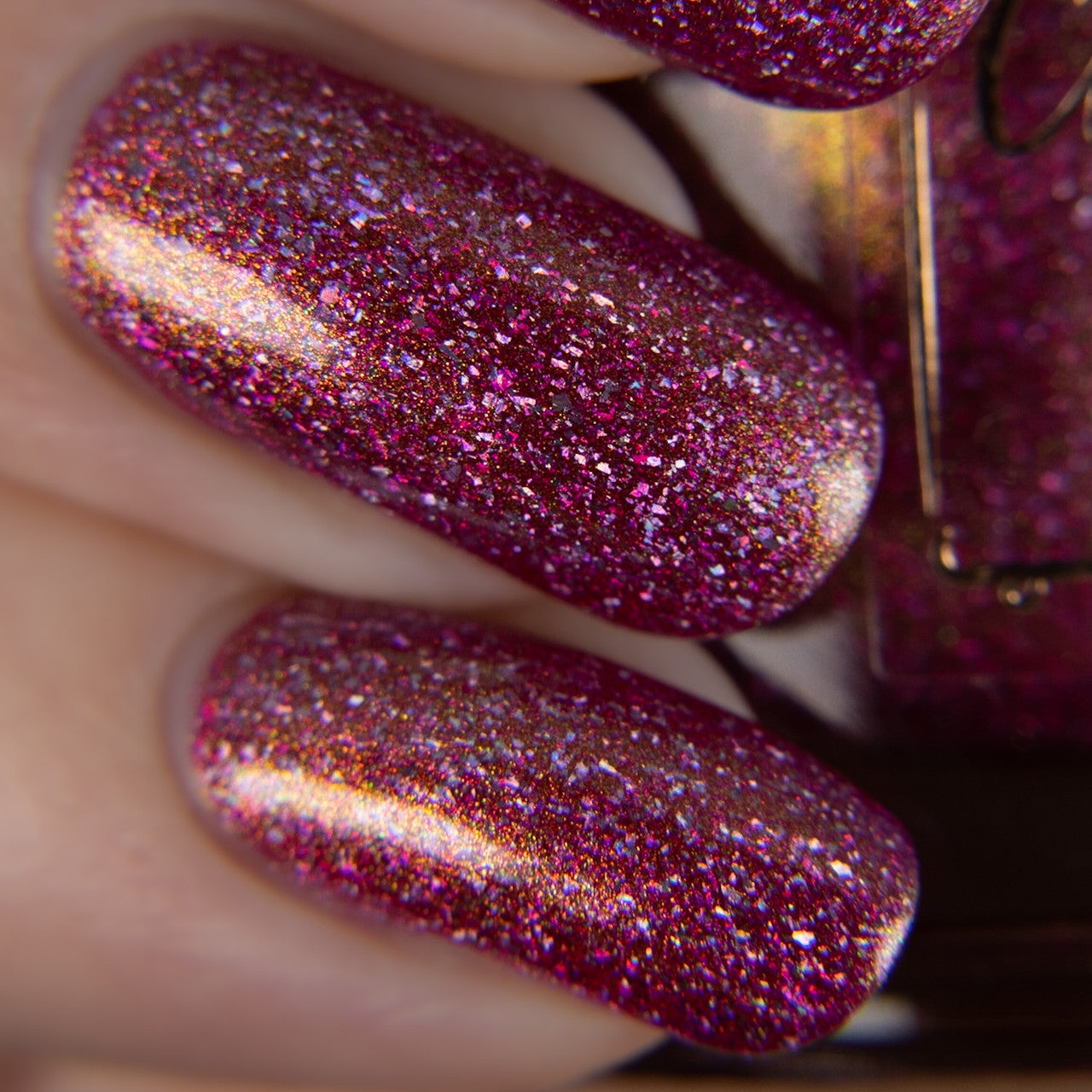 A bright fuchsia base with purple/gold/green shifting shimmer and a dash of silver holographic flakes.
