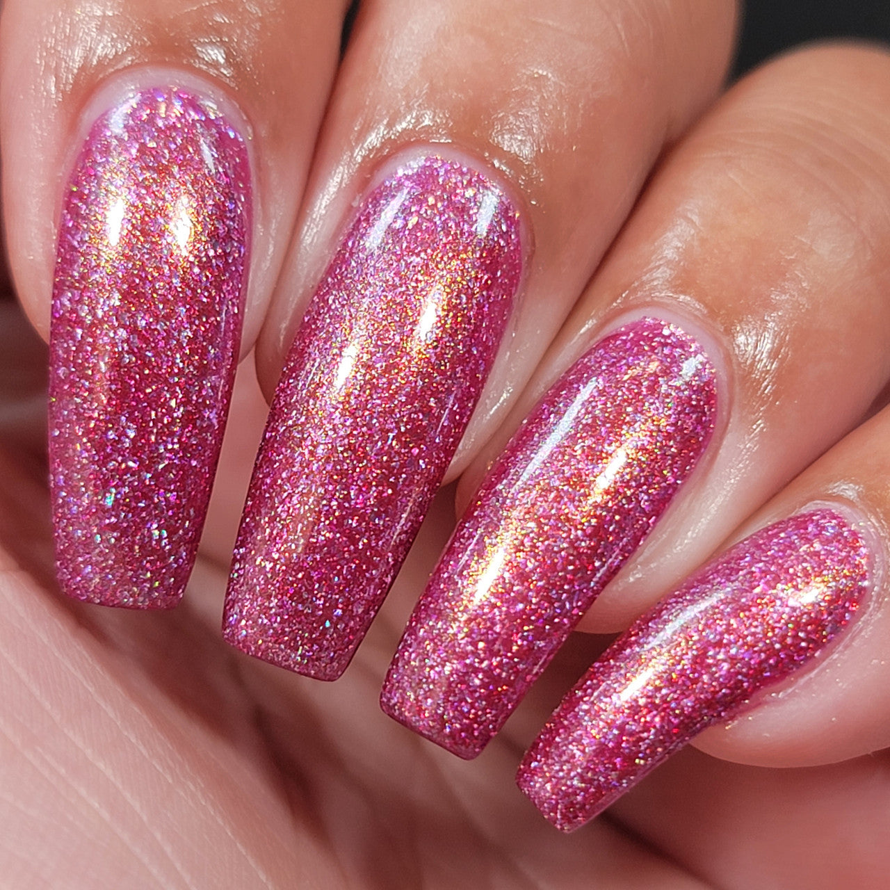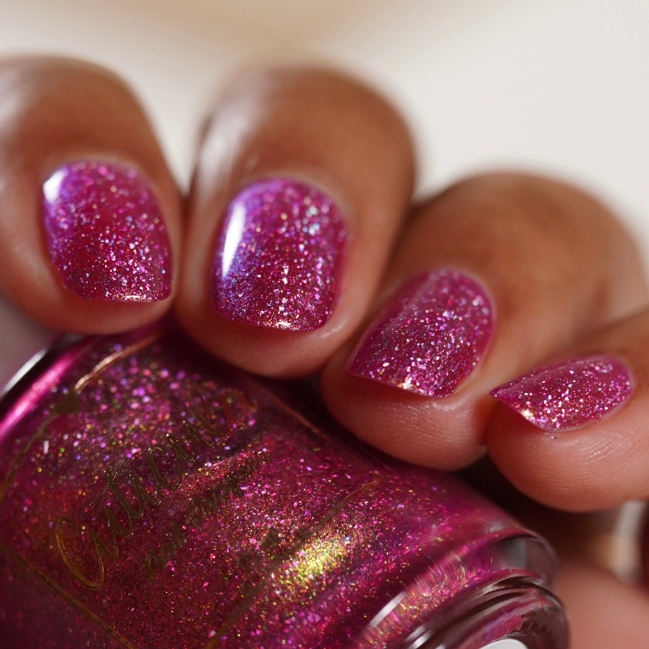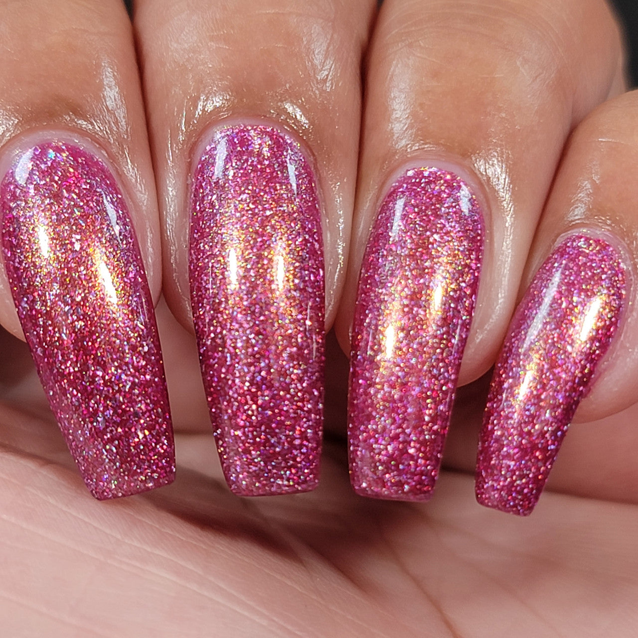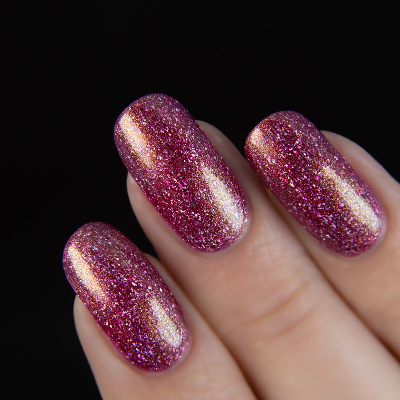 A bright fuchsia base with purple/gold/green shifting shimmer and a dash of silver holographic flakes.