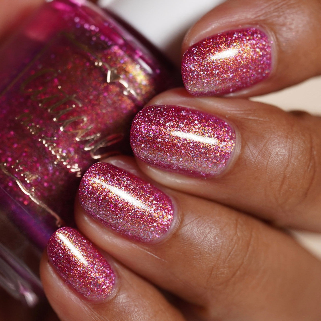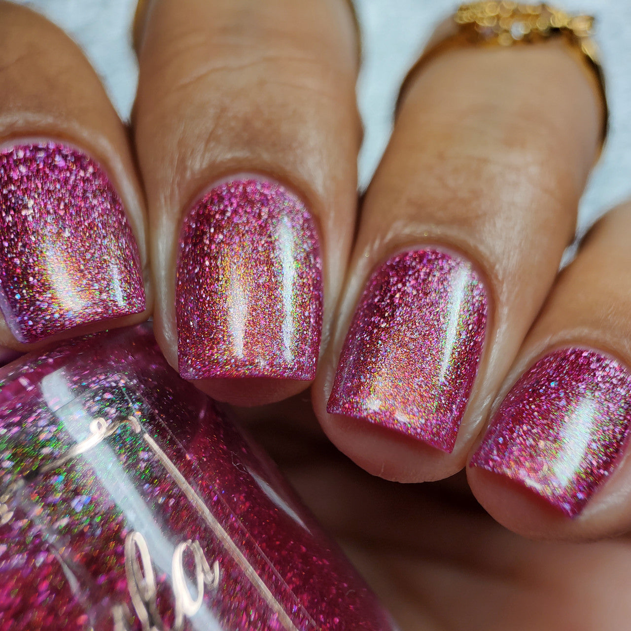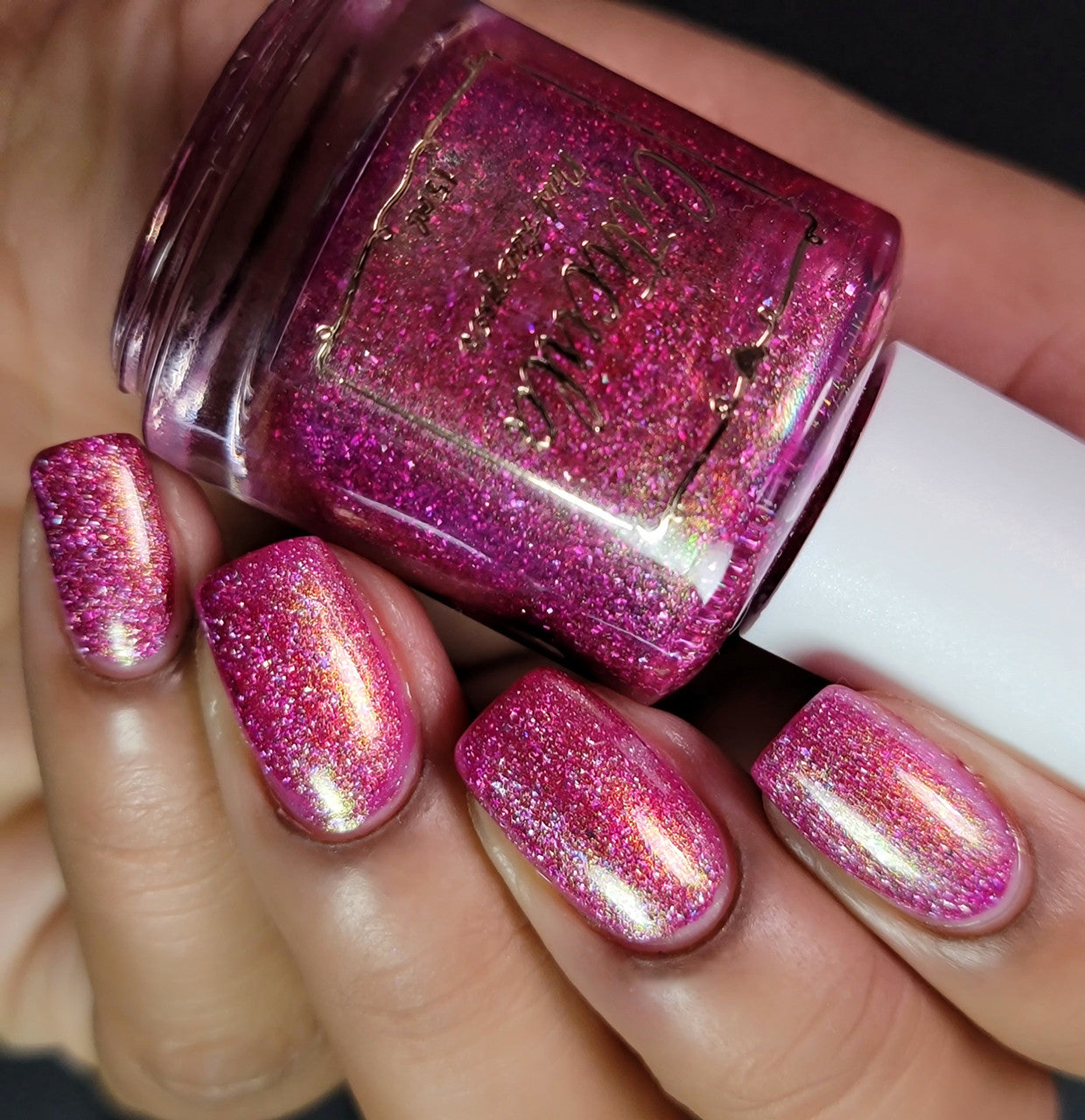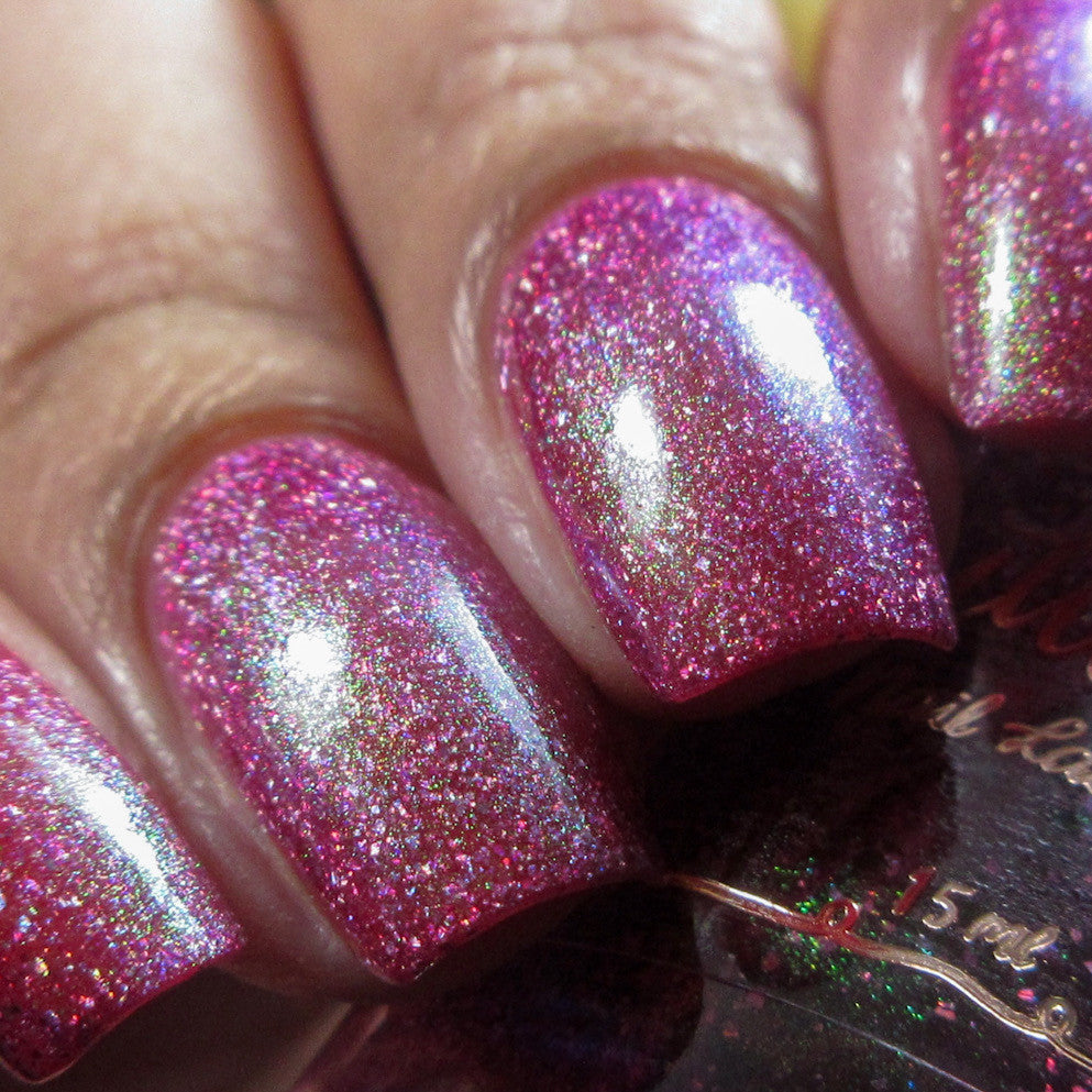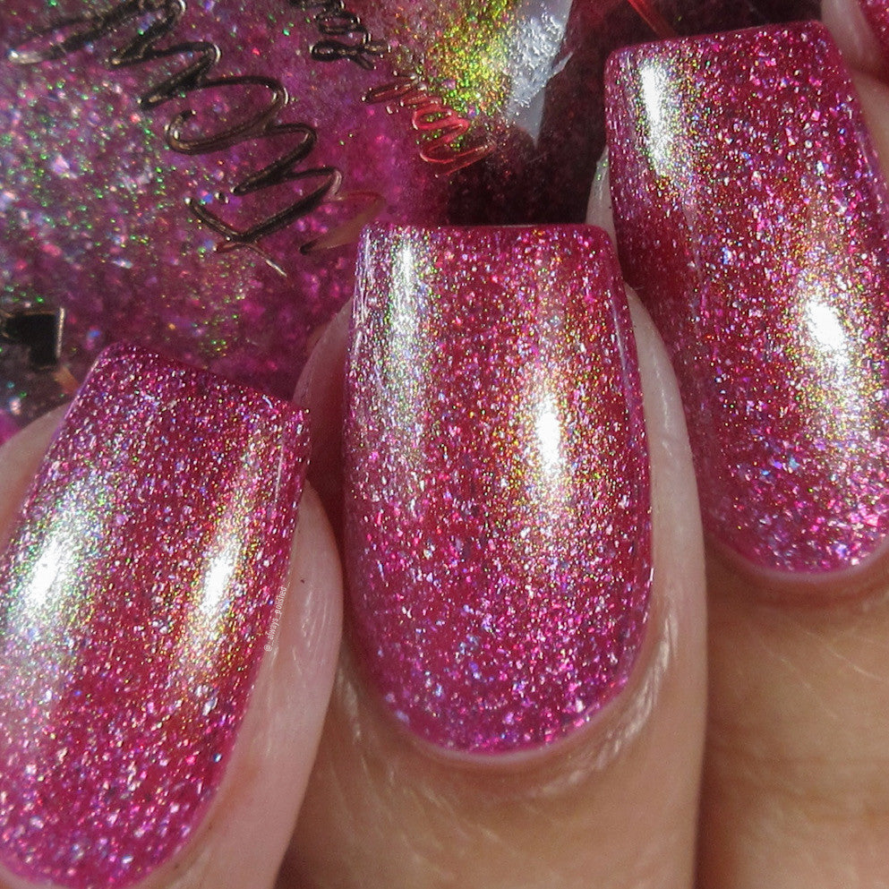 A bright fuchsia base with purple/gold/green shifting shimmer and a dash of silver holographic flakes.