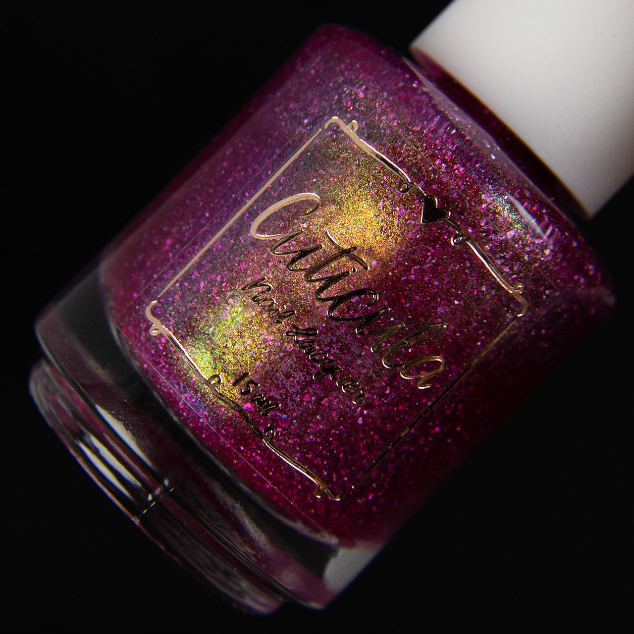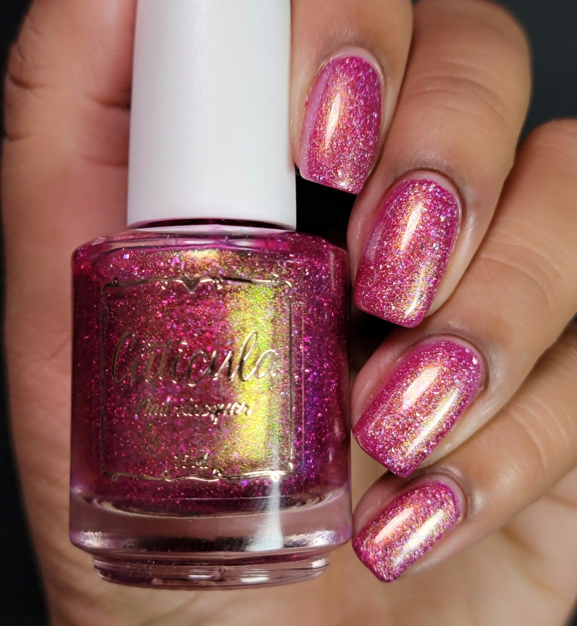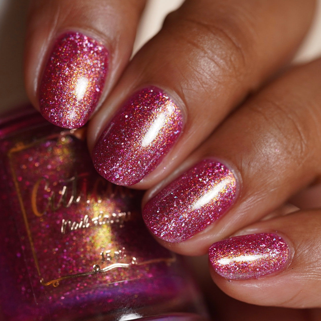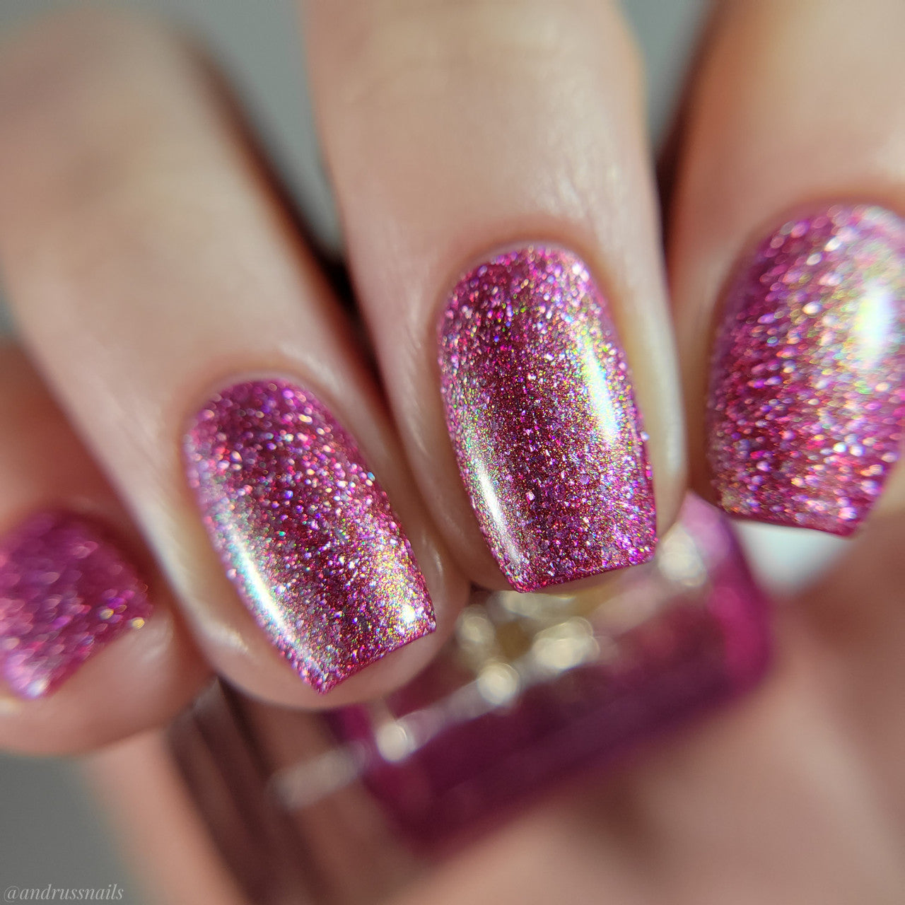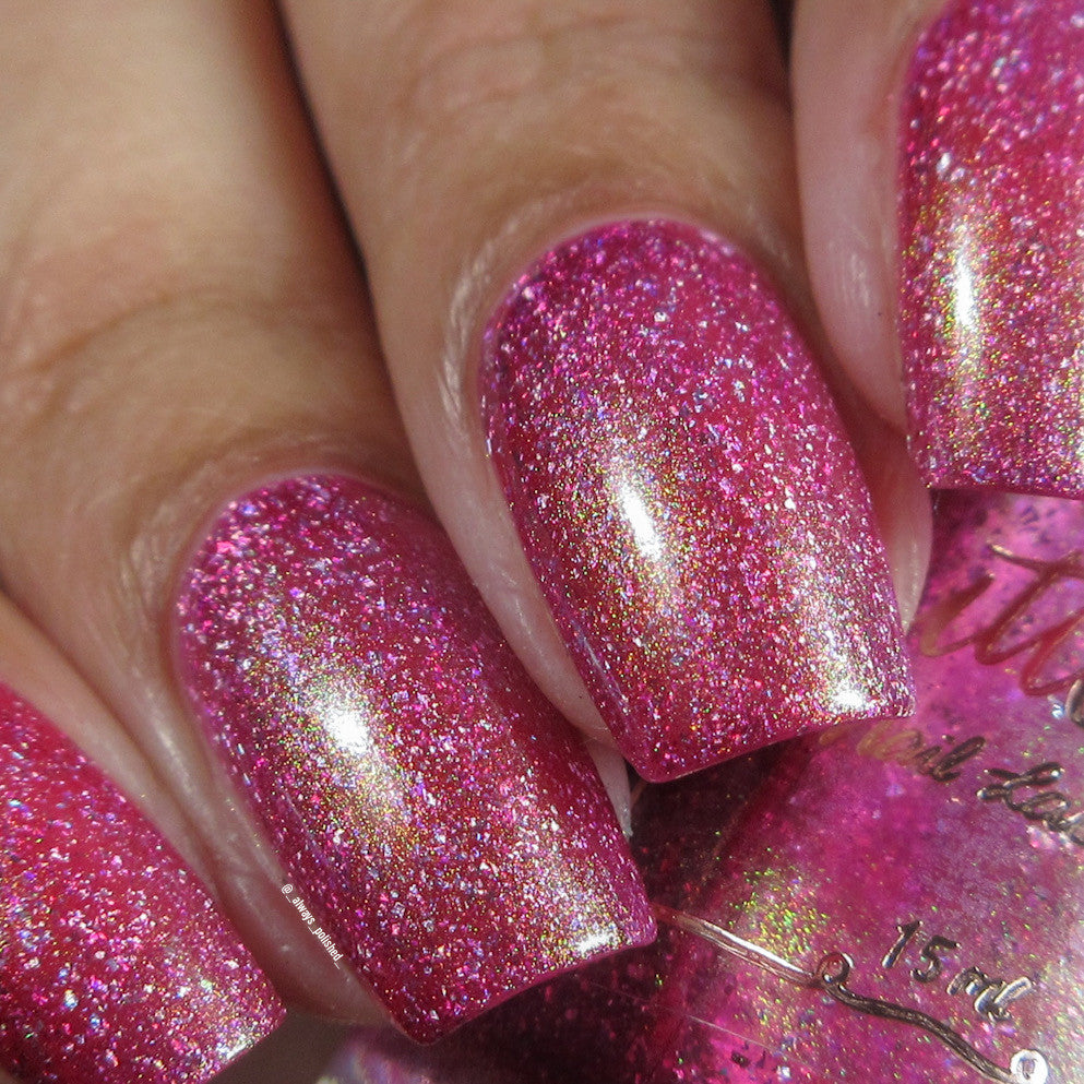A bright fuchsia base with purple/gold/green shifting shimmer and a dash of silver holographic flakes.