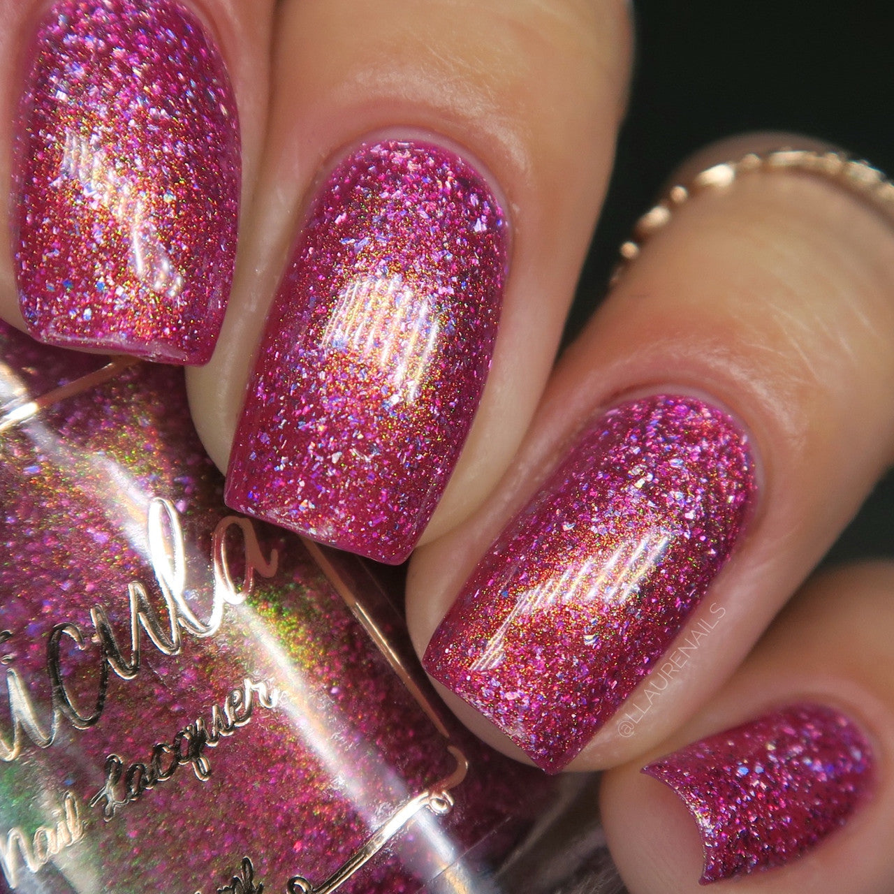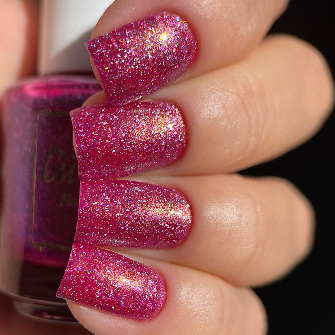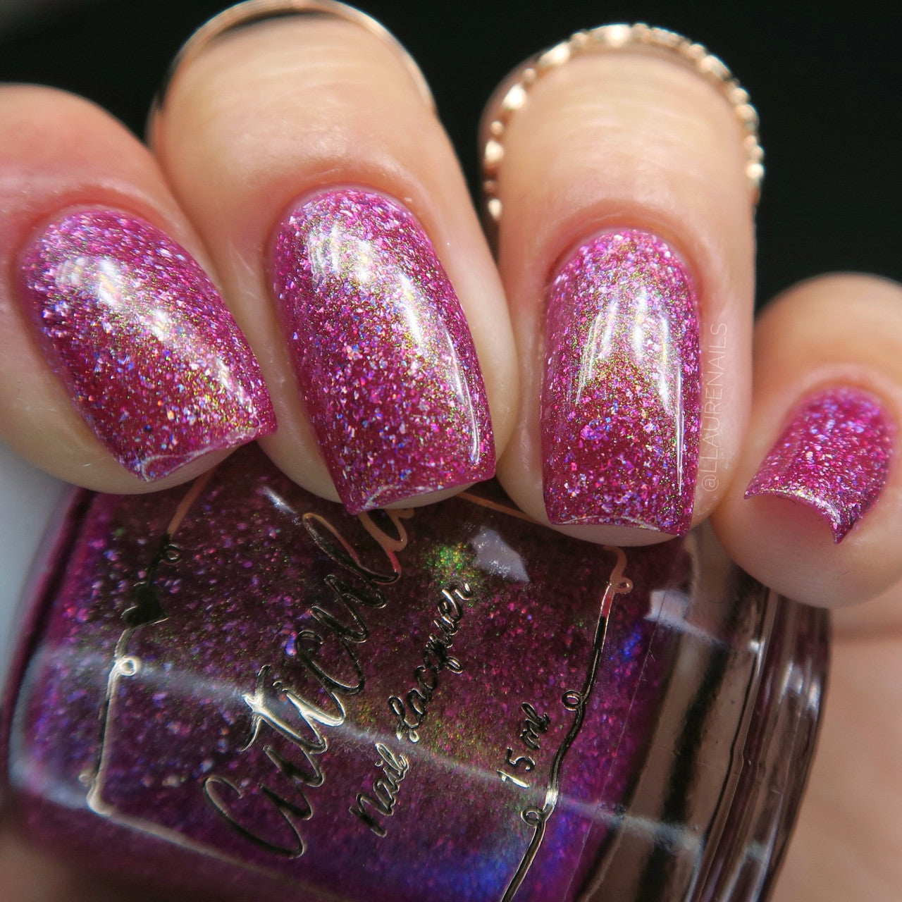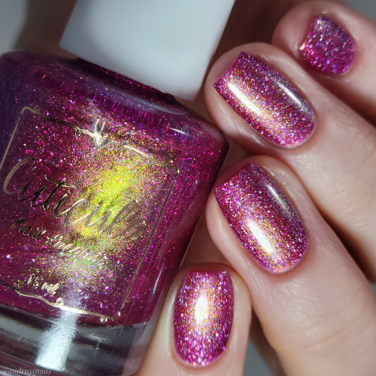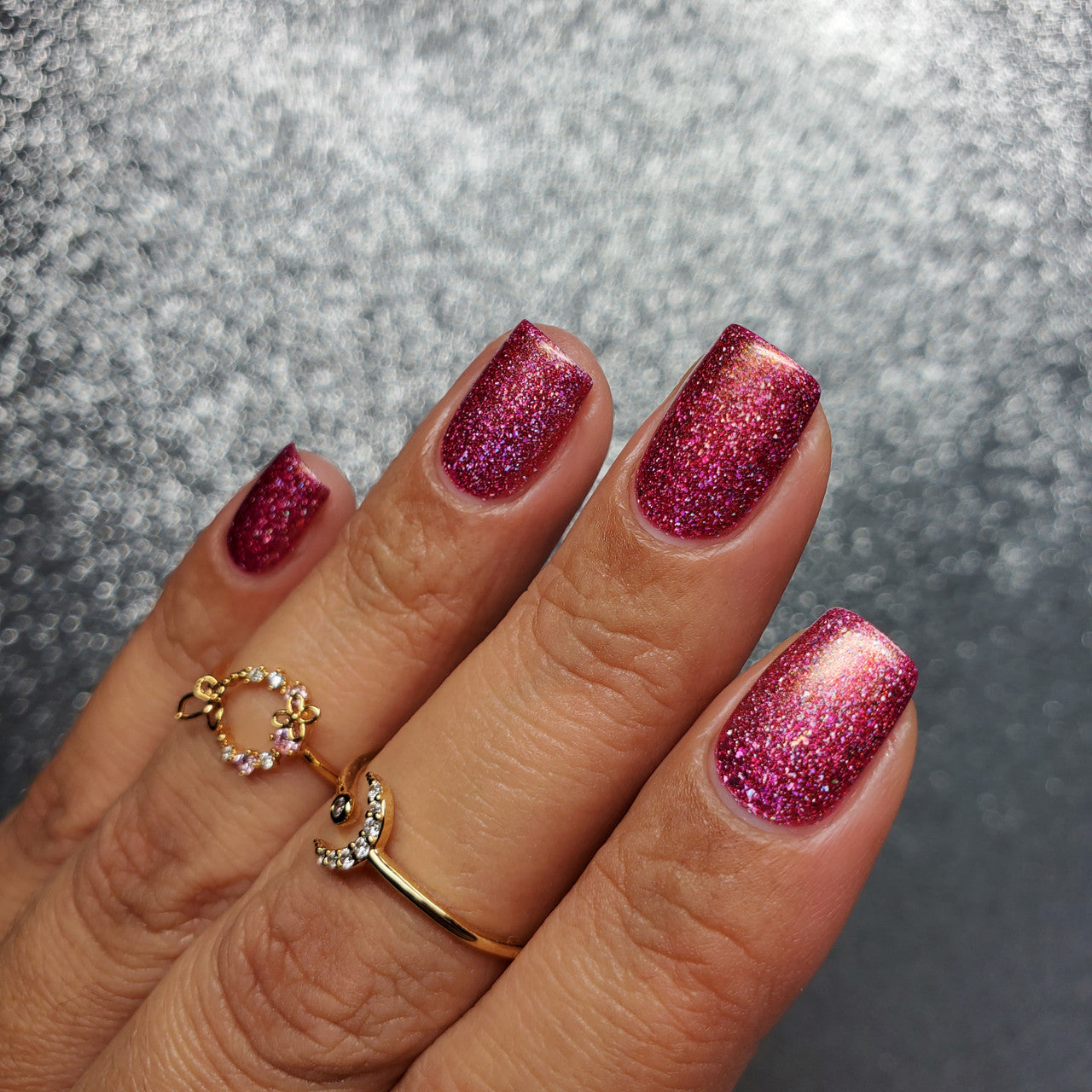 A bright fuchsia base with purple/gold/green shifting shimmer and a dash of silver holographic flakes.