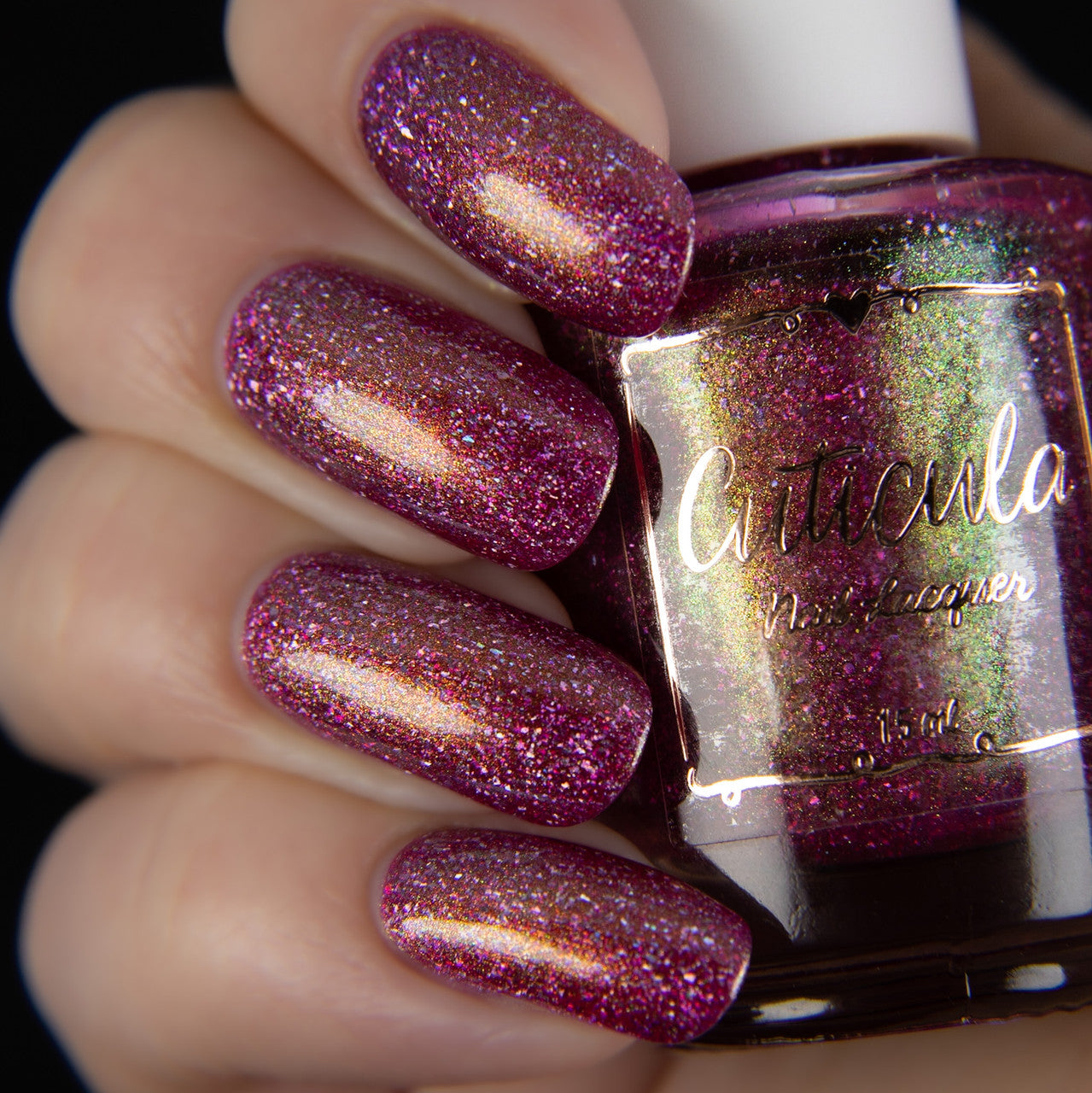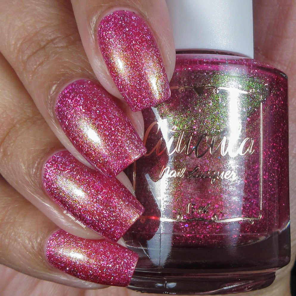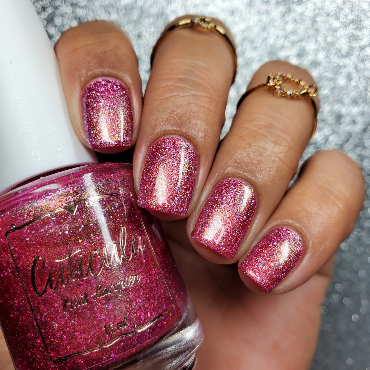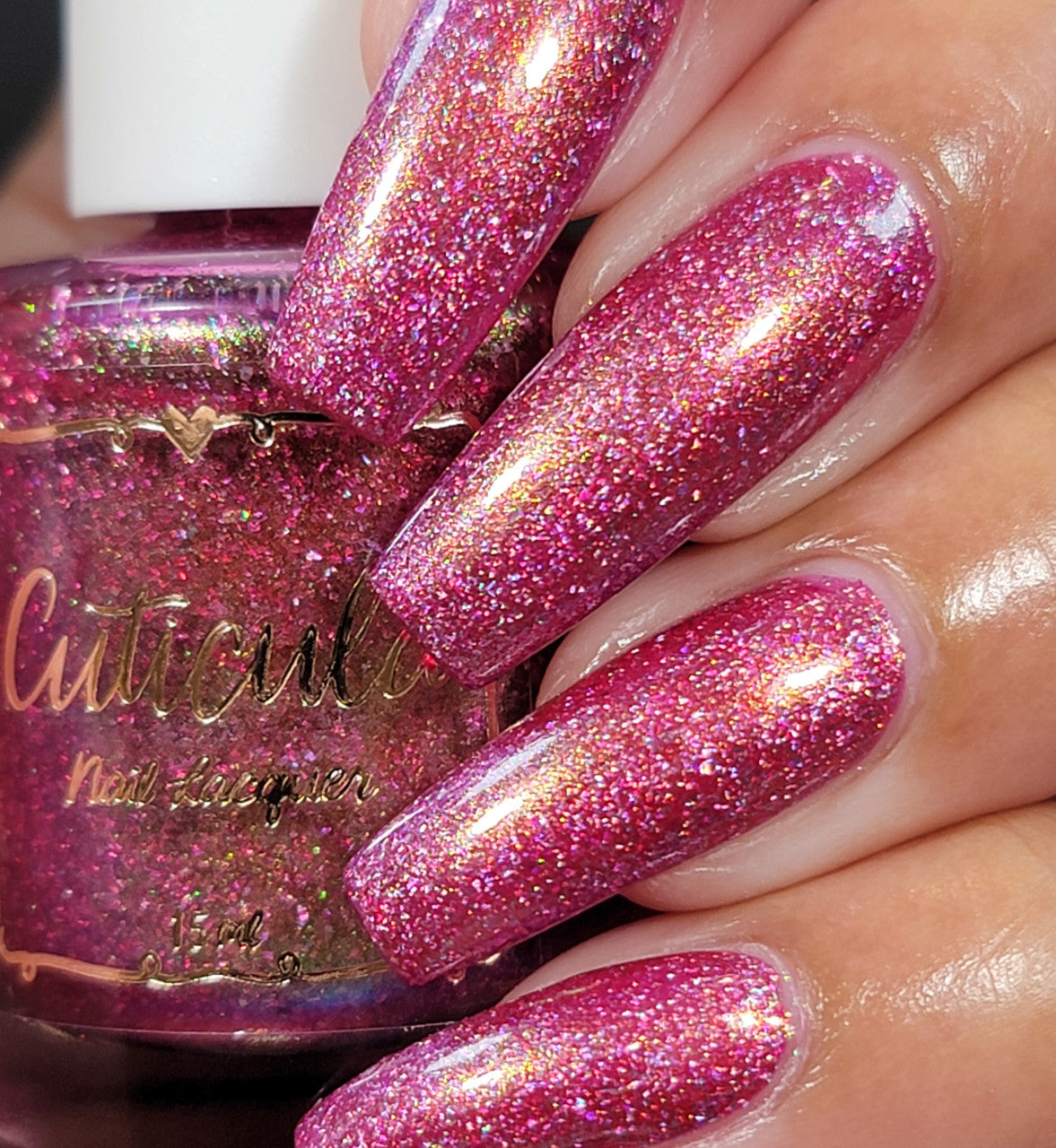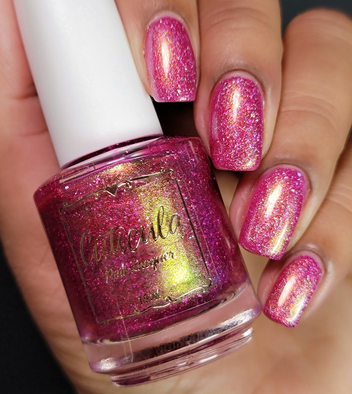 A bright fuchsia base with purple/gold/green shifting shimmer and a dash of silver holographic flakes.