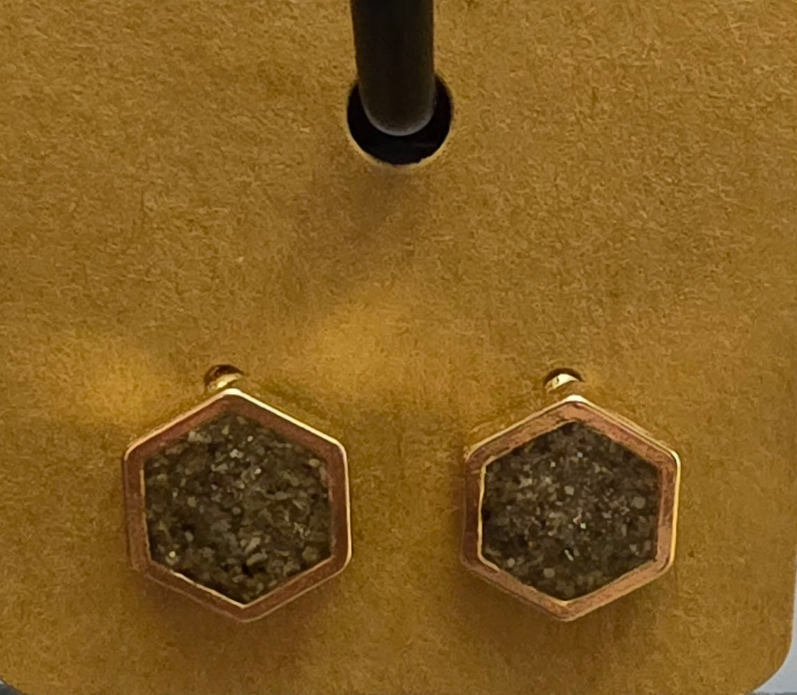Gold finished stainless steel post earrings, hexagon shape, inlayed with sand and diamond dust