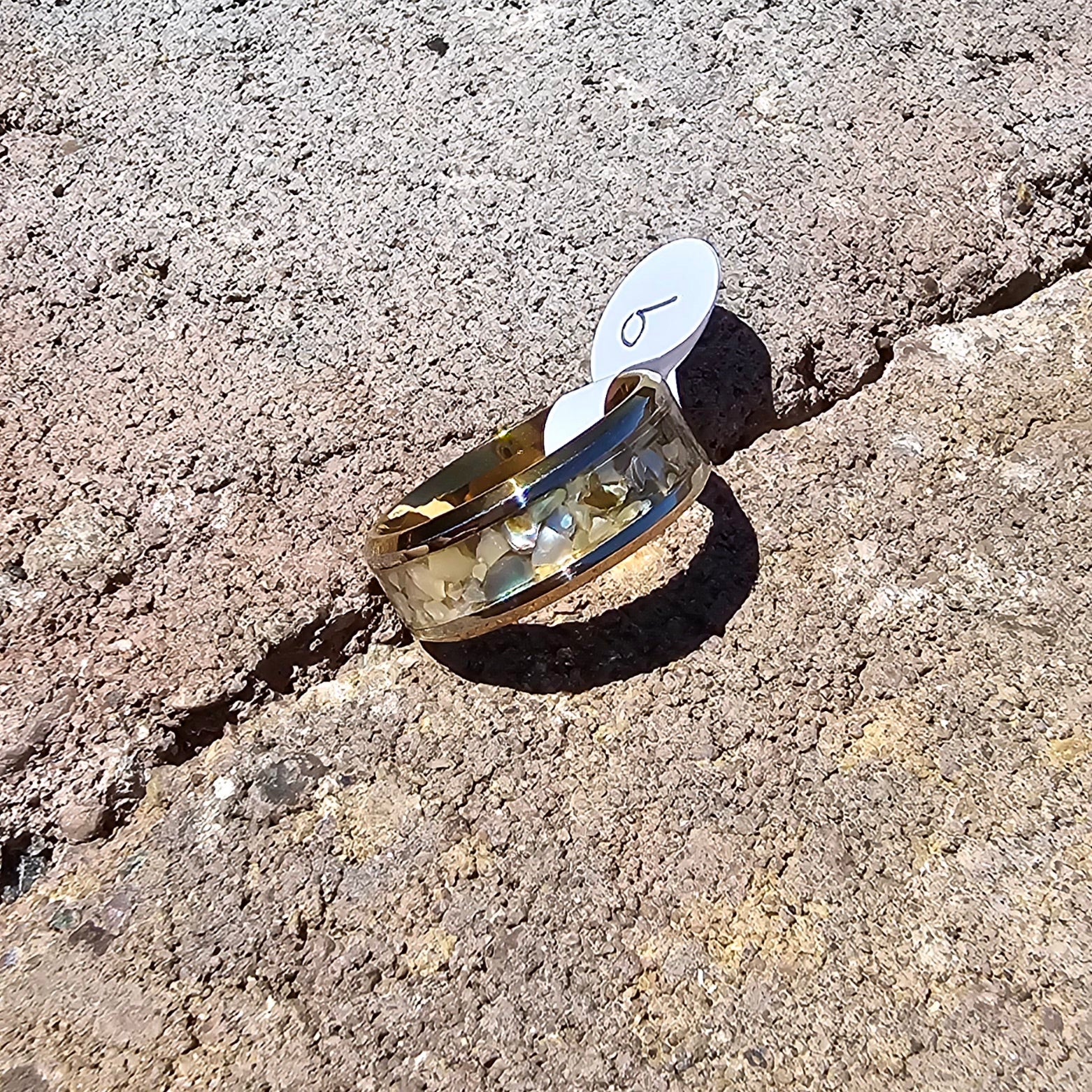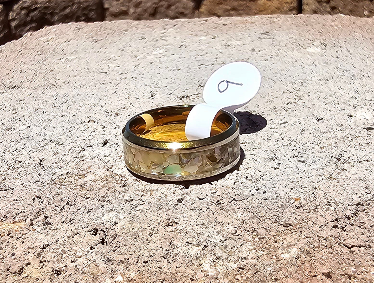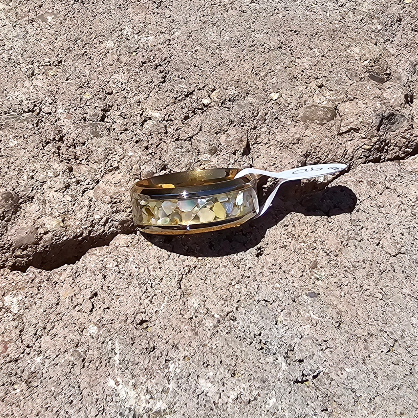 8mm gold finished stainless steel, inlayed with abalone, size 9
