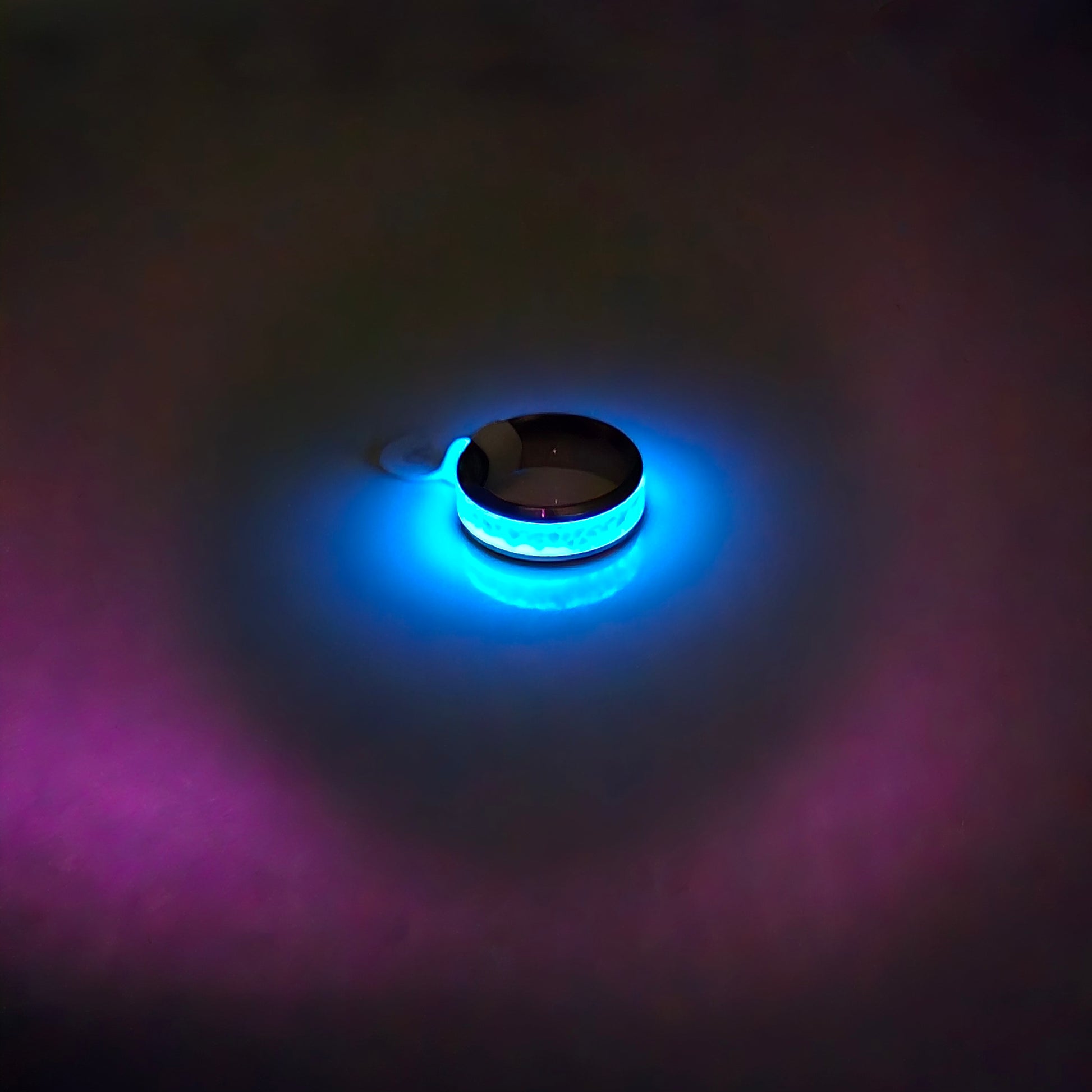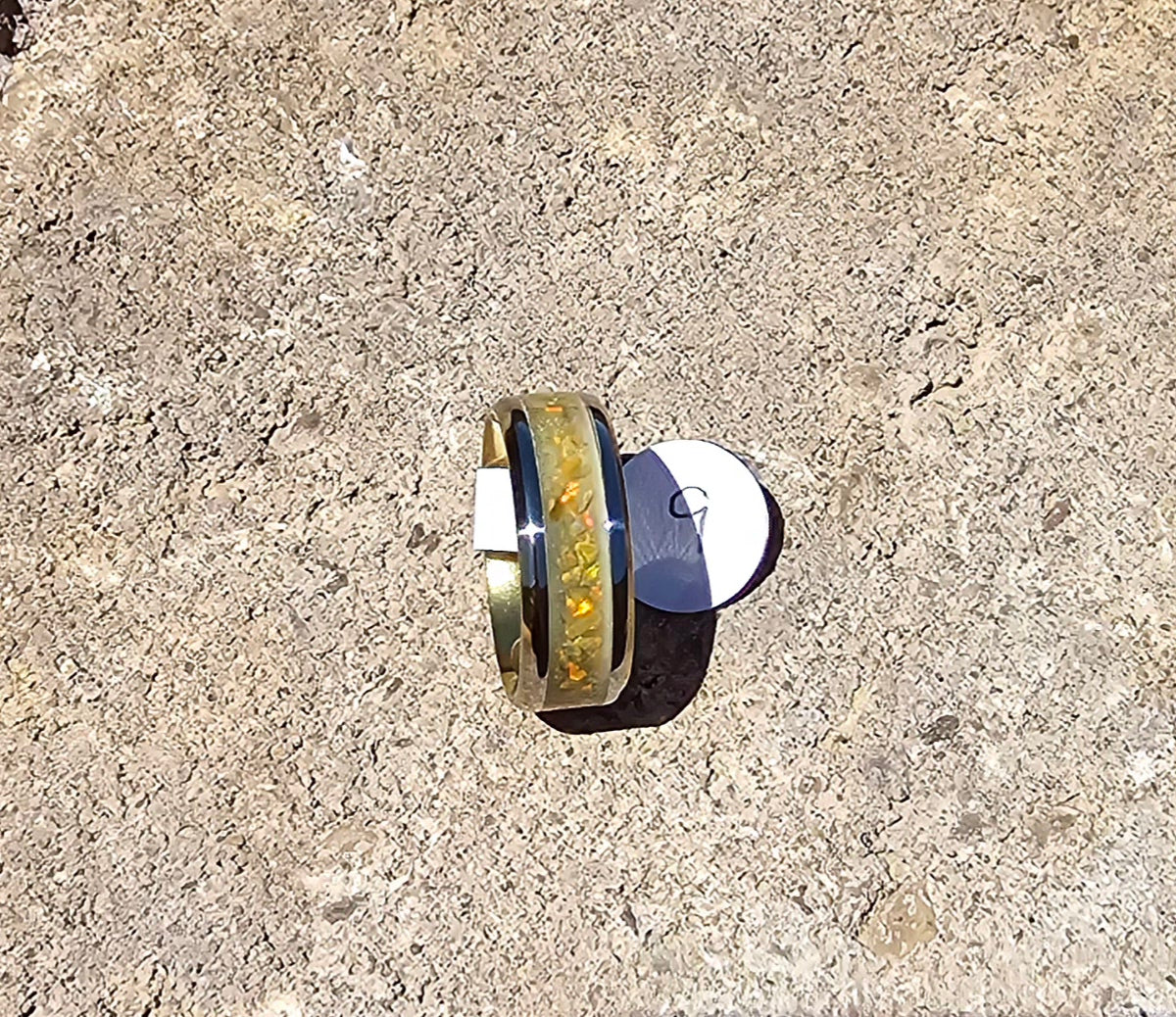 8mm stainless steel, gold finished liner, inlayed with gold opals and blue glow, size 9