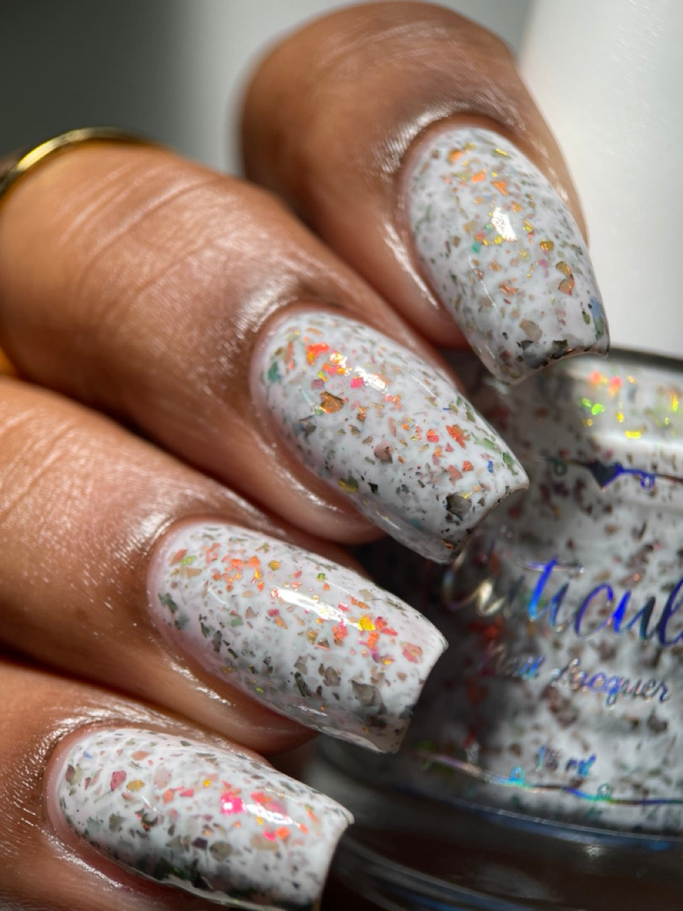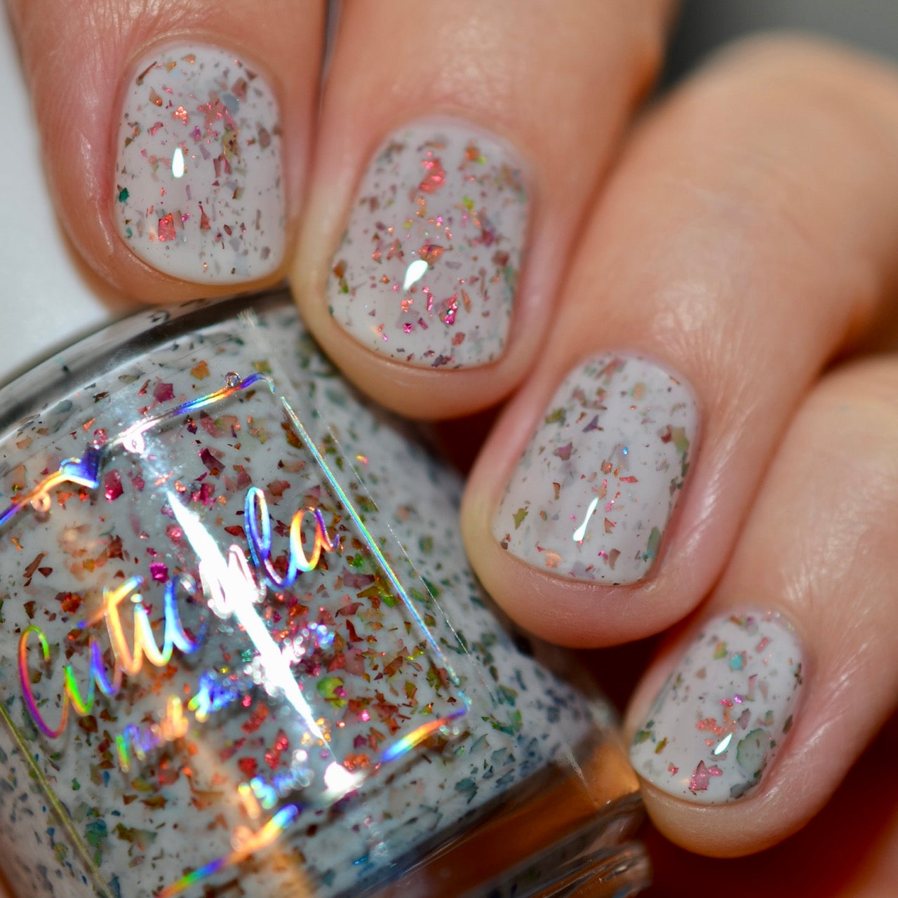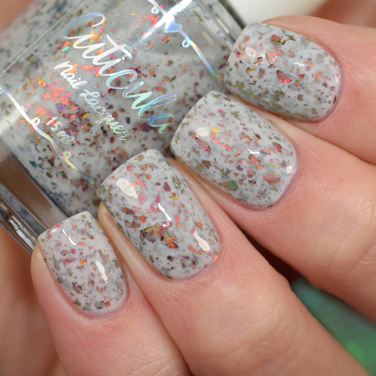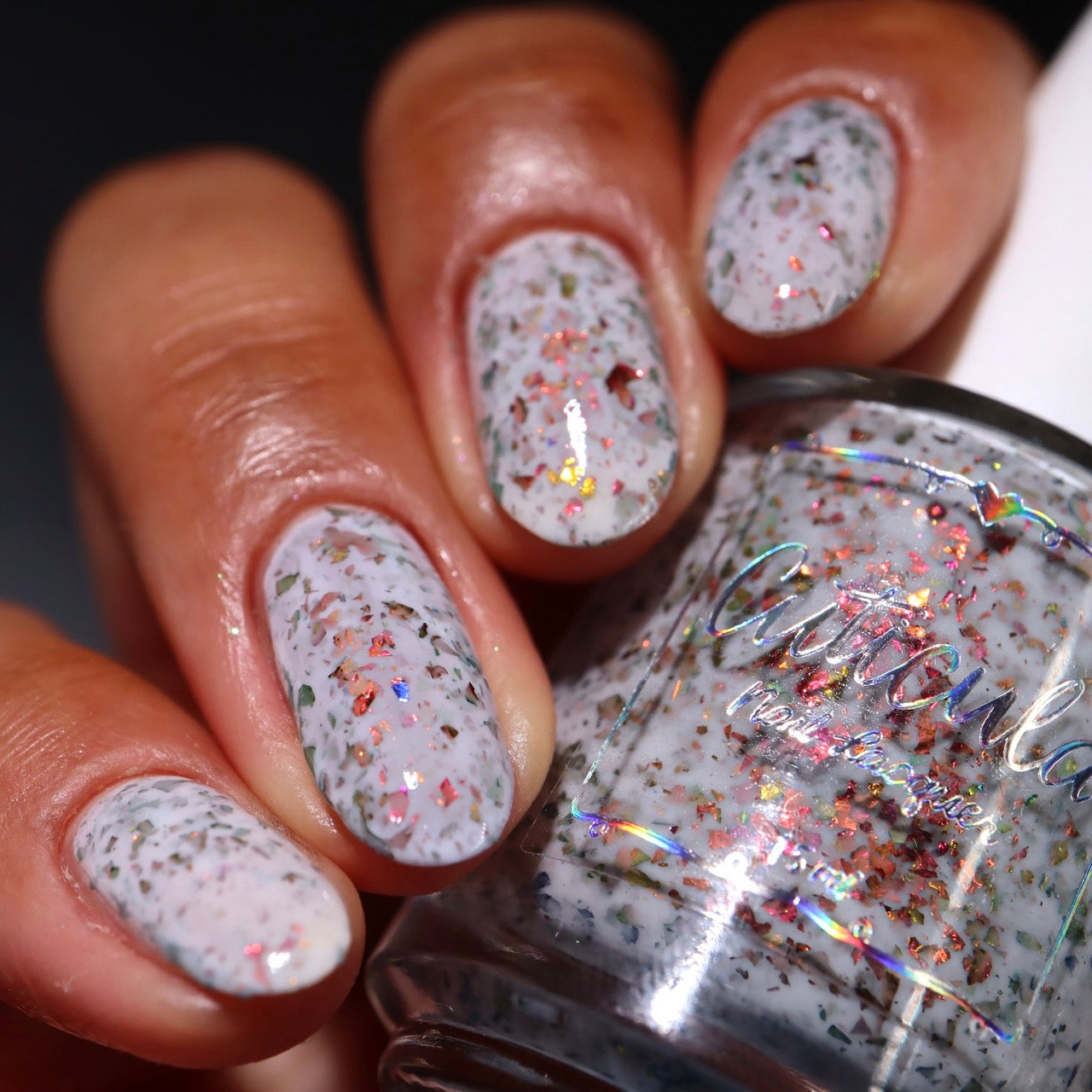 'Go with the Snow' A white crelly orange/red/gold/green shifting chrome flakes. Photos By: @caitlinswatches @lacqueredactyl @cheyennexodeborah @gaby_polish @mikkelz_nails @polishwithrae @50shadesofdip For best results, start with any of our available base coats and finish off your mani with any of our available top coats. This nail polish is 5 Free: Ingredients: Nitrocellulose, Ethyl Acetate, Butyl Acetate, Isopropyl Alcohol, Ethyl Alcohol, Triphenyl Phosphate, Propyl Acetate, n-Butyl Alcohol, Colorants.
