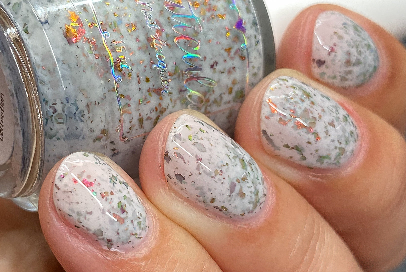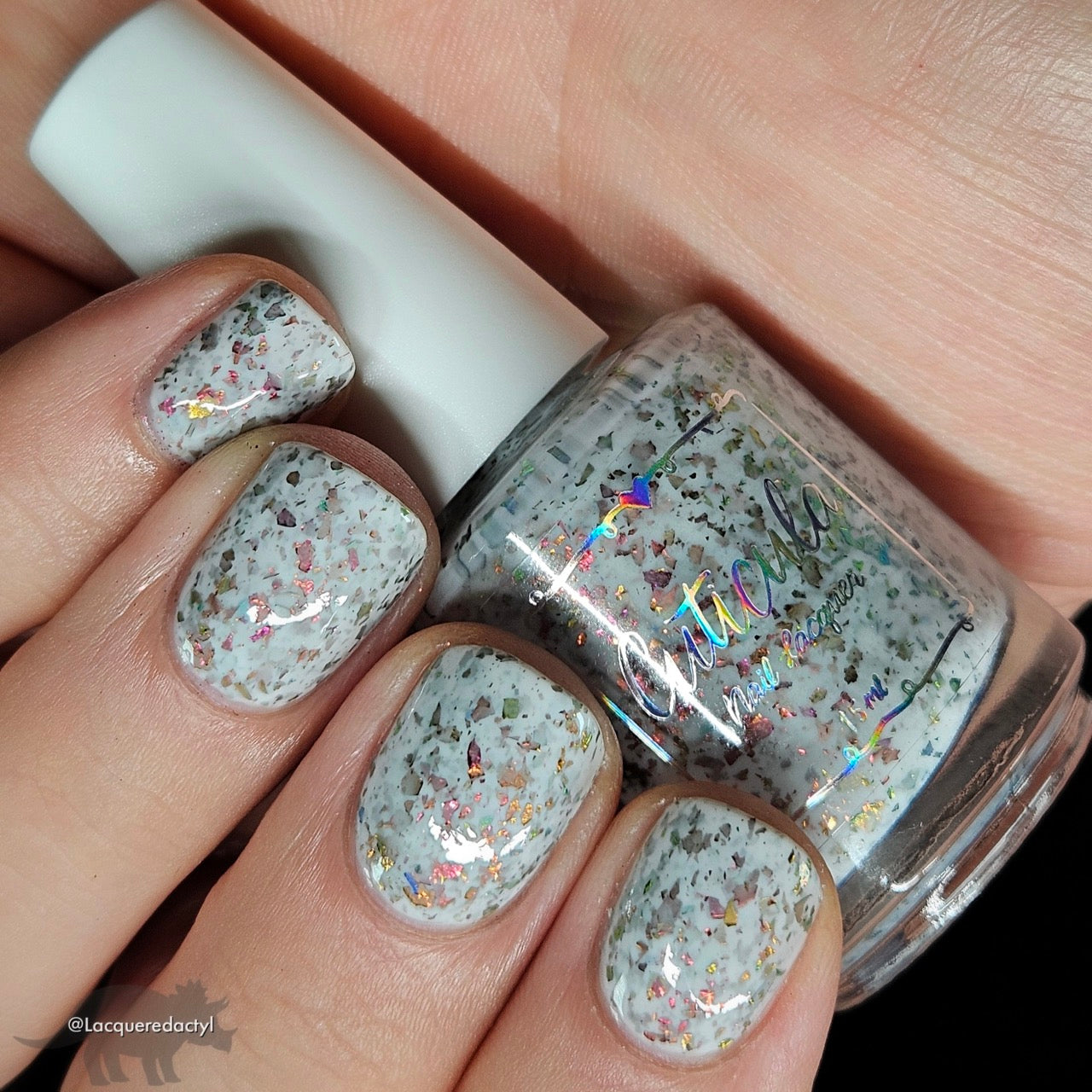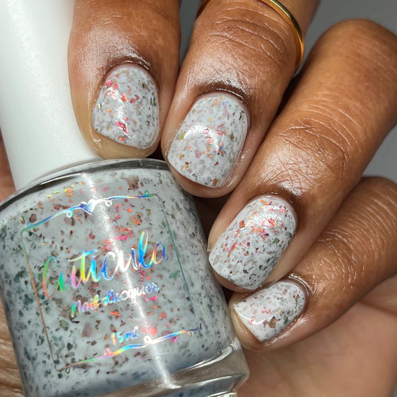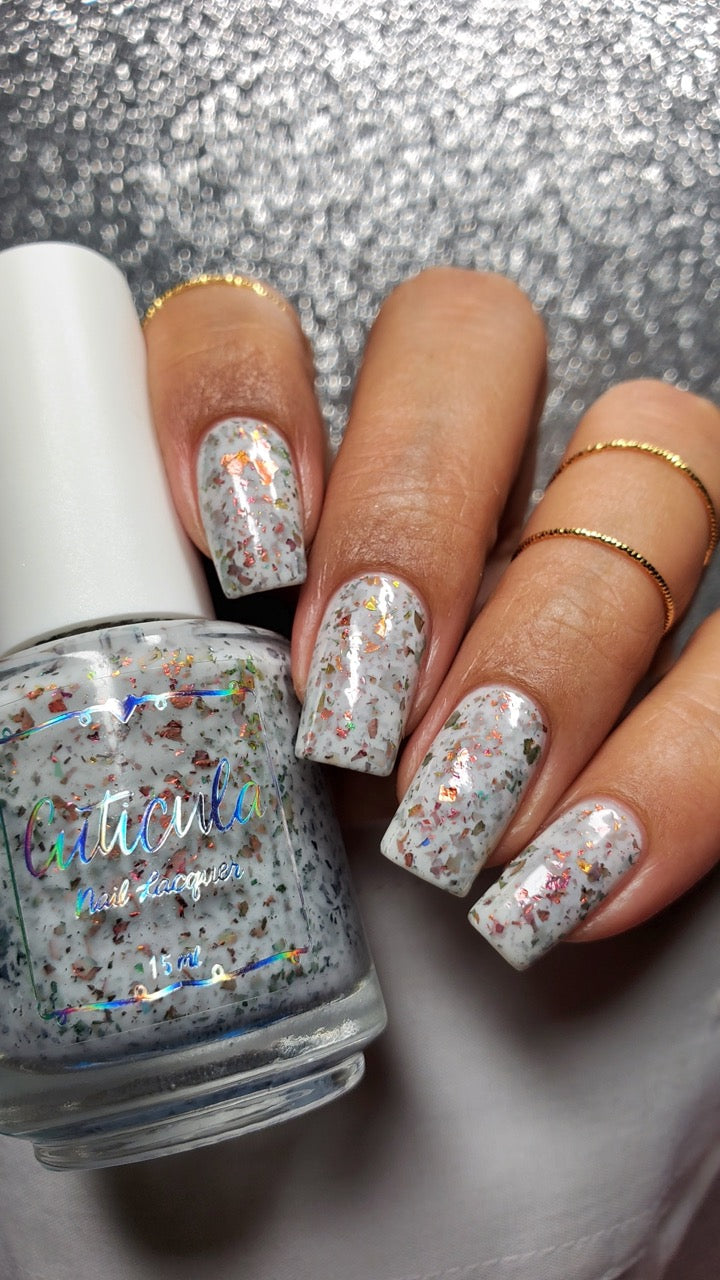 'Go with the Snow' A white crelly orange/red/gold/green shifting chrome flakes. Photos By: @caitlinswatches @lacqueredactyl @cheyennexodeborah @gaby_polish @mikkelz_nails @polishwithrae @50shadesofdip For best results, start with any of our available base coats and finish off your mani with any of our available top coats. This nail polish is 5 Free: Ingredients: Nitrocellulose, Ethyl Acetate, Butyl Acetate, Isopropyl Alcohol, Ethyl Alcohol, Triphenyl Phosphate, Propyl Acetate, n-Butyl Alcohol, Colorants.