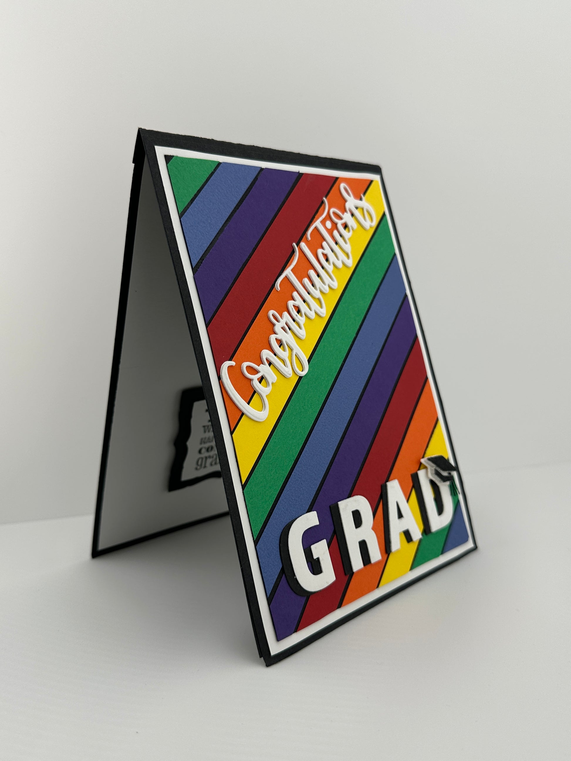 Graduation Card RAINBOW Easel Card with an envelope. Inside text "Yeah Way to go! Congrats Graduate".
