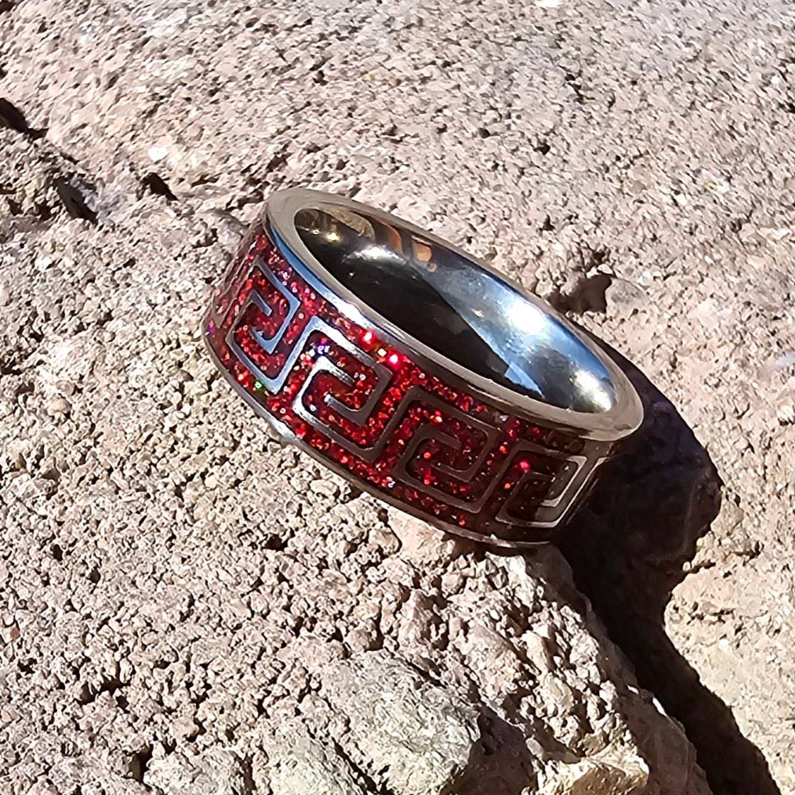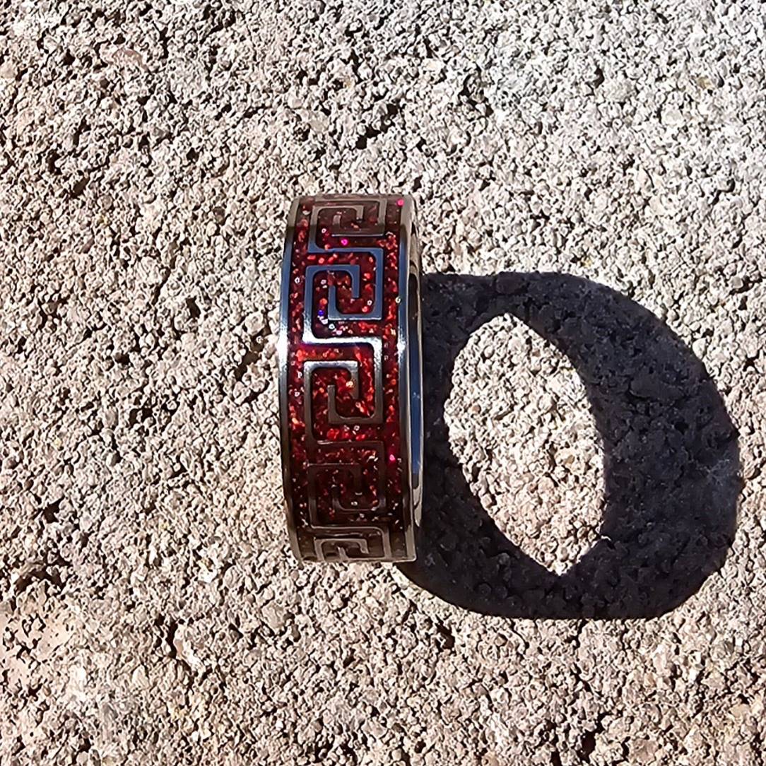 Greek design inlayed with red opals and diamond dust, size 9.5