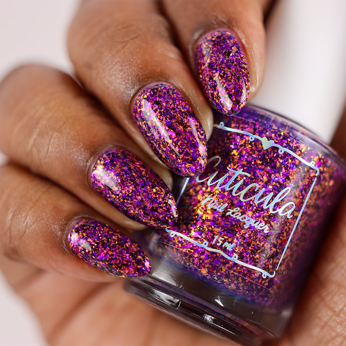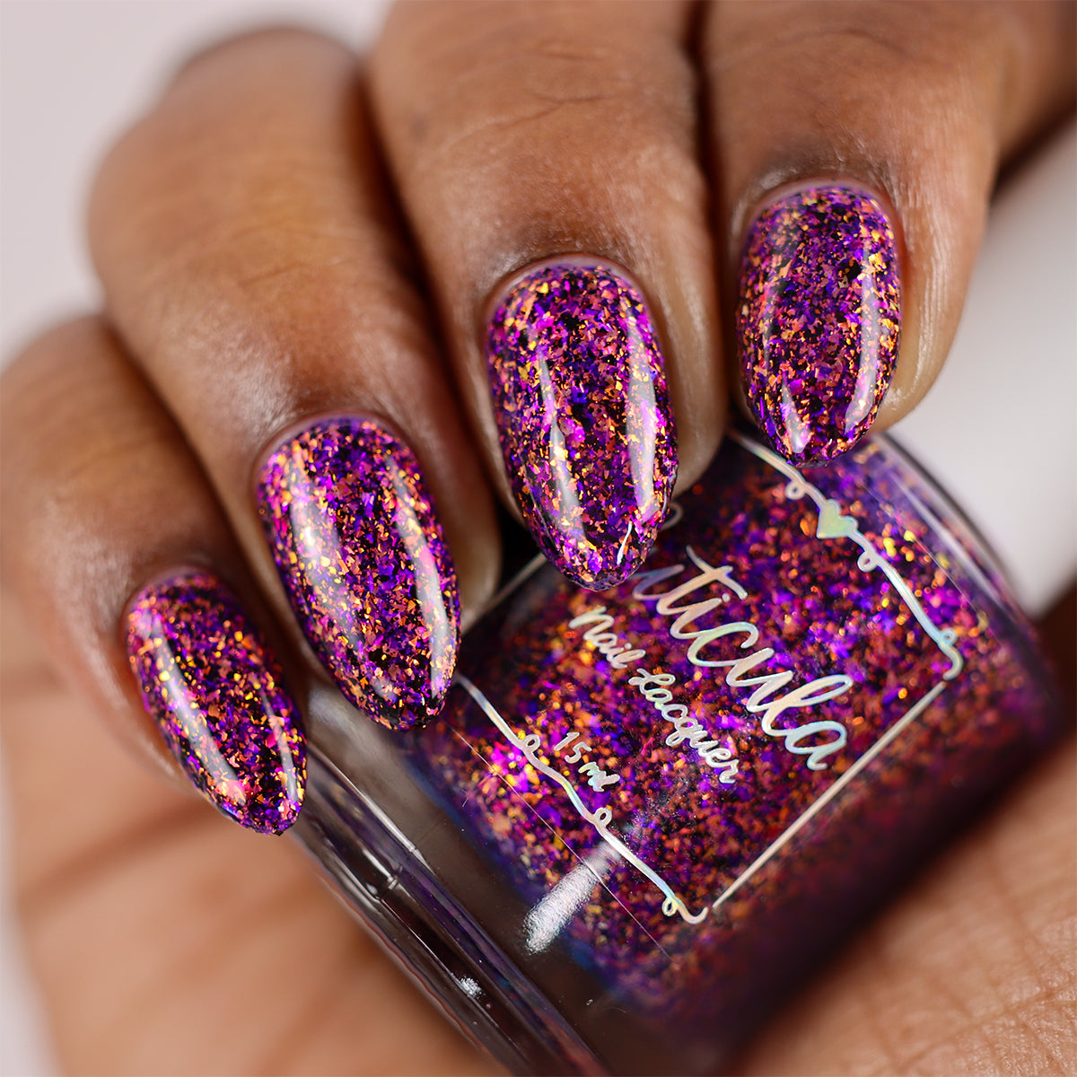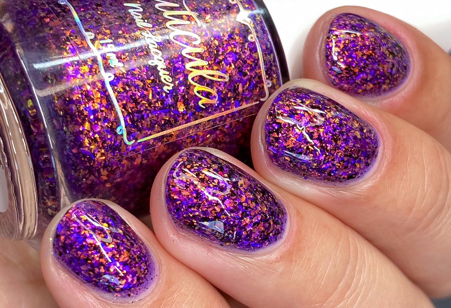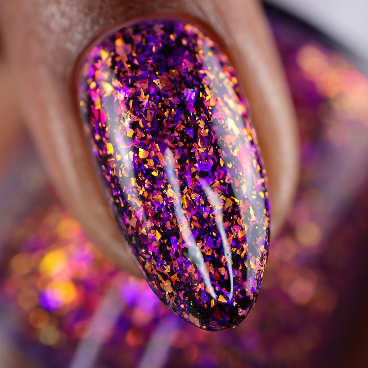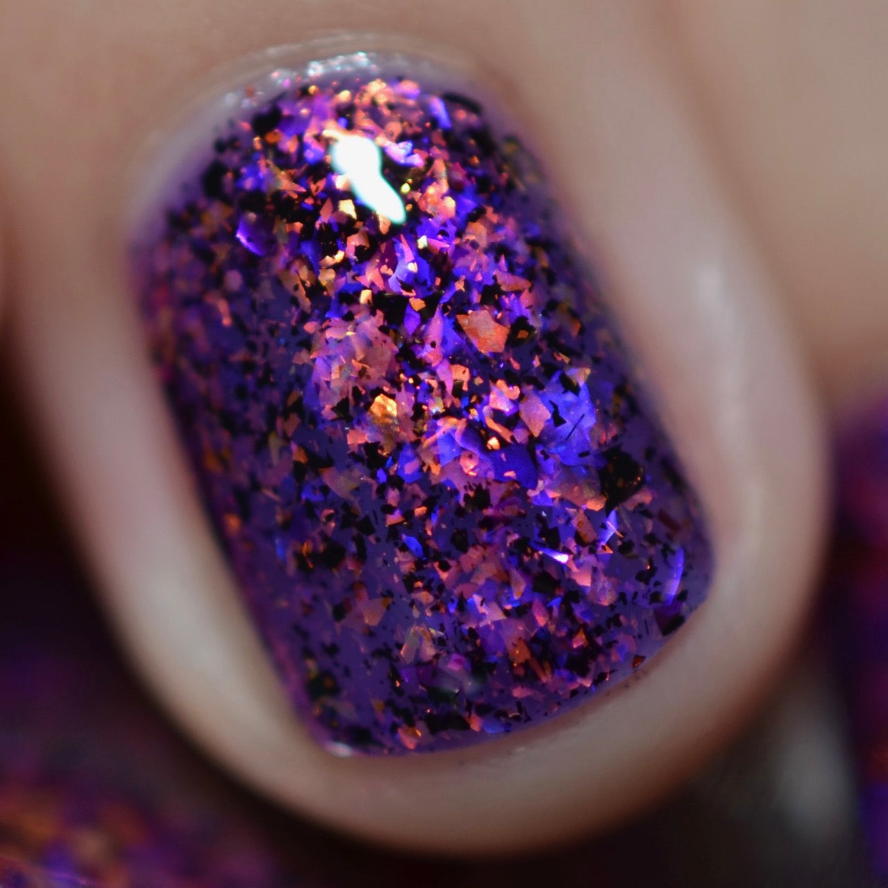 'Haunt Your Heart Out' a deep purple base with orange/gold, purple/blue shifting glass flakes, and black flakes. Photos By: @caitlinswatches @heeymercedes @doseoflolade @lacqueredactyl @lovemesomesparkle @gaby_polish @jenniferdufoe03 @polishwithrae @idream.of.lacquer @thepolishedmage For best results, start with any of our available base coats and finish off your mani with any of our available top coats. This nail polish is 5 Free: Ingredients: Nitrocellulose, Ethyl Acetate, Butyl Acetate, Isopropyl Alcohol, Ethyl Alcohol, Triphenyl Phosphate, Propyl Acetate, n-Butyl Alcohol, Colorants.