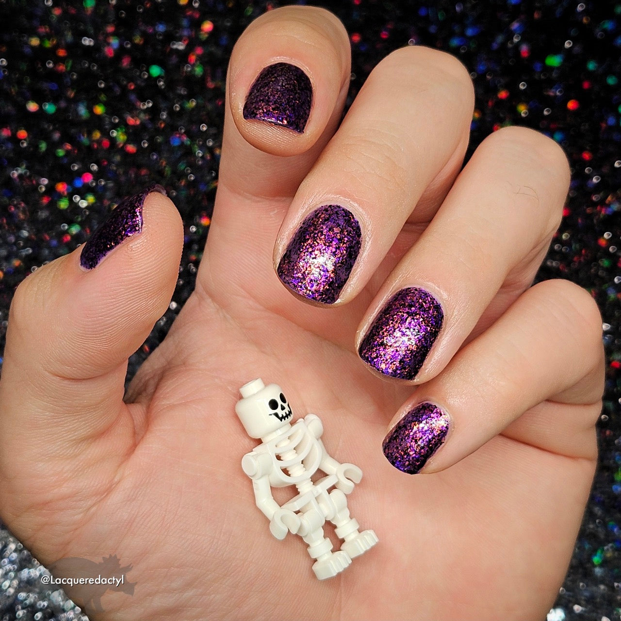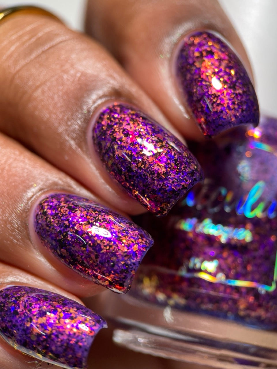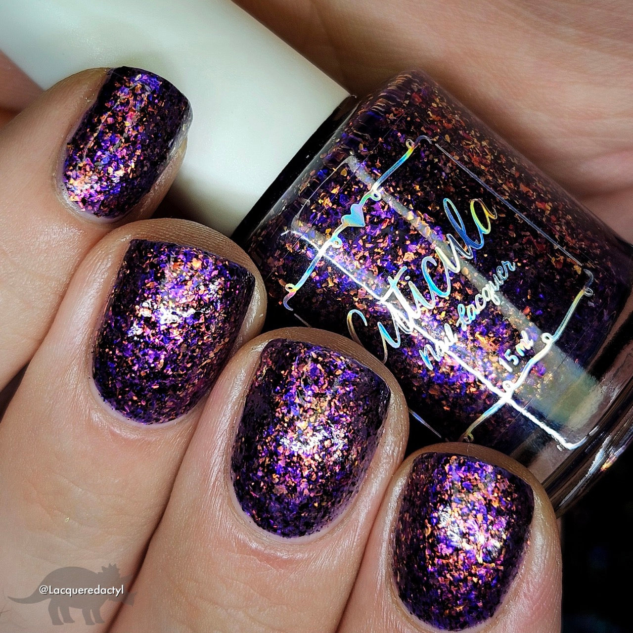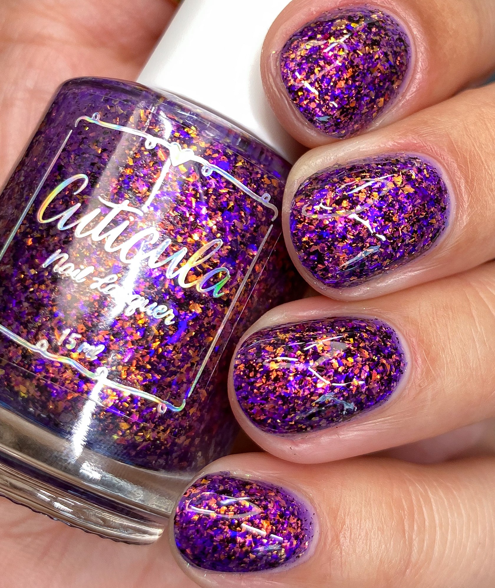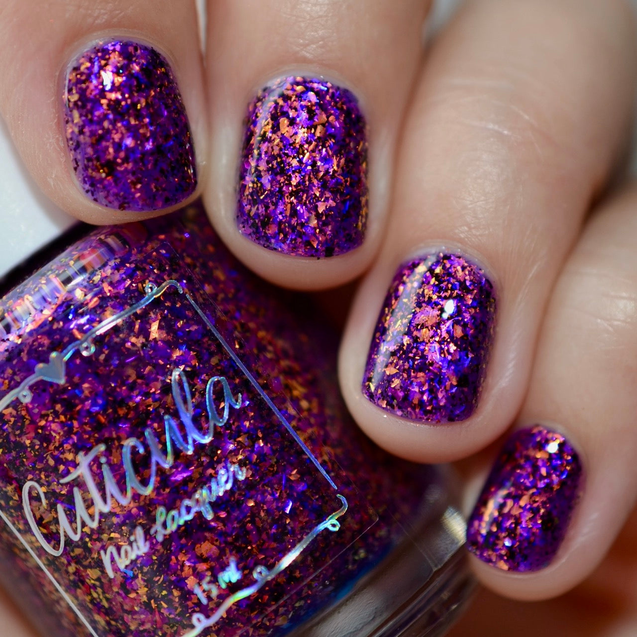 'Haunt Your Heart Out' a deep purple base with orange/gold, purple/blue shifting glass flakes, and black flakes. Photos By: @caitlinswatches @heeymercedes @doseoflolade @lacqueredactyl @lovemesomesparkle @gaby_polish @jenniferdufoe03 @polishwithrae @idream.of.lacquer @thepolishedmage For best results, start with any of our available base coats and finish off your mani with any of our available top coats. This nail polish is 5 Free: Ingredients: Nitrocellulose, Ethyl Acetate, Butyl Acetate, Isopropyl Alcohol, Ethyl Alcohol, Triphenyl Phosphate, Propyl Acetate, n-Butyl Alcohol, Colorants.